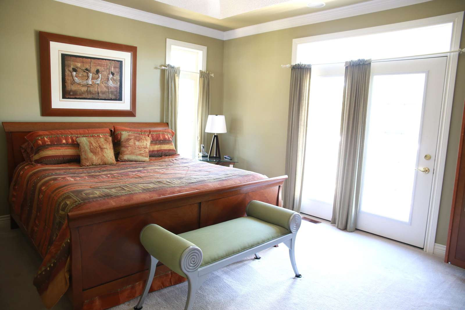 Bedroom 1- Primary King with ensuite, two-sided wood-burning fireplace and walkout to deck
