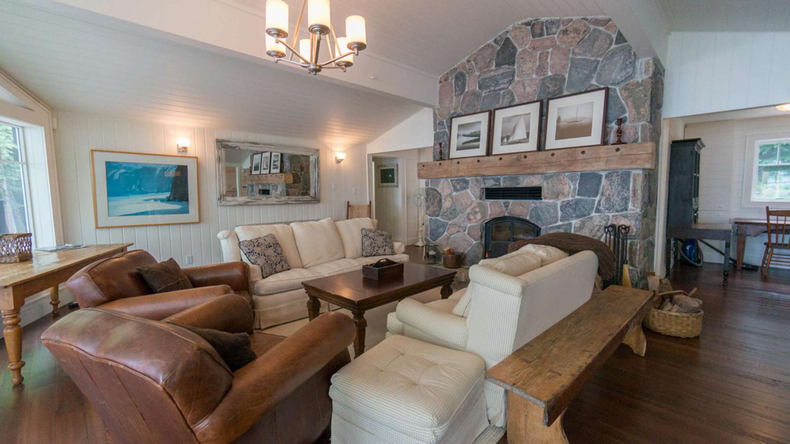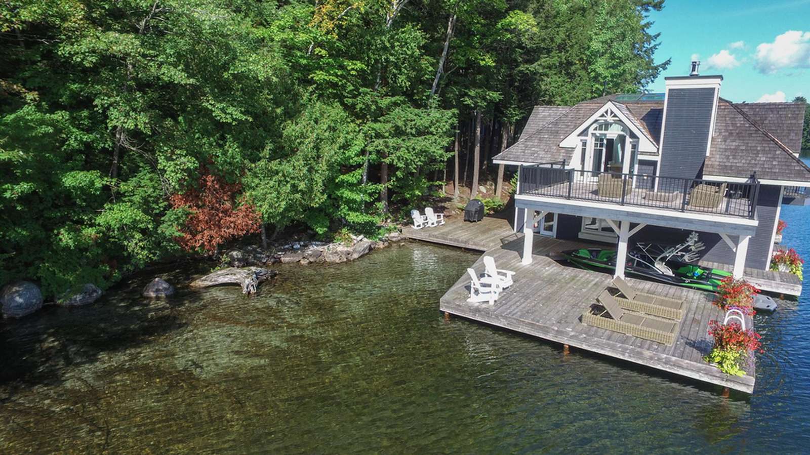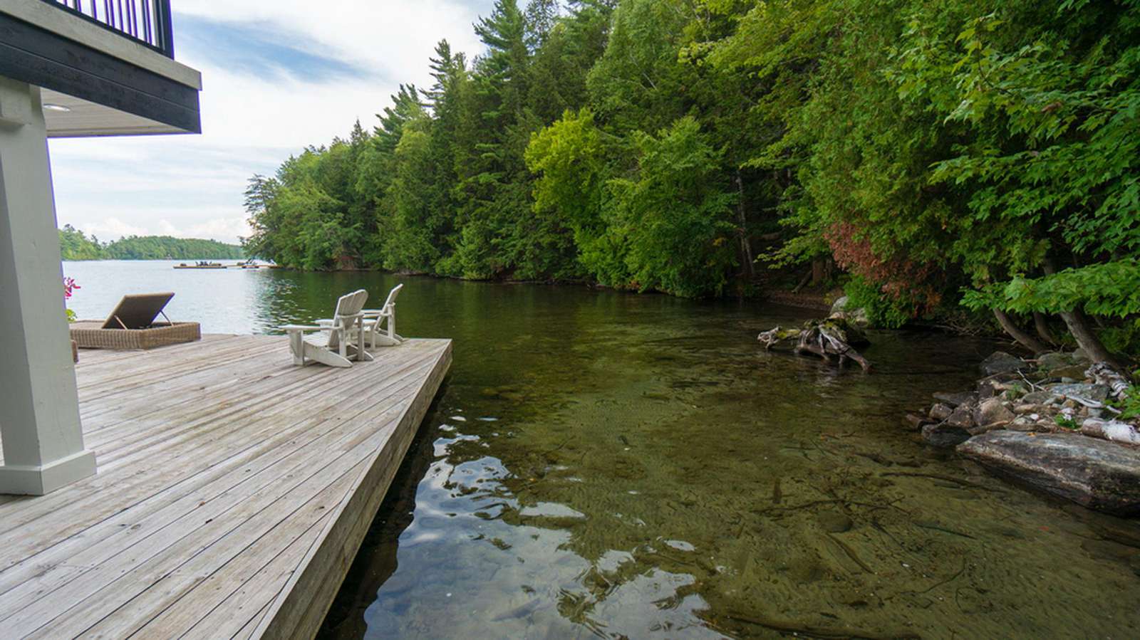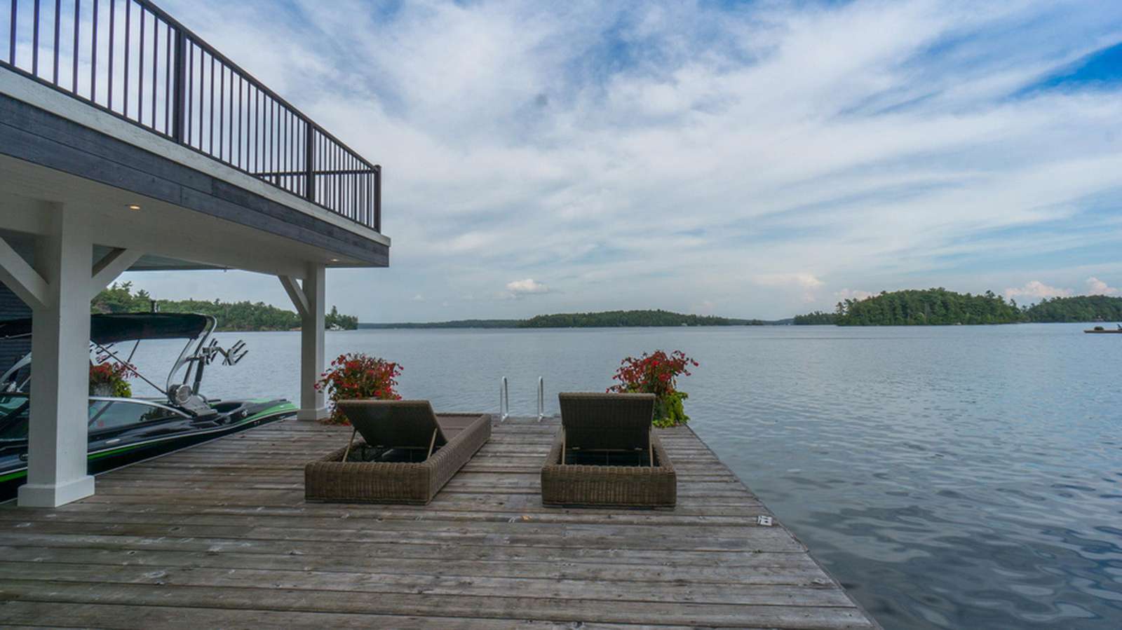 PLAYFAIR ISLAND's main cottage is surrounded by towering trees, giving you beautiful lake views and privacy with a gradual walk down steps to the boathouse and waterfront. It is an ideal landscape for guests of all ages to enjoy with ease. The property has 492' of waterfront, multiple outdoor seating areas at the boathouse dock to lounge and catch the sun throughout the day. Off the main floor of the cottage is the wrap-around cottage deck. From the lower level, walk out to the stone encased fire-pit with surrounding chairs. The dock features ample seating for the whole group to assemble and enjoy the all-day sun, including an outdoor living room set and umbrella on the upper-level boathouse deck, as well as a bbq, four Muskoka chairs and two loungers at the dock's edge. The 2-slip boathouse includes an upper-level kitchenette with a sink, mini-fridge, wine fridge, and portable electric burner, providing easy access to snacks and drinks throughout the day. Perfect swimming conditions with a sandy walk-in at the beach and deep water at the end of the dock.