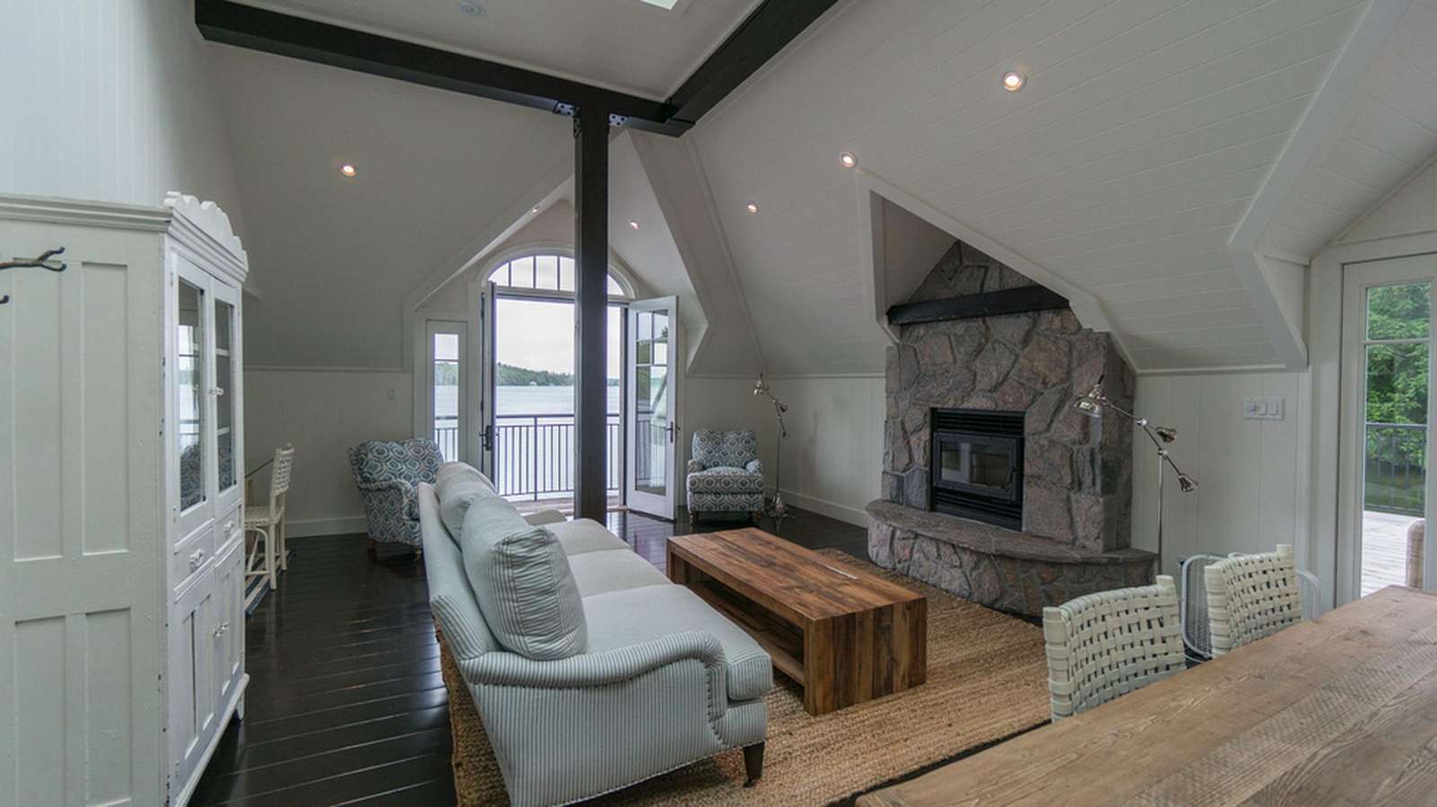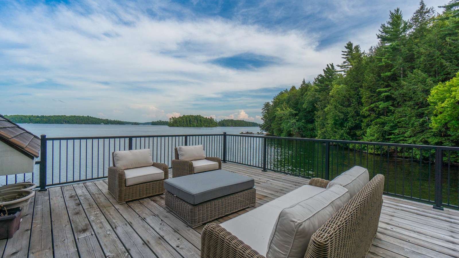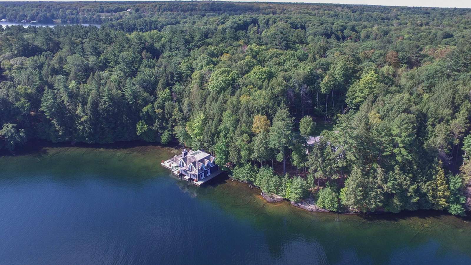 PLAYFAIR ISLAND's main cottage is surrounded by towering trees, giving you beautiful lake views and privacy with a gradual walk down steps to the boathouse and waterfront. It is an ideal landscape for guests of all ages to enjoy with ease. The property has 492' of waterfront, multiple outdoor seating areas at the boathouse dock to lounge and catch the sun throughout the day. Off the main floor of the cottage is the wrap-around cottage deck. From the lower level, walk out to the stone encased fire-pit with surrounding chairs. The dock features ample seating for the whole group to assemble and enjoy the all-day sun, including an outdoor living room set and umbrella on the upper-level boathouse deck, as well as a bbq, four Muskoka chairs and two loungers at the dock's edge. The 2-slip boathouse includes an upper-level kitchenette with a sink, mini-fridge, wine fridge, and portable electric burner, providing easy access to snacks and drinks throughout the day. Perfect swimming conditions with a sandy walk-in at the beach and deep water at the end of the dock.