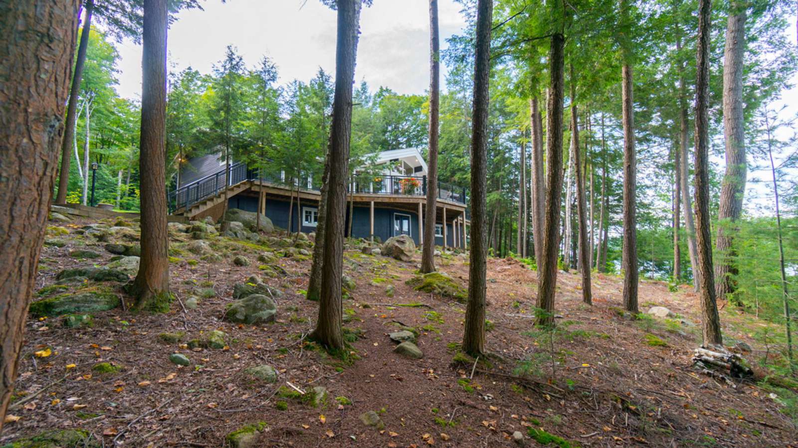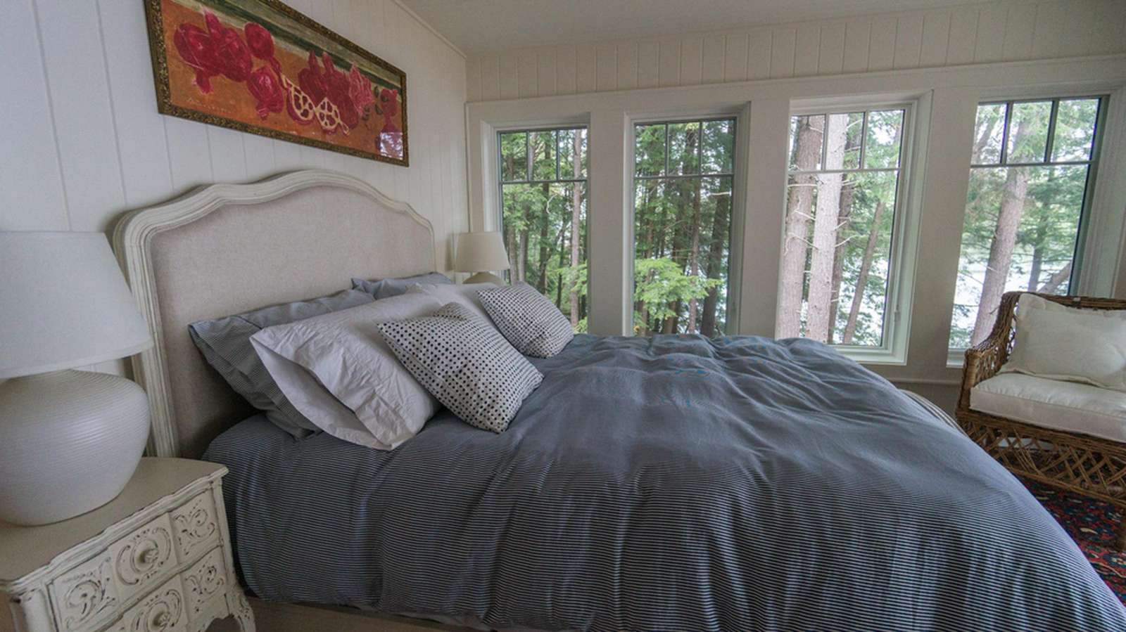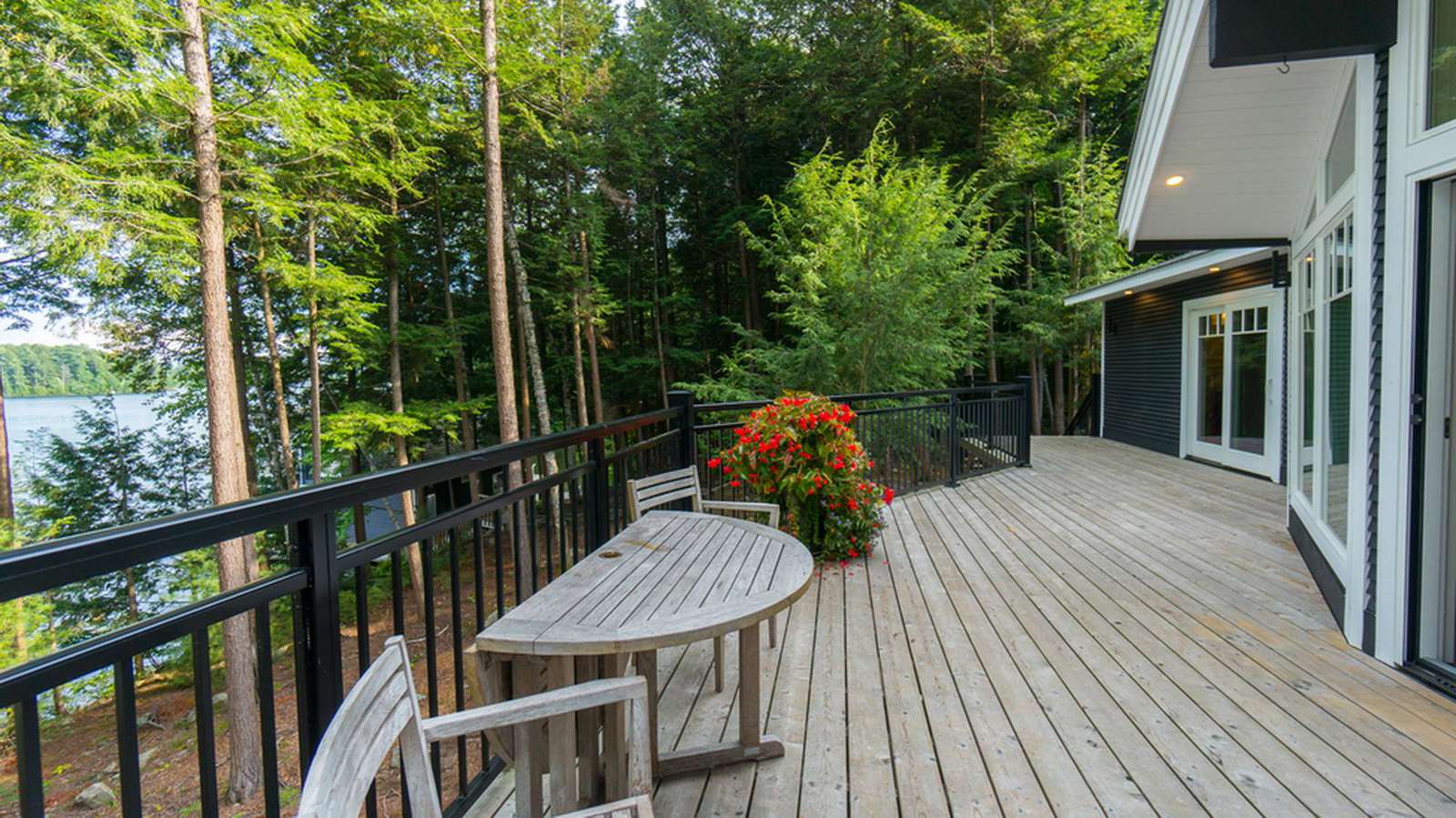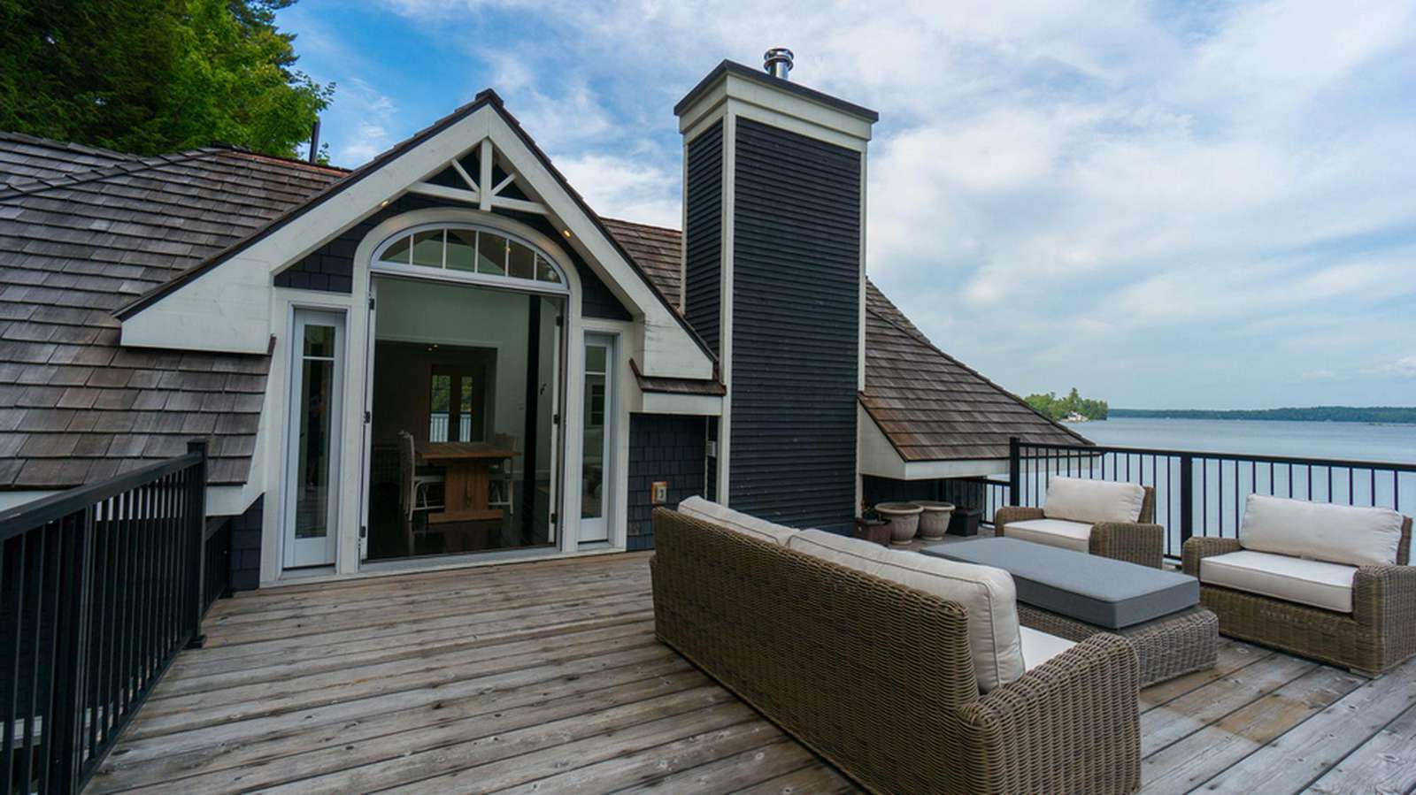 PLAYFAIR ISLAND's main cottage is surrounded by towering trees, giving you beautiful lake views and privacy with a gradual walk down steps to the boathouse and waterfront. It is an ideal landscape for guests of all ages to enjoy with ease. The property has 492' of waterfront, multiple outdoor seating areas at the boathouse dock to lounge and catch the sun throughout the day. Off the main floor of the cottage is the wrap-around cottage deck. From the lower level, walk out to the stone encased fire-pit with surrounding chairs. The dock features ample seating for the whole group to assemble and enjoy the all-day sun, including an outdoor living room set and umbrella on the upper-level boathouse deck, as well as a bbq, four Muskoka chairs and two loungers at the dock's edge. The 2-slip boathouse includes an upper-level kitchenette with a sink, mini-fridge, wine fridge, and portable electric burner, providing easy access to snacks and drinks throughout the day. Perfect swimming conditions with a sandy walk-in at the beach and deep water at the end of the dock.