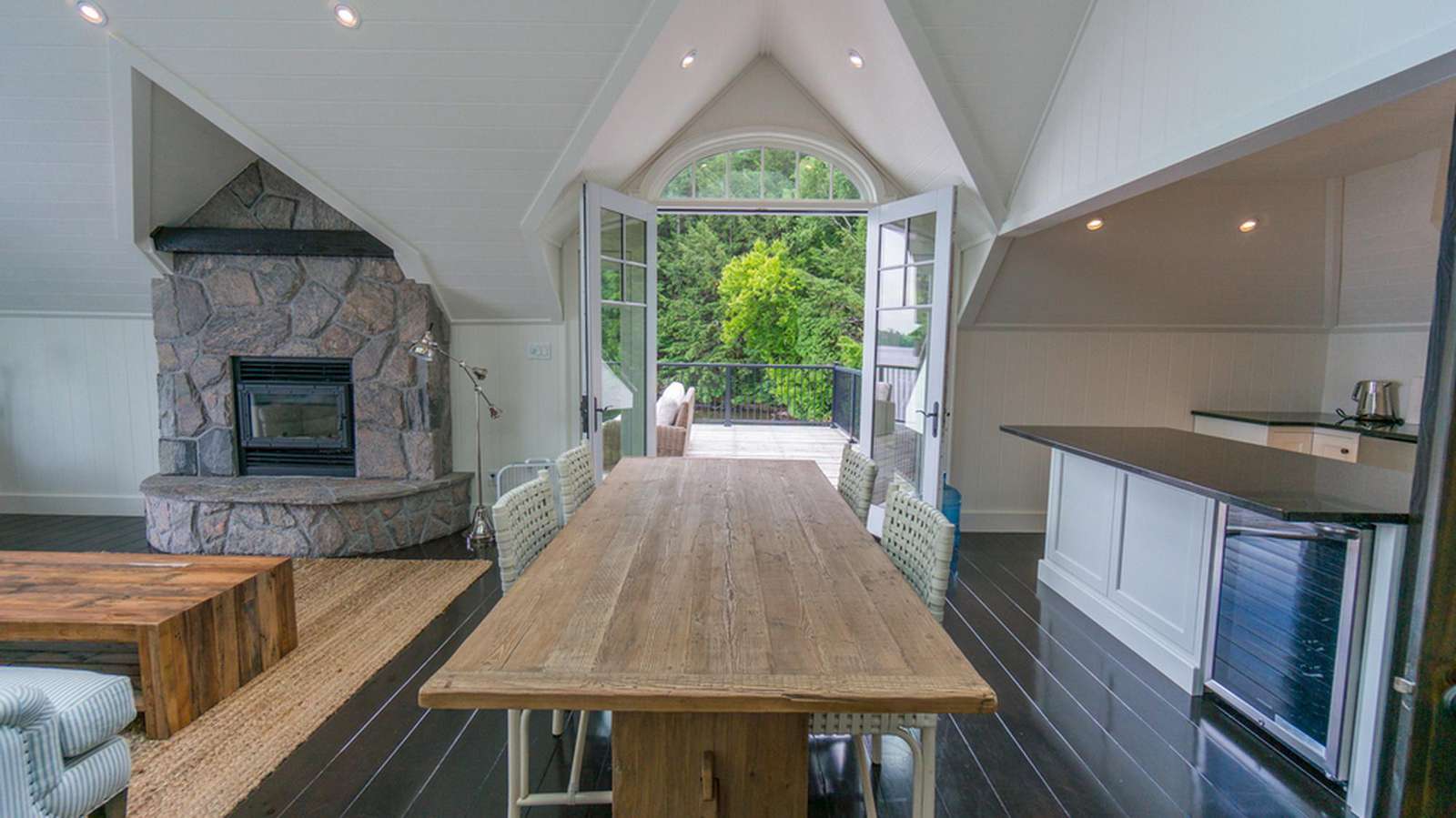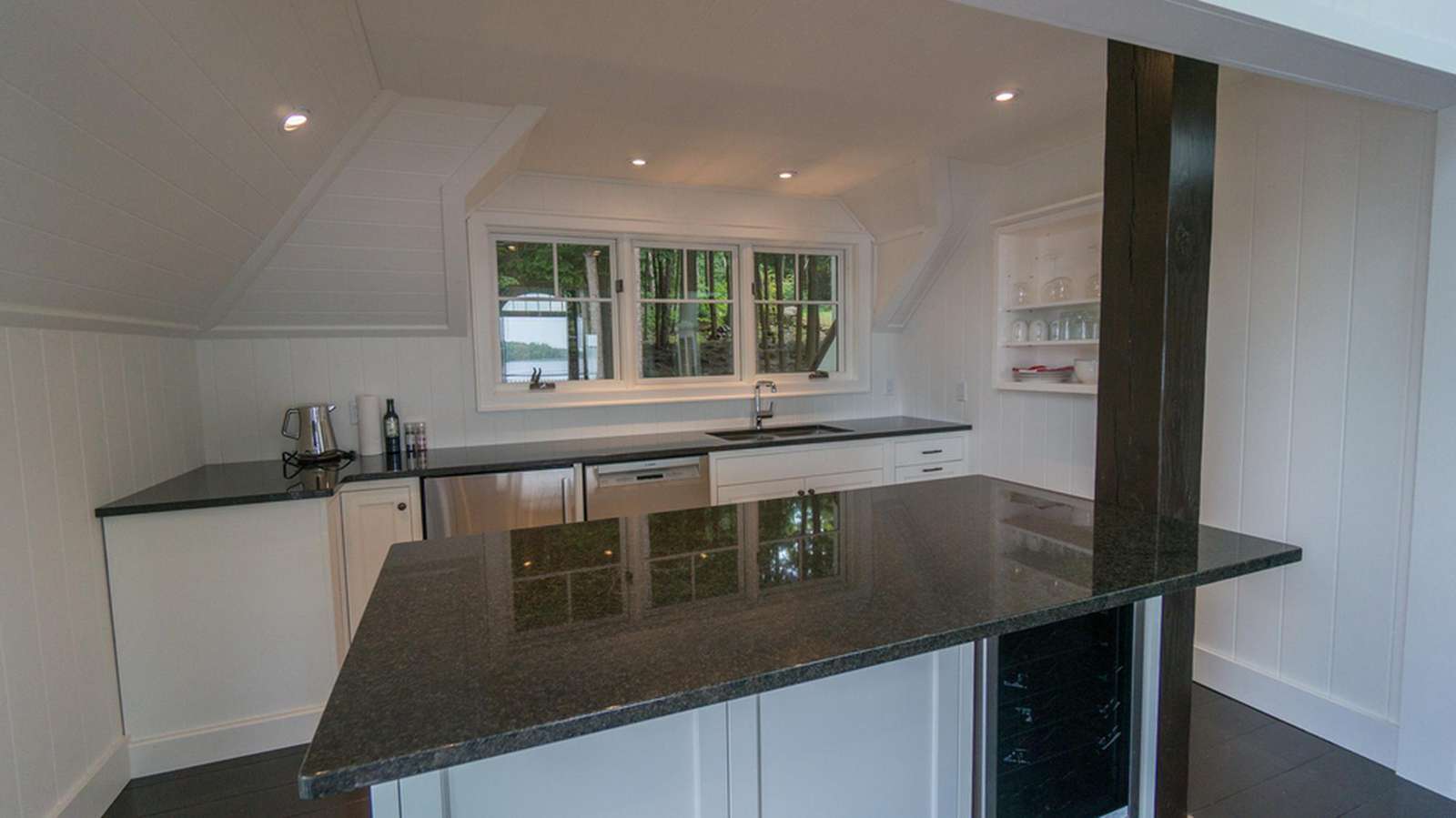 Kitchenette with mini-fridge, wine fridge, sink and a high efficiency wood fireplace. The lower level of boathouse contains a sauna