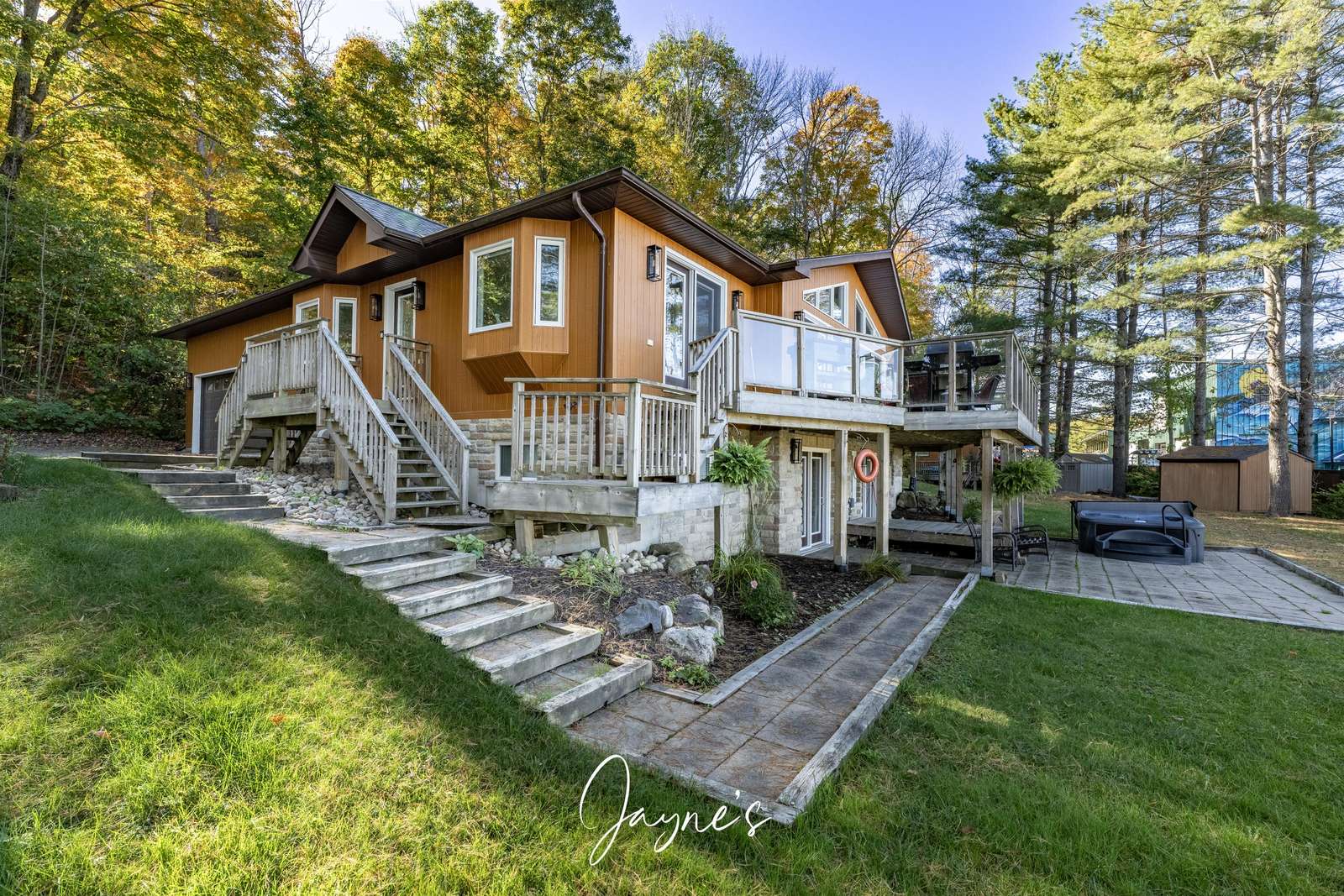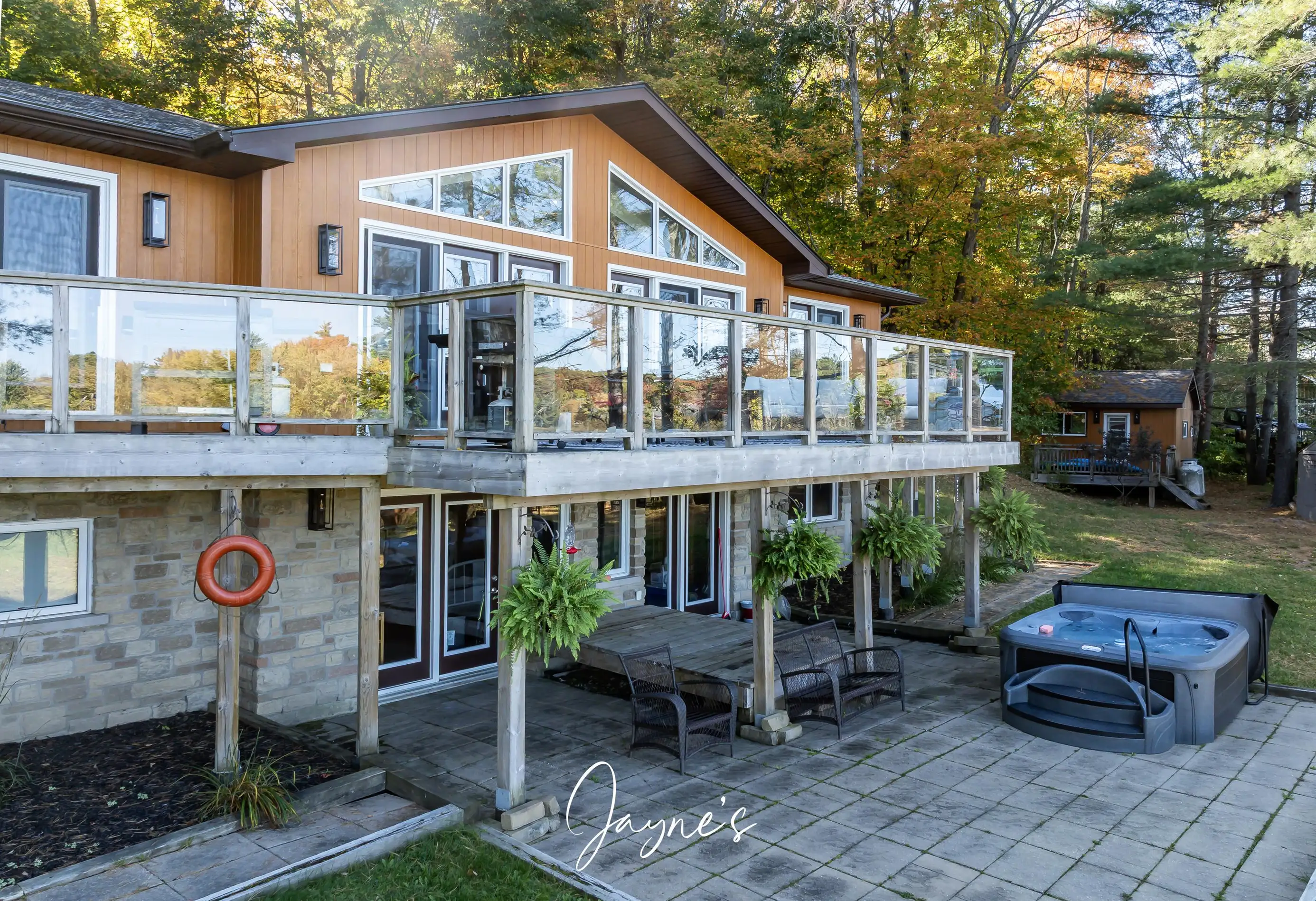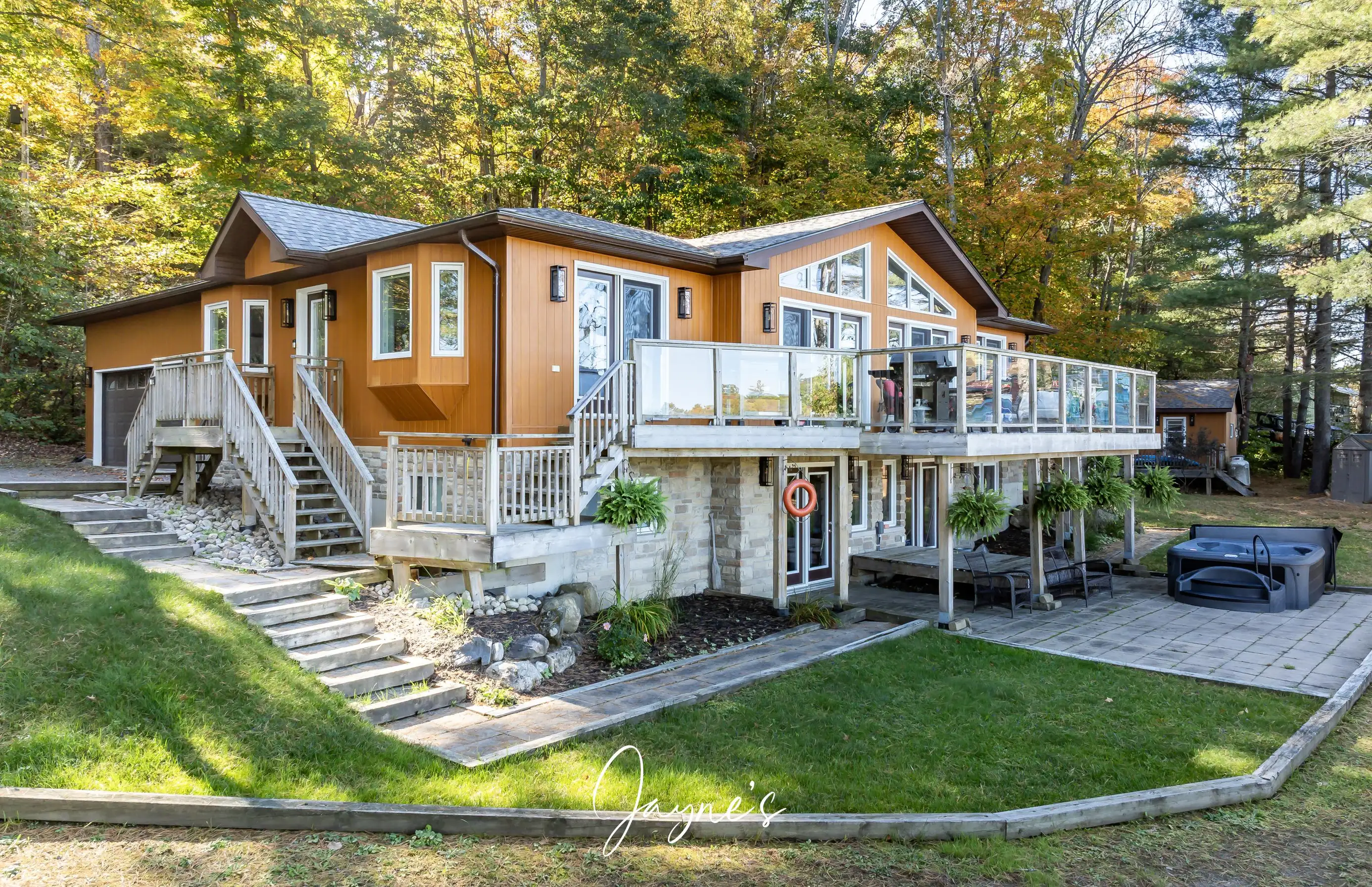RAY OF MUSKOKA SUN This inviting cottage offers a perfect lakeside retreat with 3 bedrooms and 2 bathrooms, featuring a wrap-around deck for sunbathing and a shaded lower level patio, ideal for relaxing outdoors. The level land extends to the water's edge with a shallow sandy entry, perfect for swimming, while the deep water off the dock provides excellent boating opportunities. Guests can unwind by the firepit with ample seating or enjoy a soothing soak in the hot tub on the patio, making it an ideal spot for both active days and restful nights.