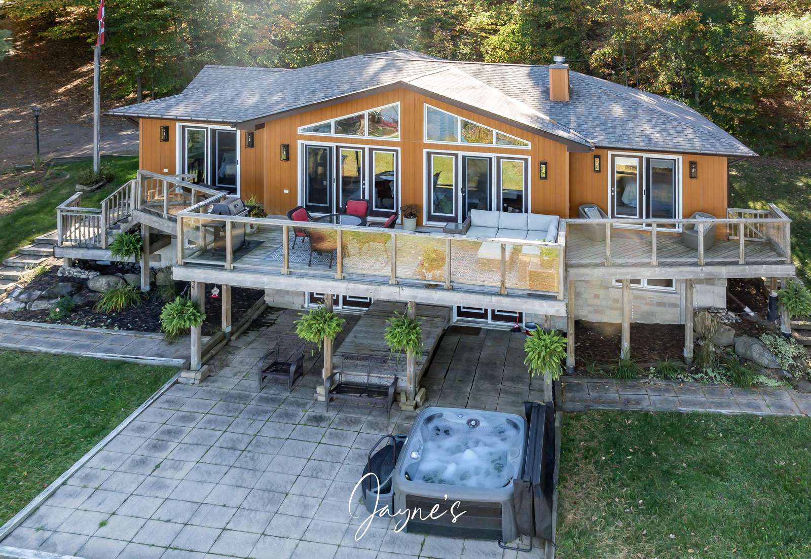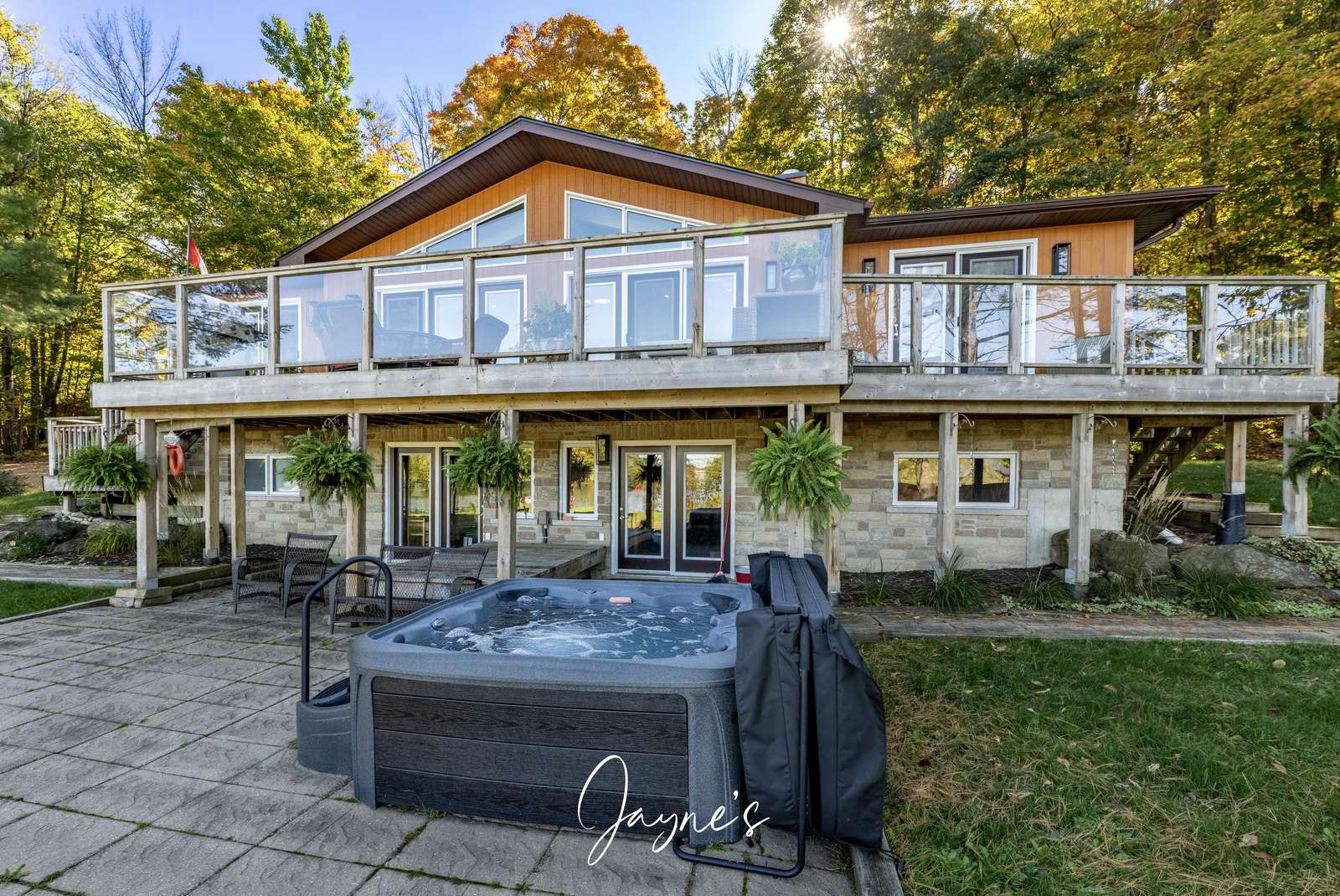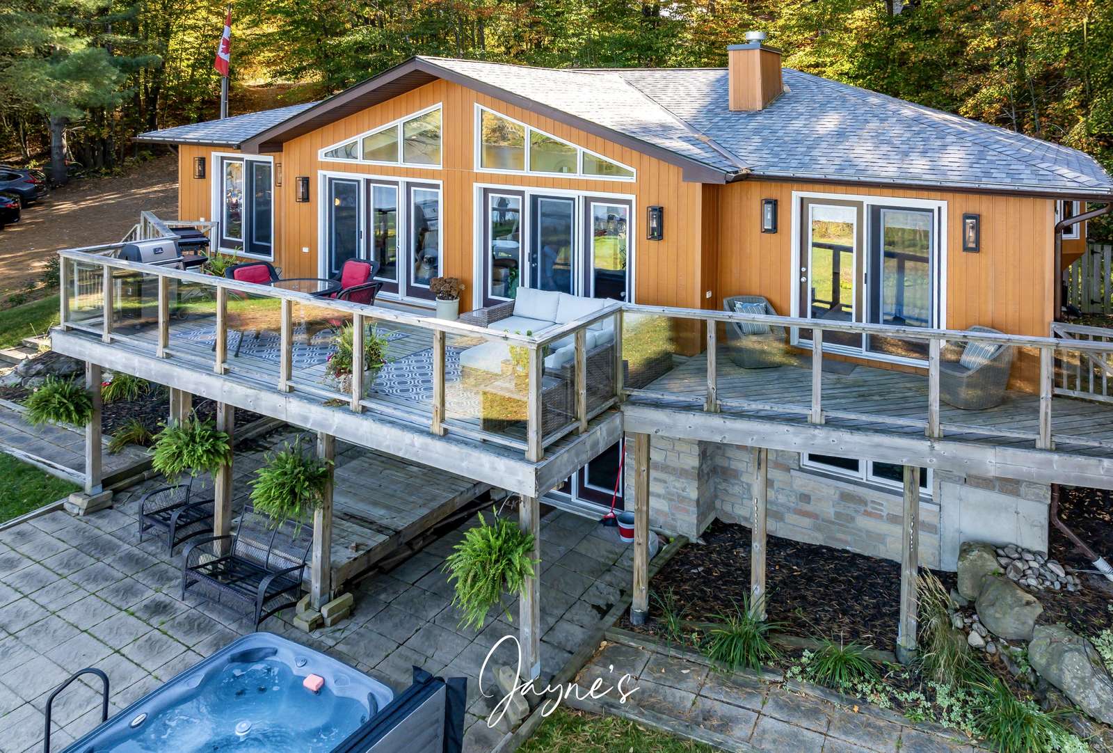 RAY OF MUSKOKA SUN This inviting cottage offers a perfect lakeside retreat with 3 bedrooms and 2 bathrooms, featuring a wrap-around deck for sunbathing and a shaded lower level patio, ideal for relaxing outdoors. The level land extends to the water's edge with a shallow sandy entry, perfect for swimming, while the deep water off the dock provides excellent boating opportunities. Guests can unwind by the firepit with ample seating or enjoy a soothing soak in the hot tub on the patio, making it an ideal spot for both active days and restful nights.