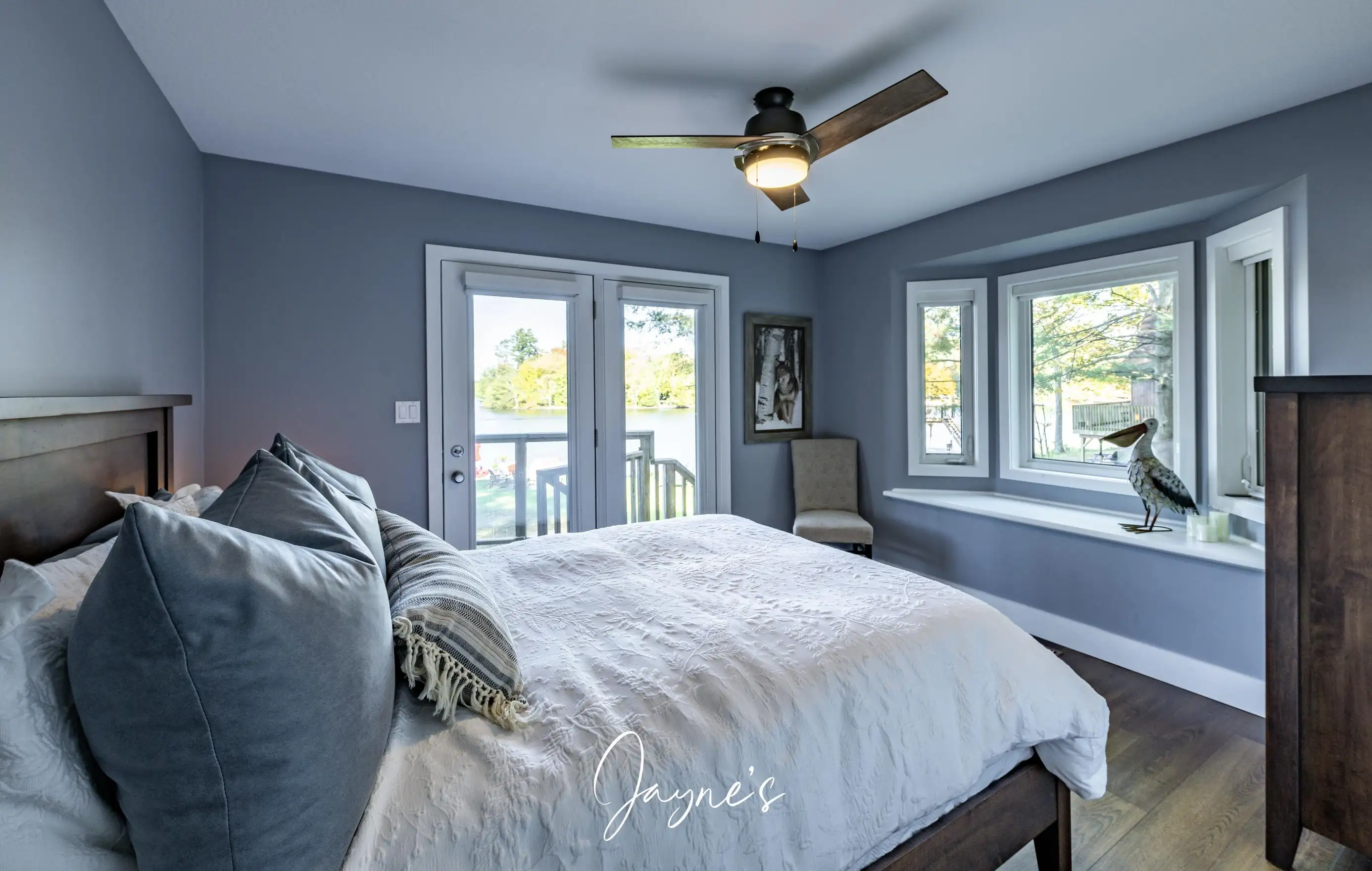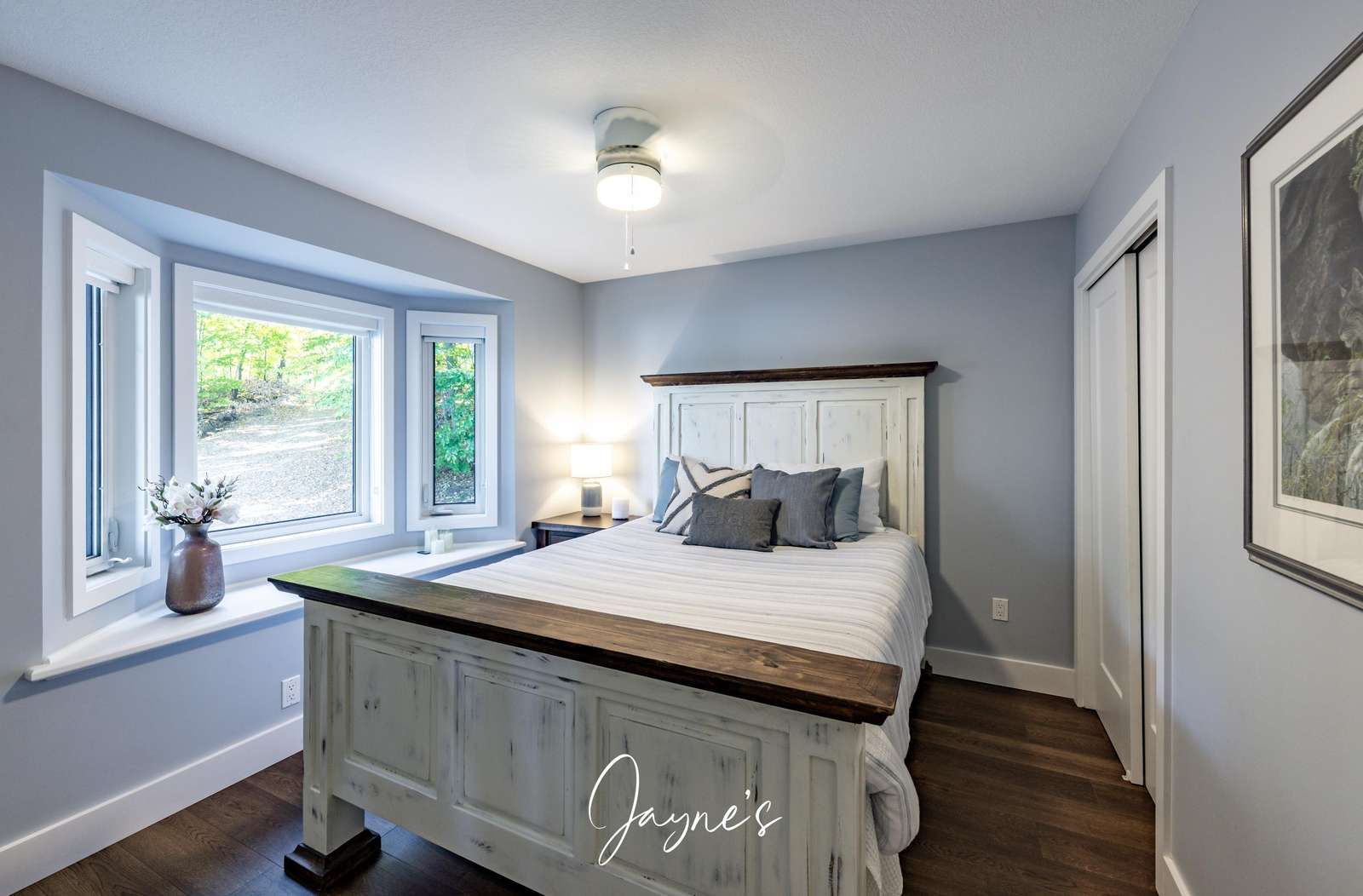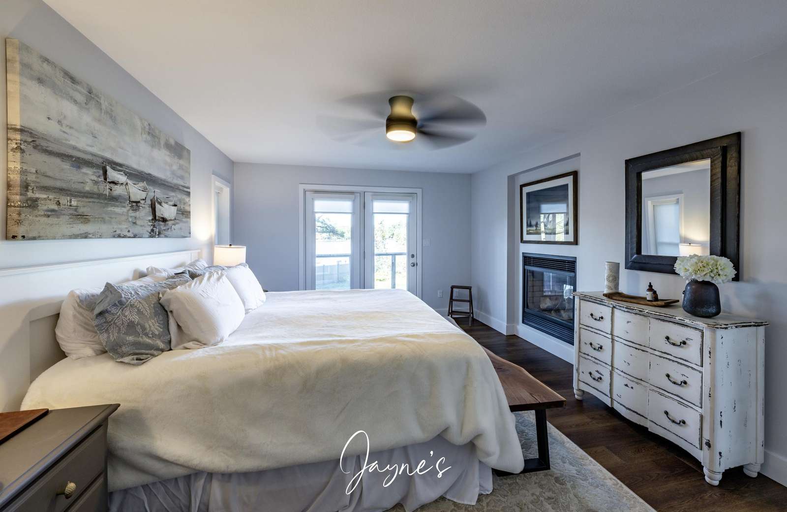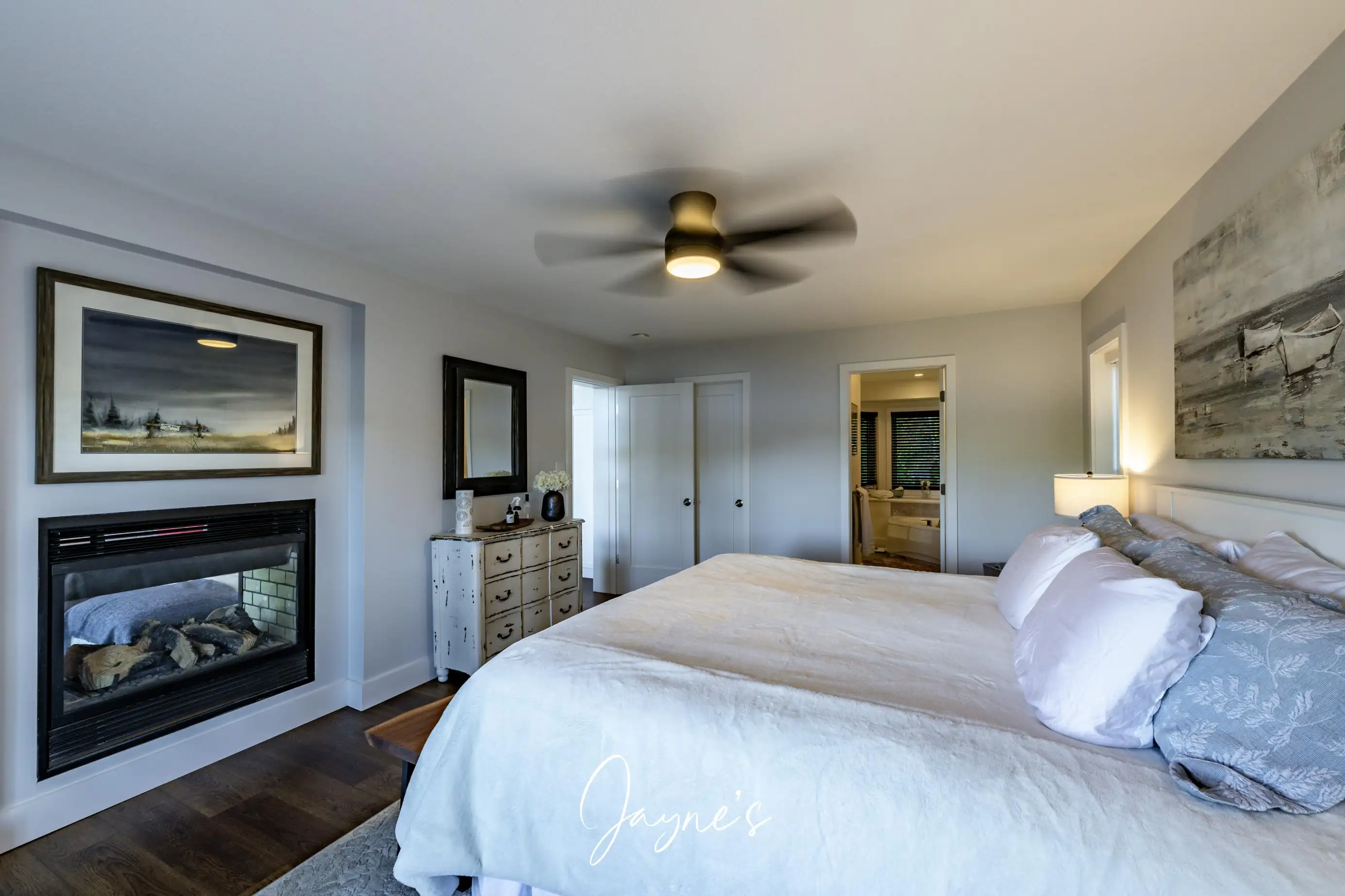 Bedroom 1 - King (Primary) with ensuite, gas fireplace, walkout to deck