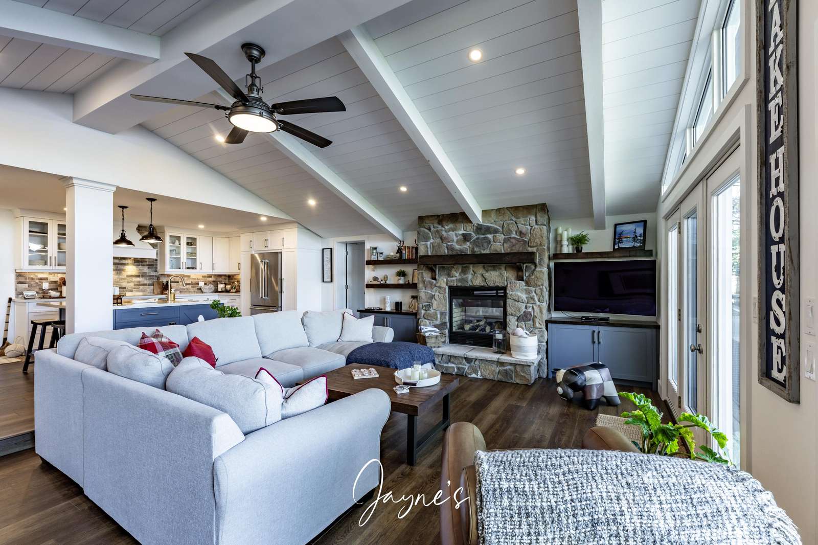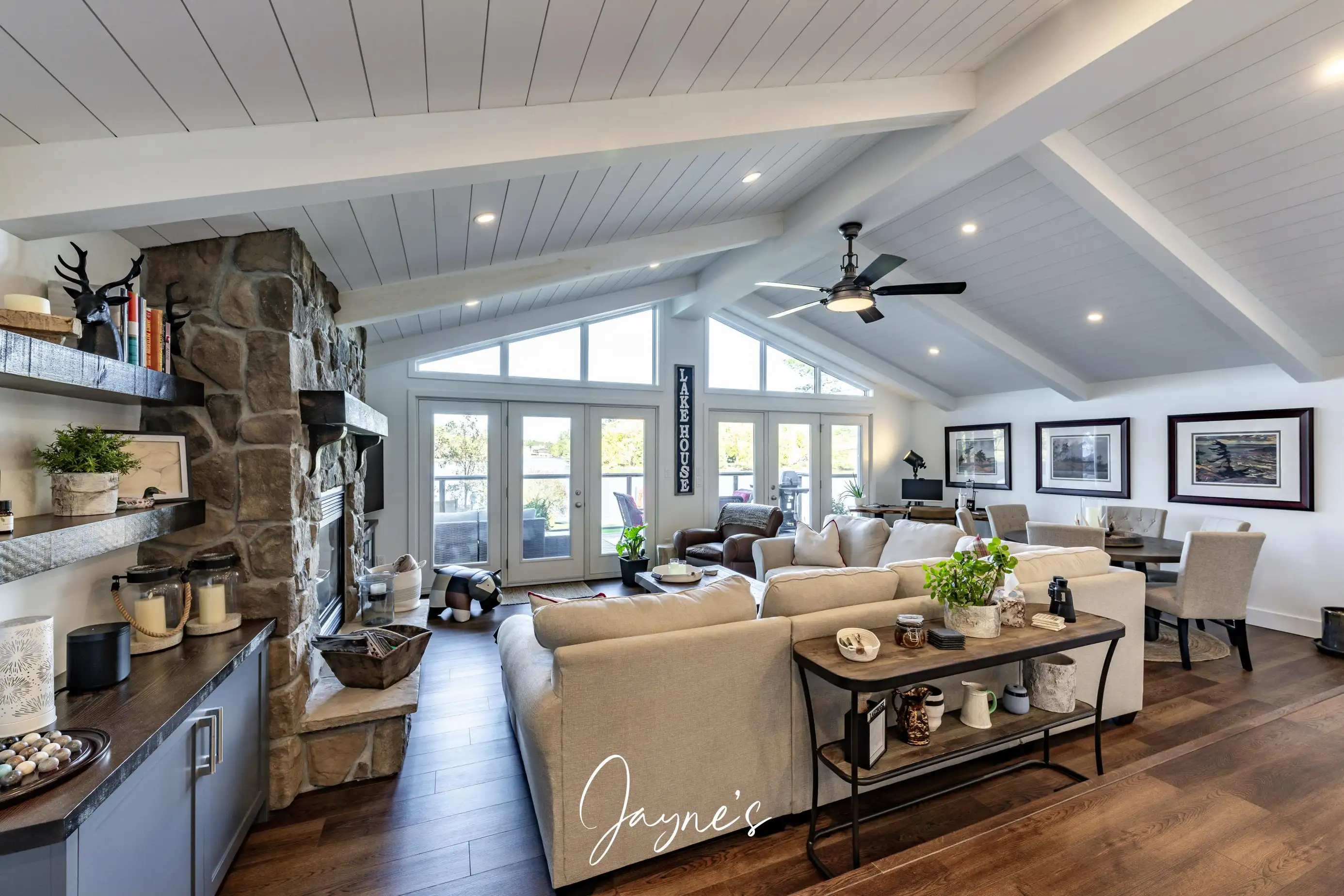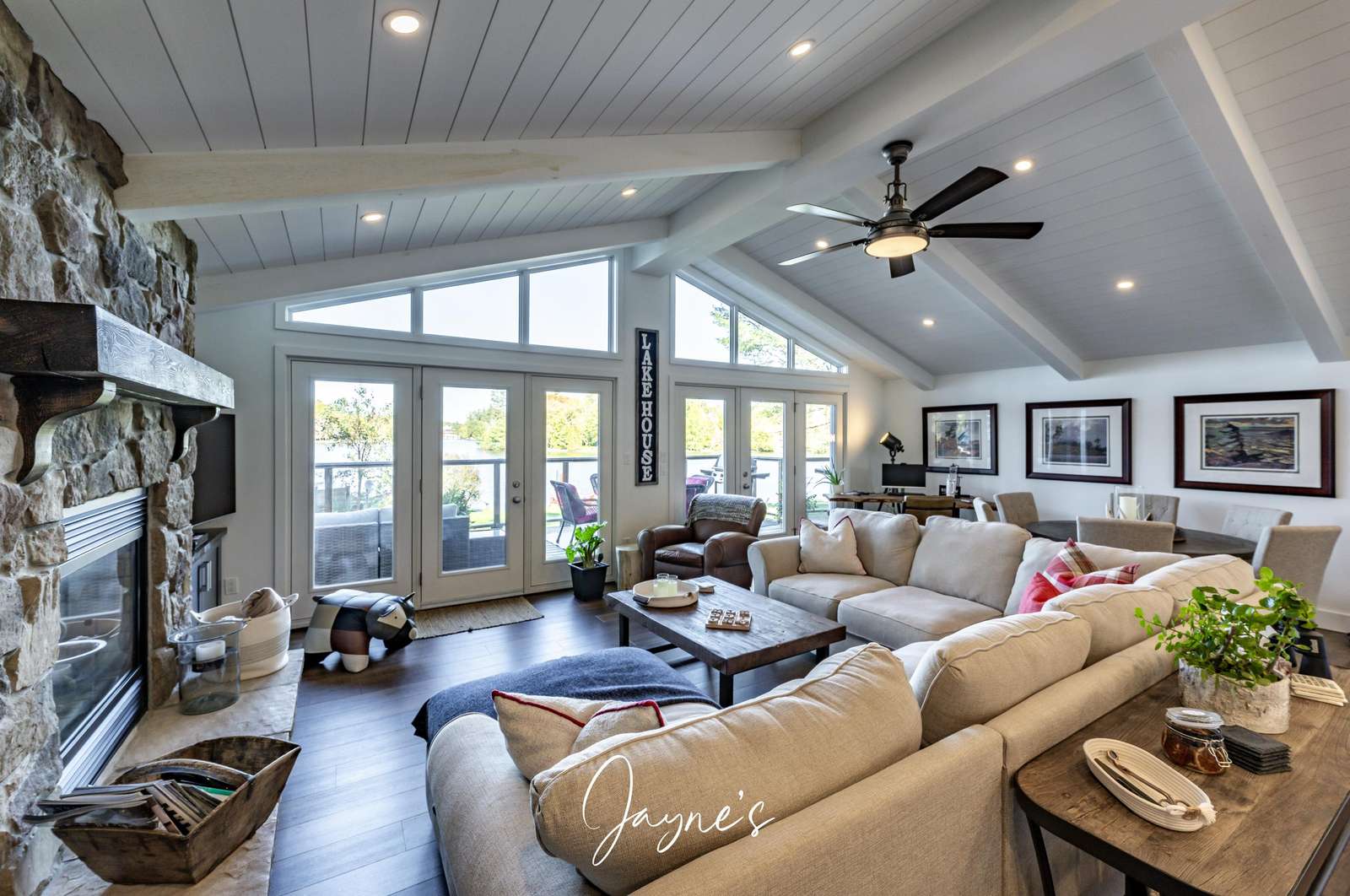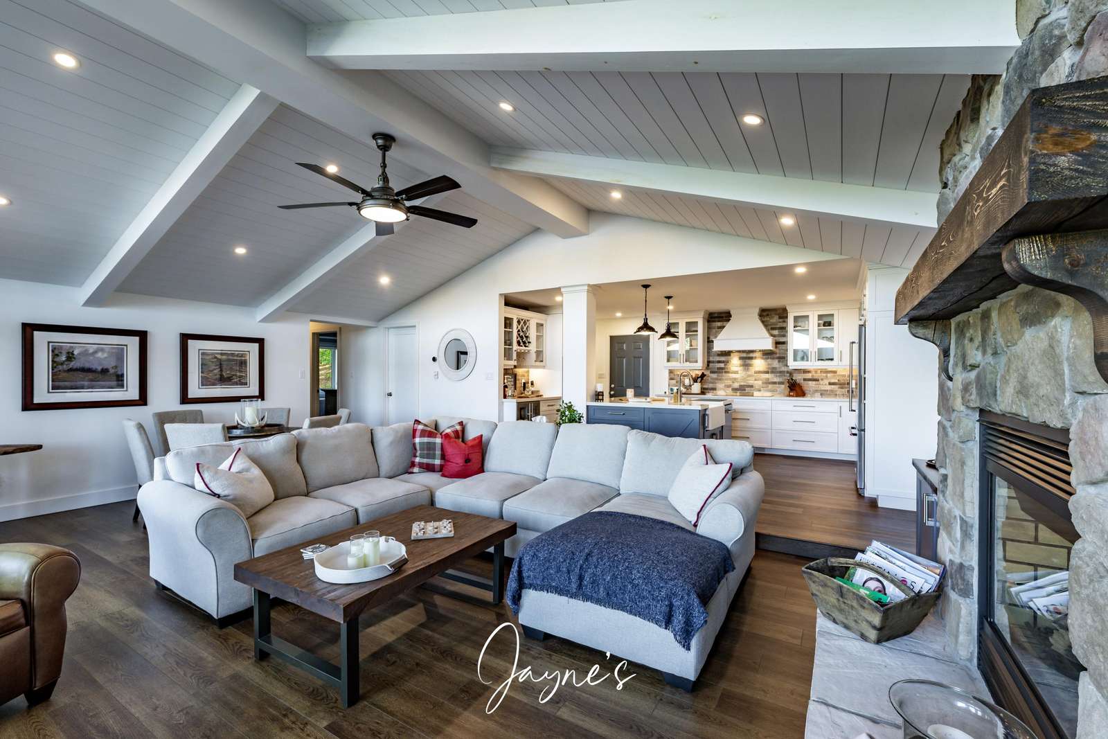 Spacious room with large 6 seater sectional, chair, TV, gas fireplace, office area and walkout