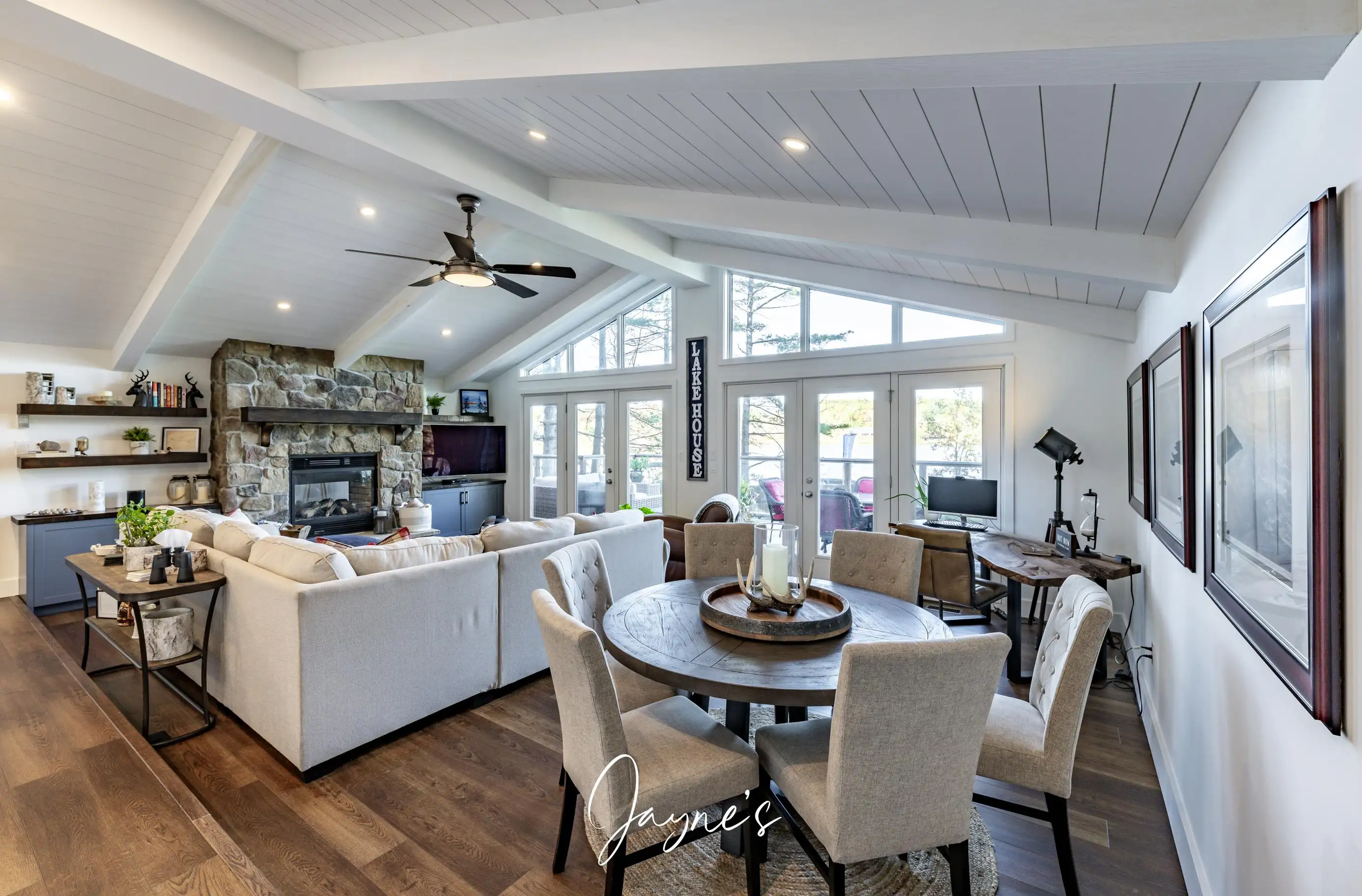 Open concept with the great room, round dining table with seating for 6 and a walkout