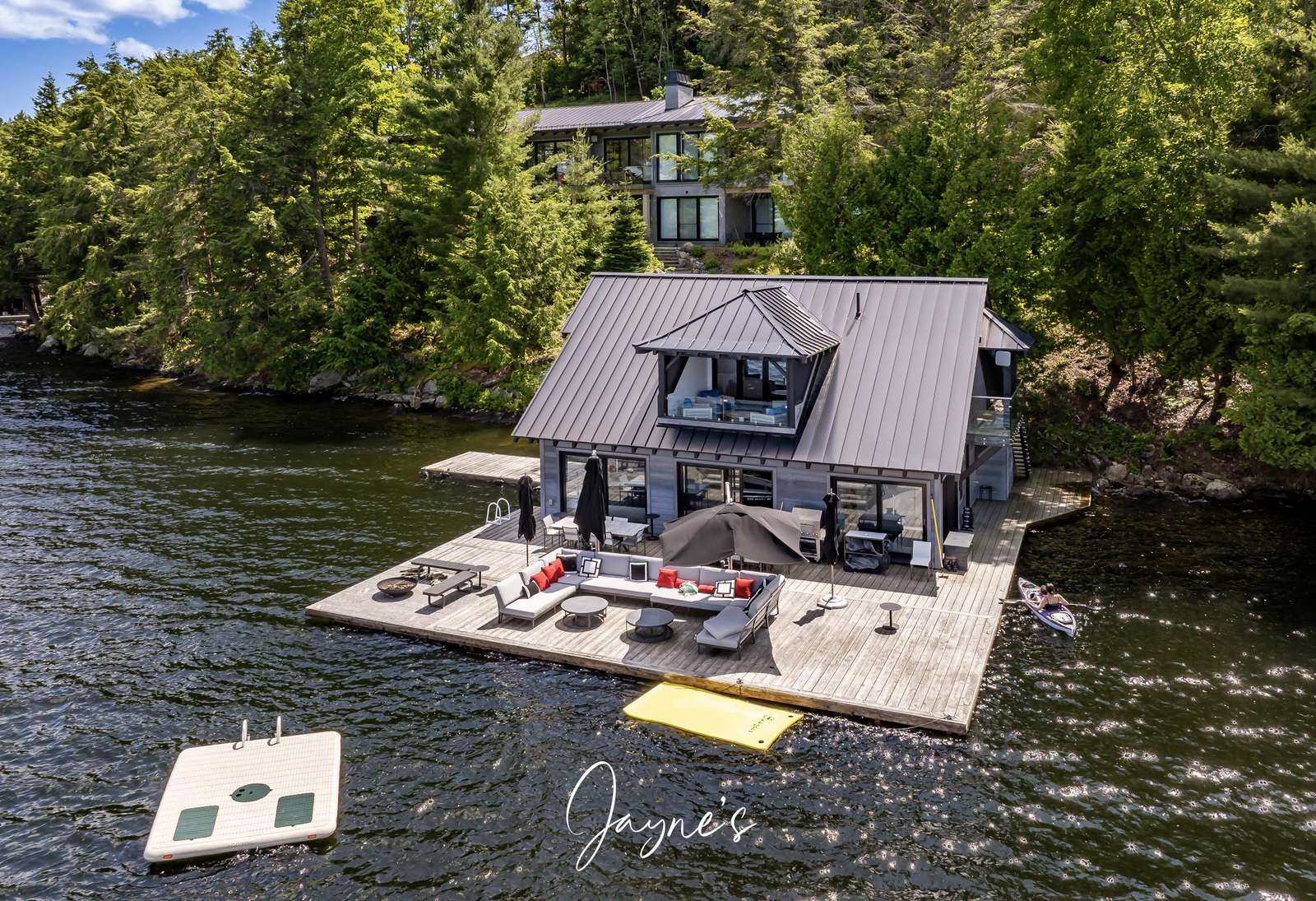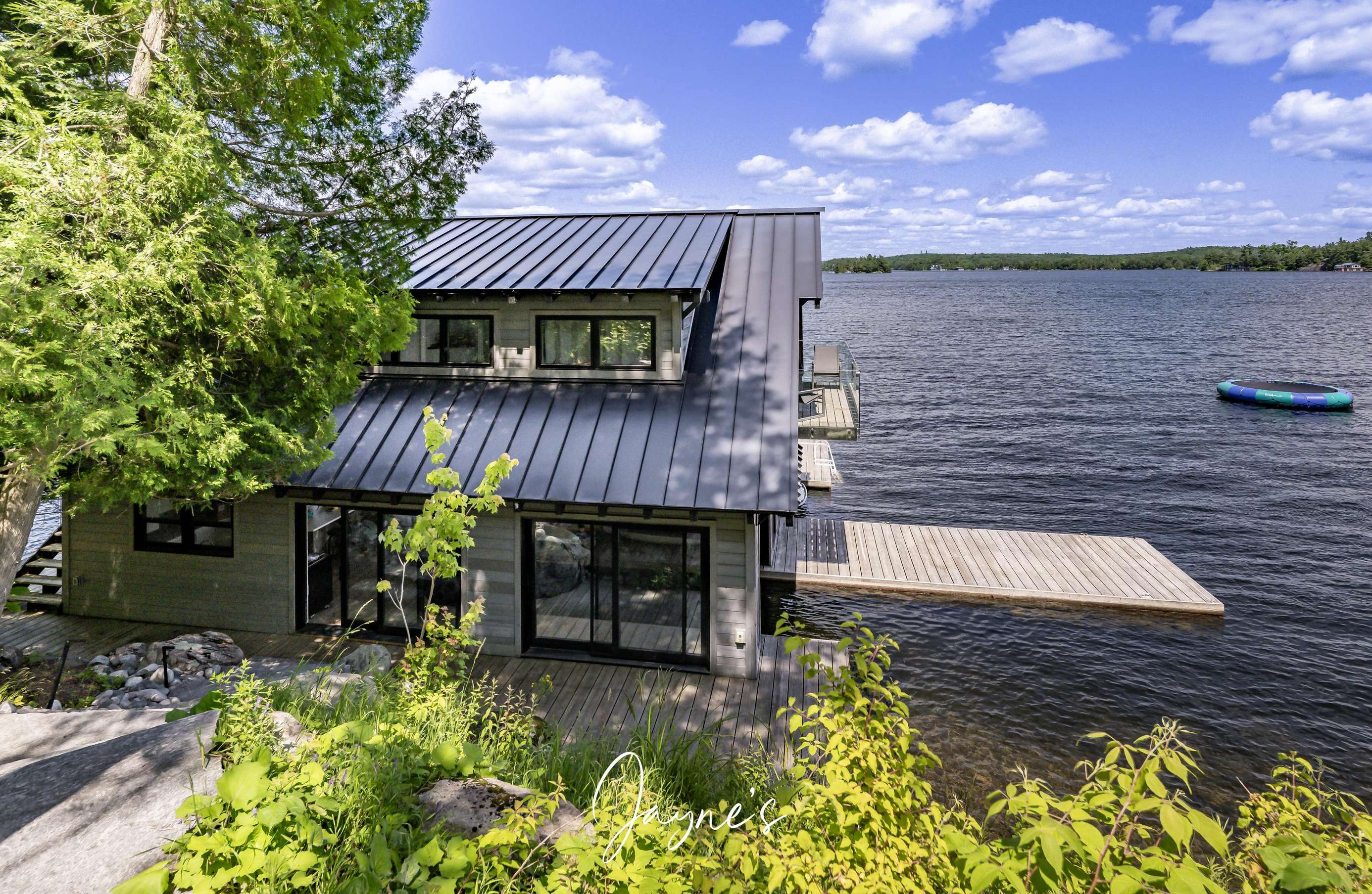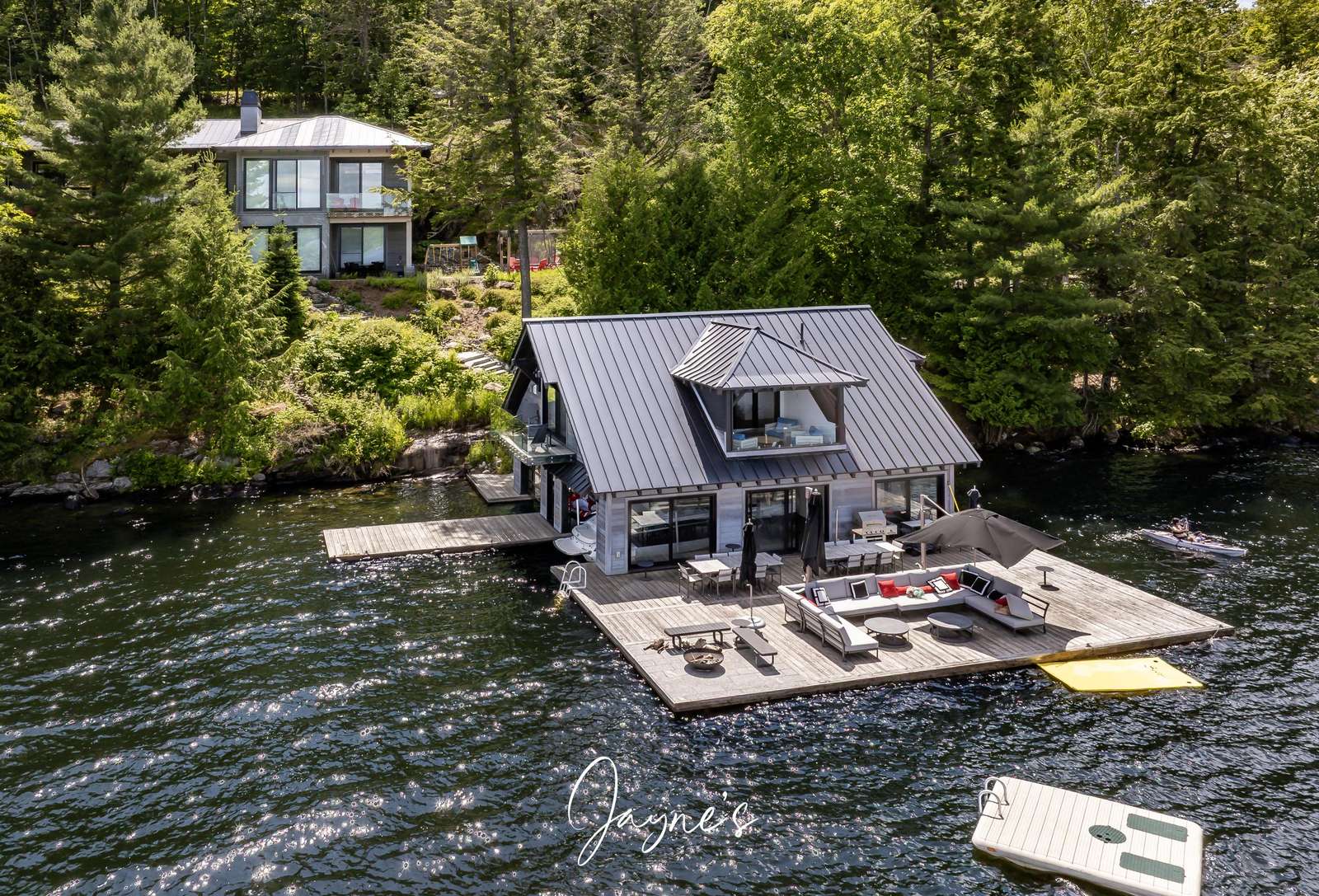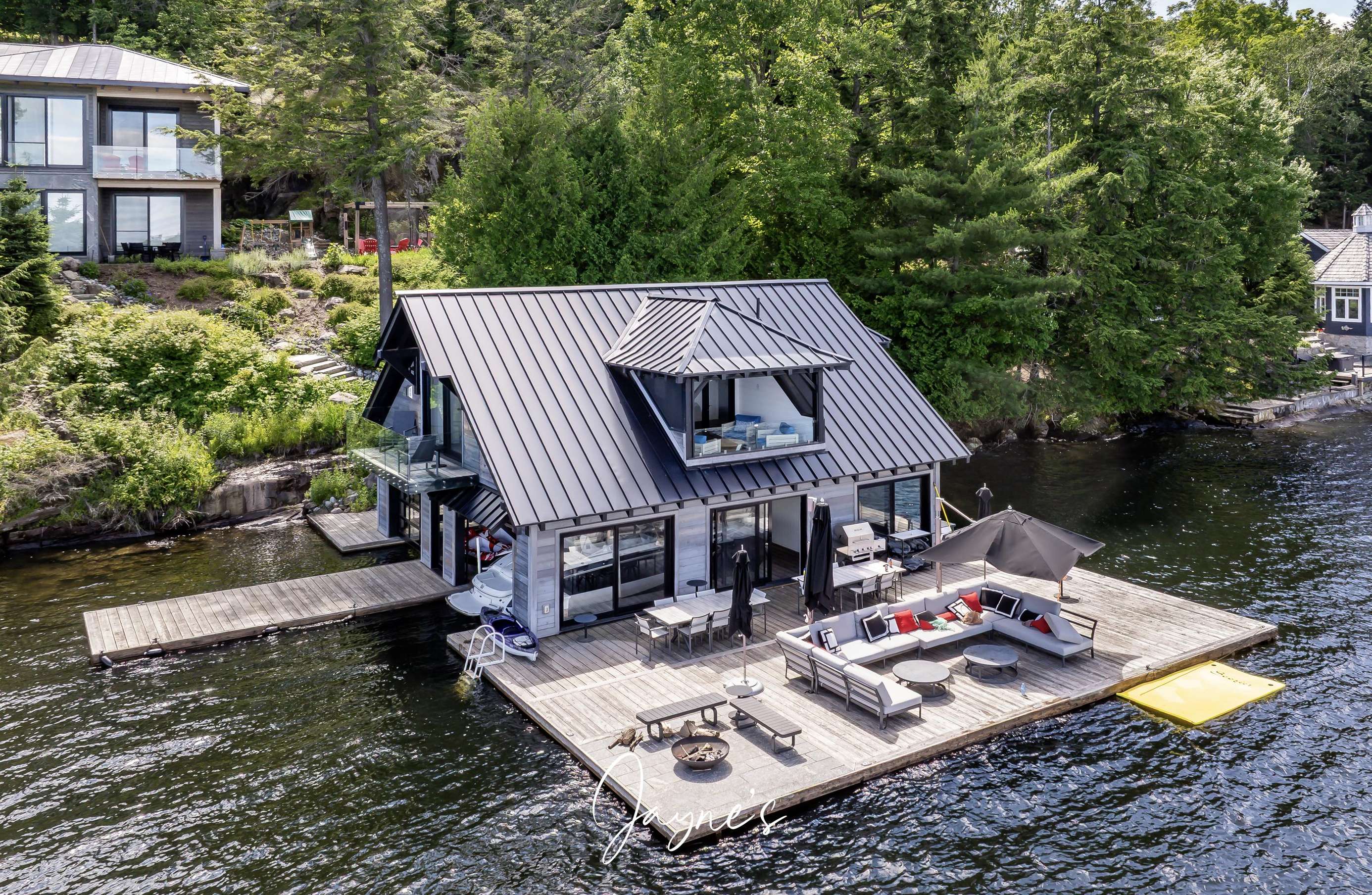 RITZ ROSSEAU - Beautifully landscaped property with stone steps leading from the cottage to the immaculate boathouse. This cottage has floor to ceiling windows and multiple walk-outs. Enjoy a wood fire in the beautiful screened Muskoka room. The boathouse boasts fabulous seating for 20 on the dock to enjoy dinners by the lake or sit by the fire pit in the evening. The water at the dock is perfect for boating, and there is a rocky entry to a shallow area for those who want to swim out to the floating raft.