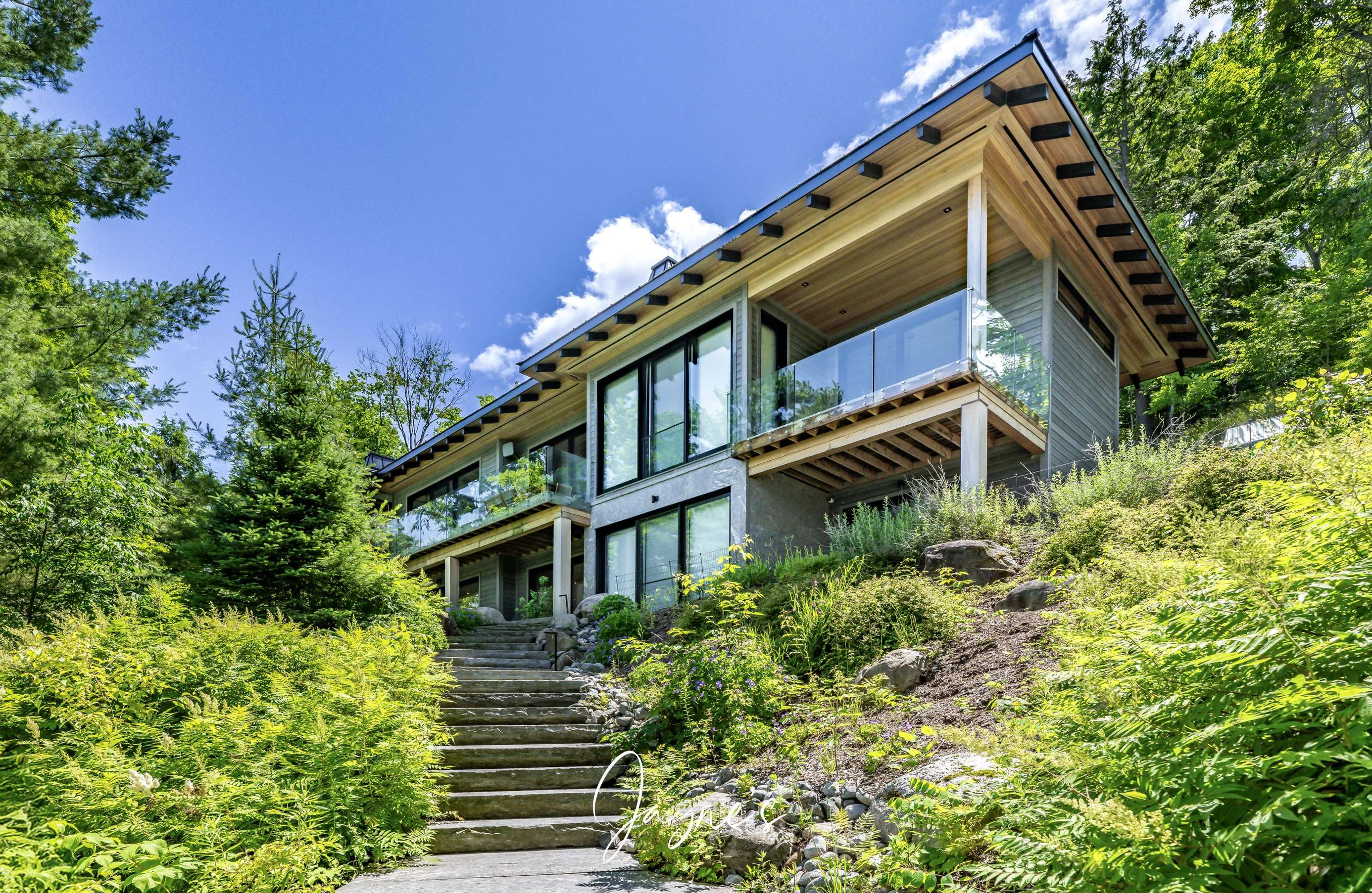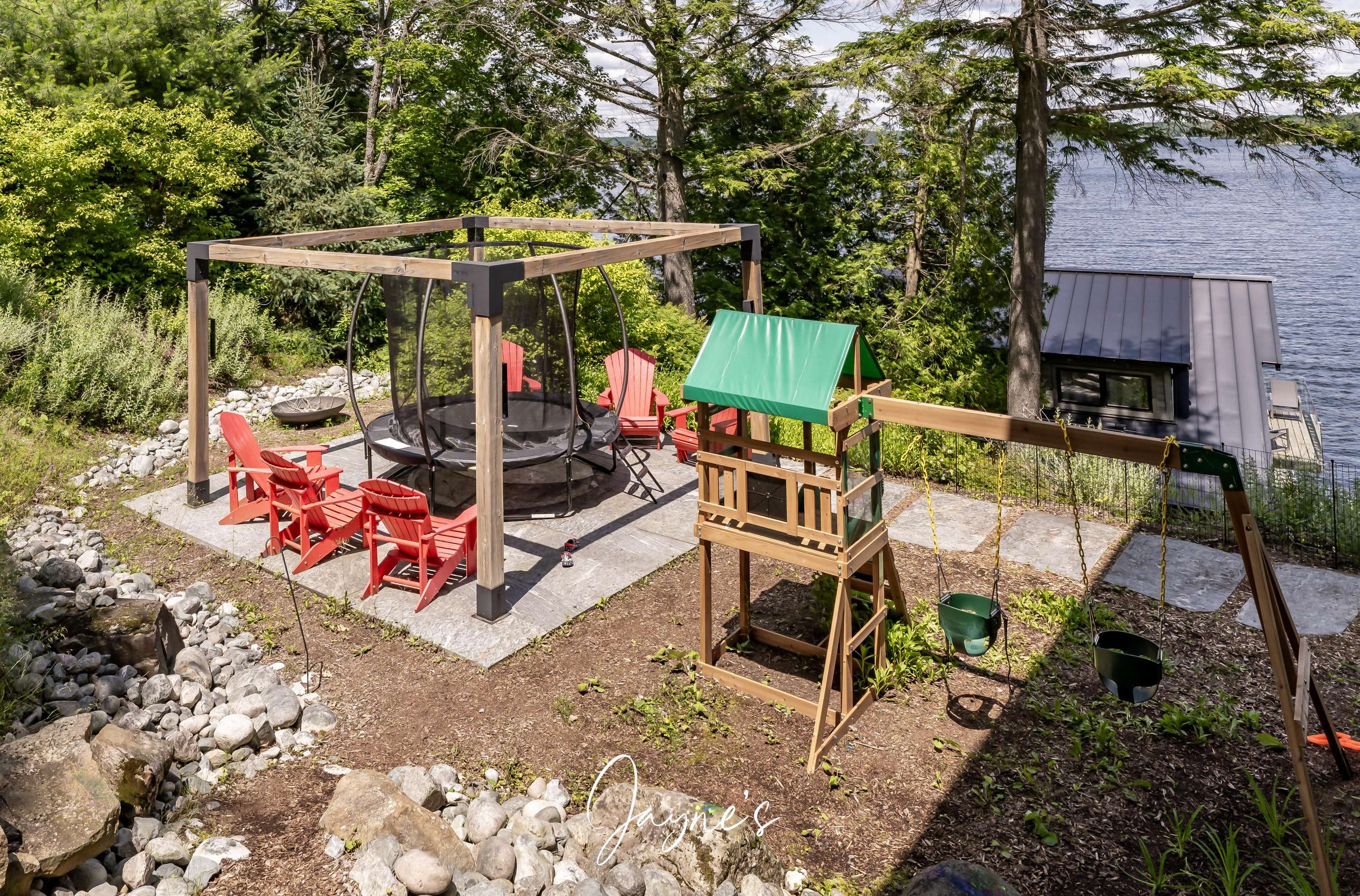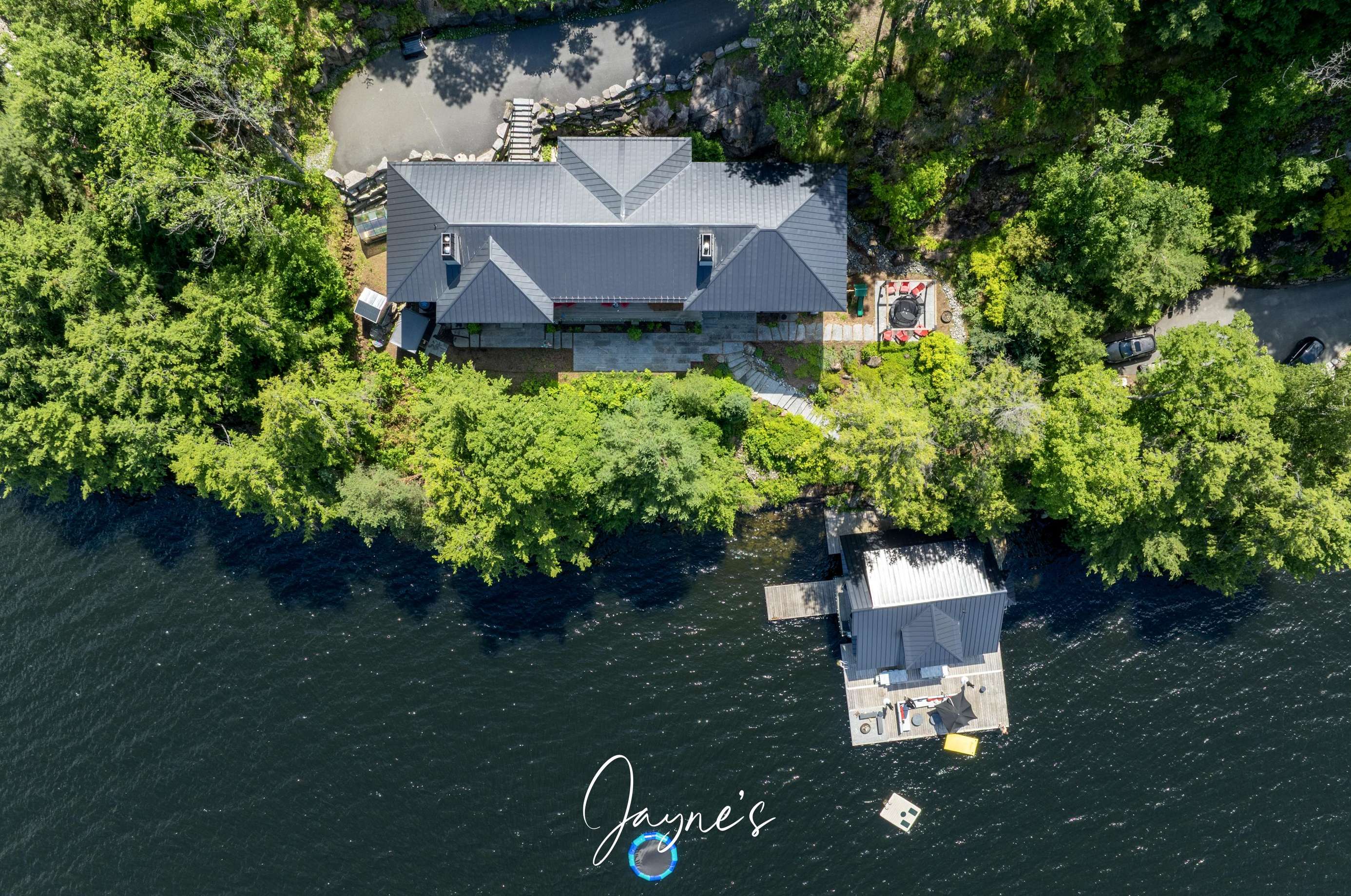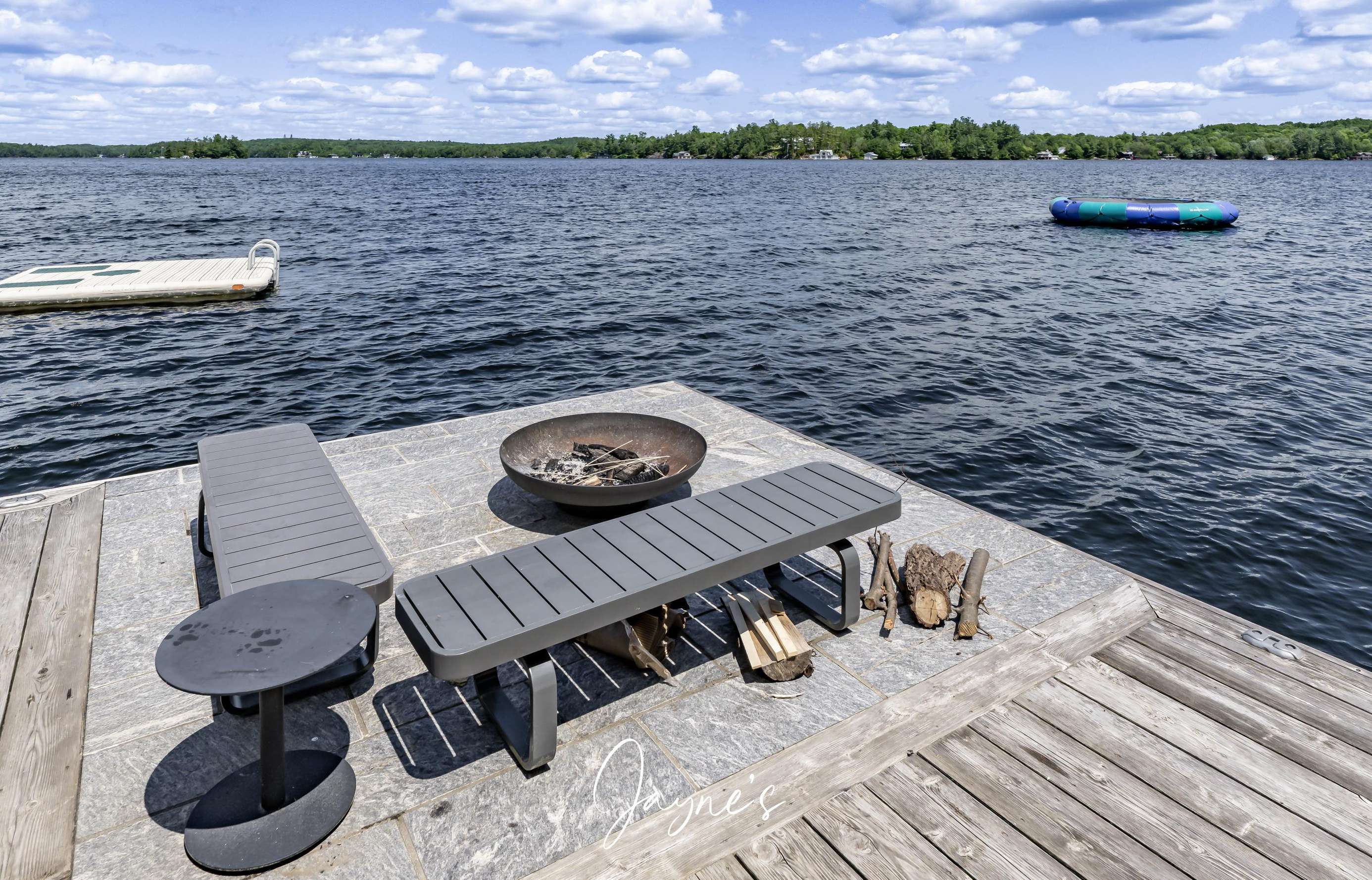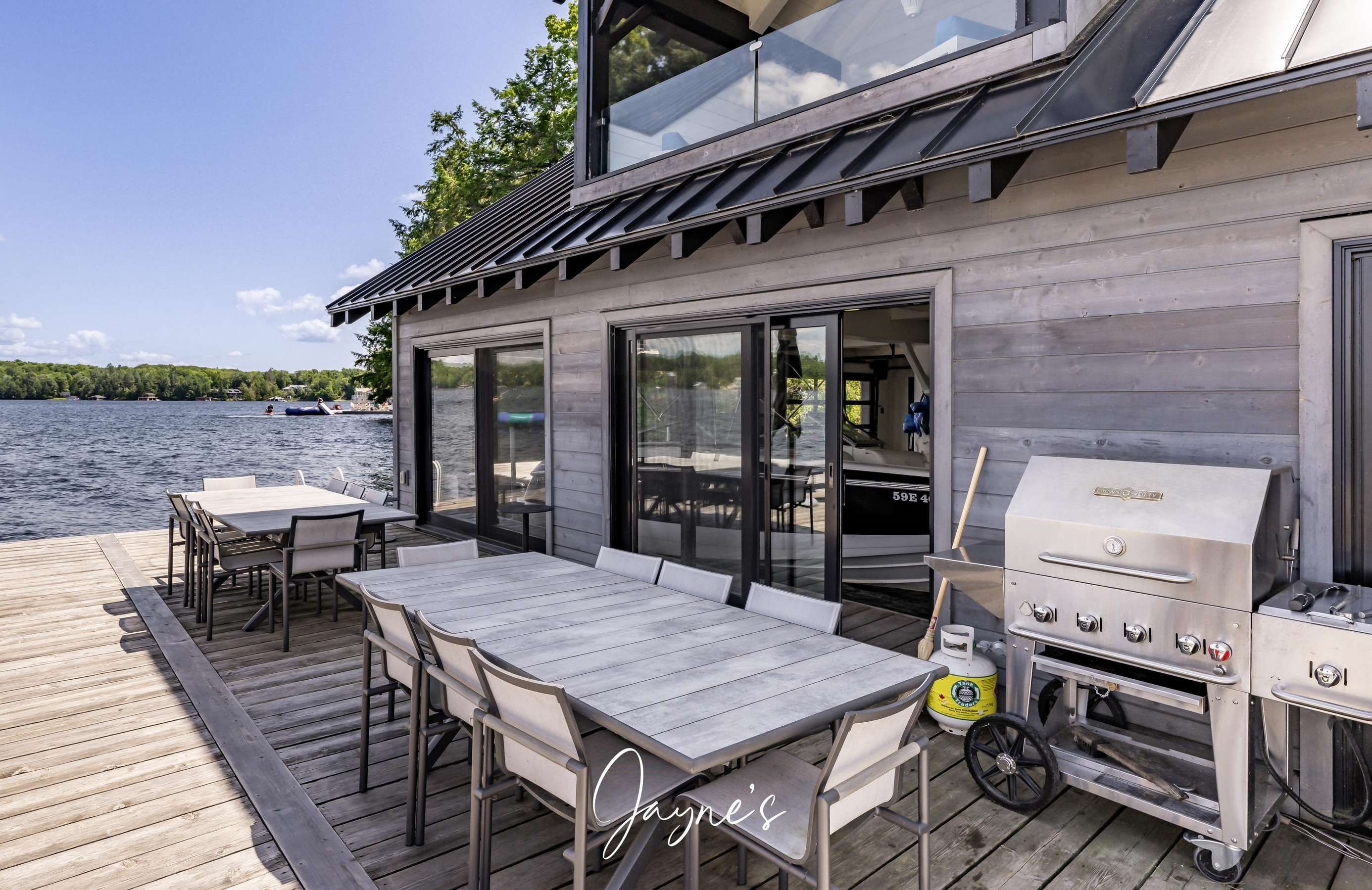 RITZ ROSSEAU - Beautifully landscaped property with stone steps leading from the cottage to the immaculate boathouse. This cottage has floor to ceiling windows and multiple walk-outs. Enjoy a wood fire in the beautiful screened Muskoka room. The boathouse boasts fabulous seating for 20 on the dock to enjoy dinners by the lake or sit by the fire pit in the evening. The water at the dock is perfect for boating, and there is a rocky entry to a shallow area for those who want to swim out to the floating raft.