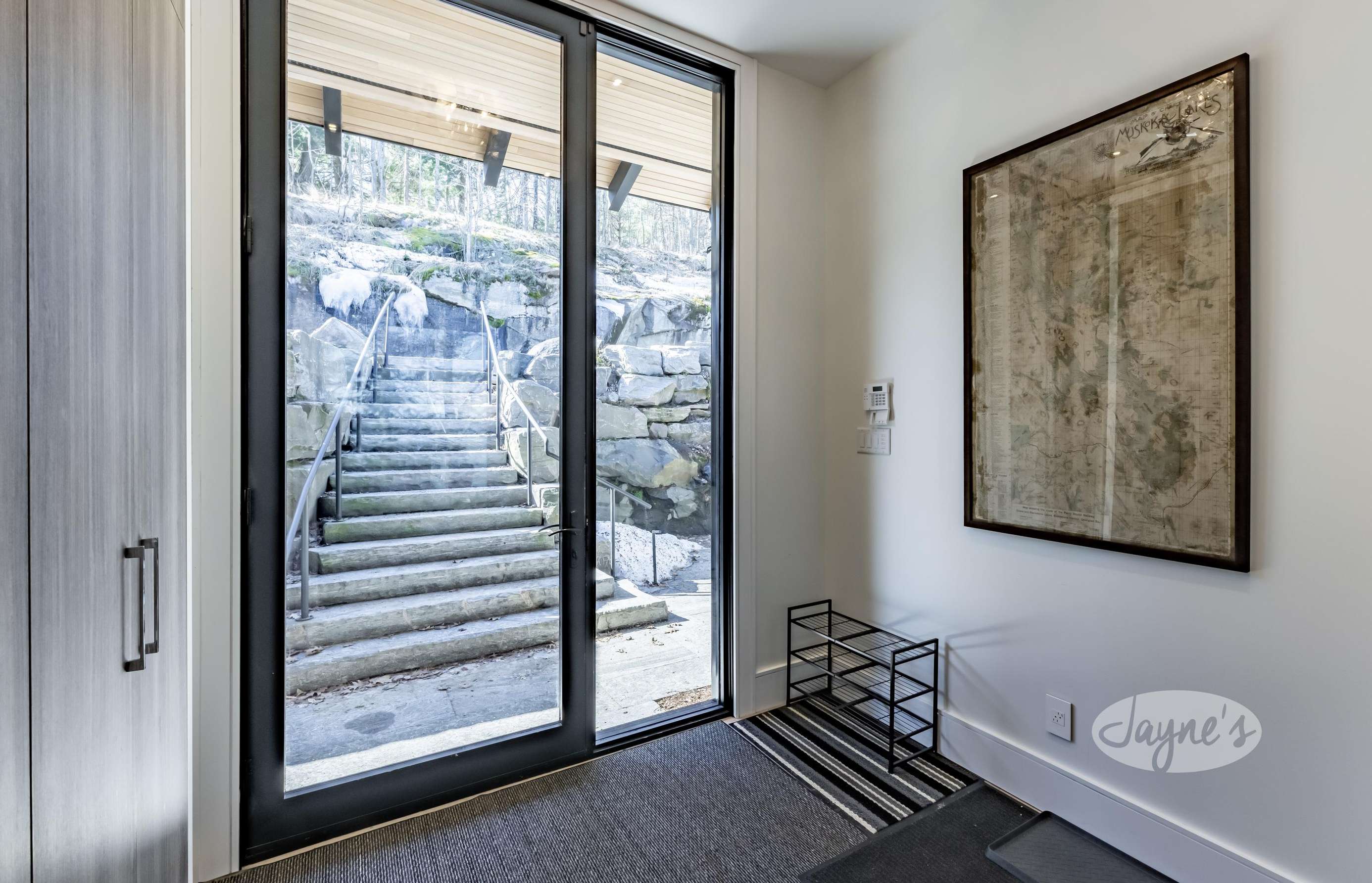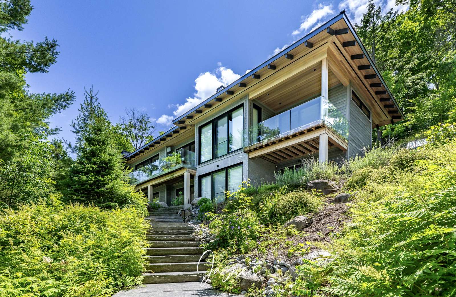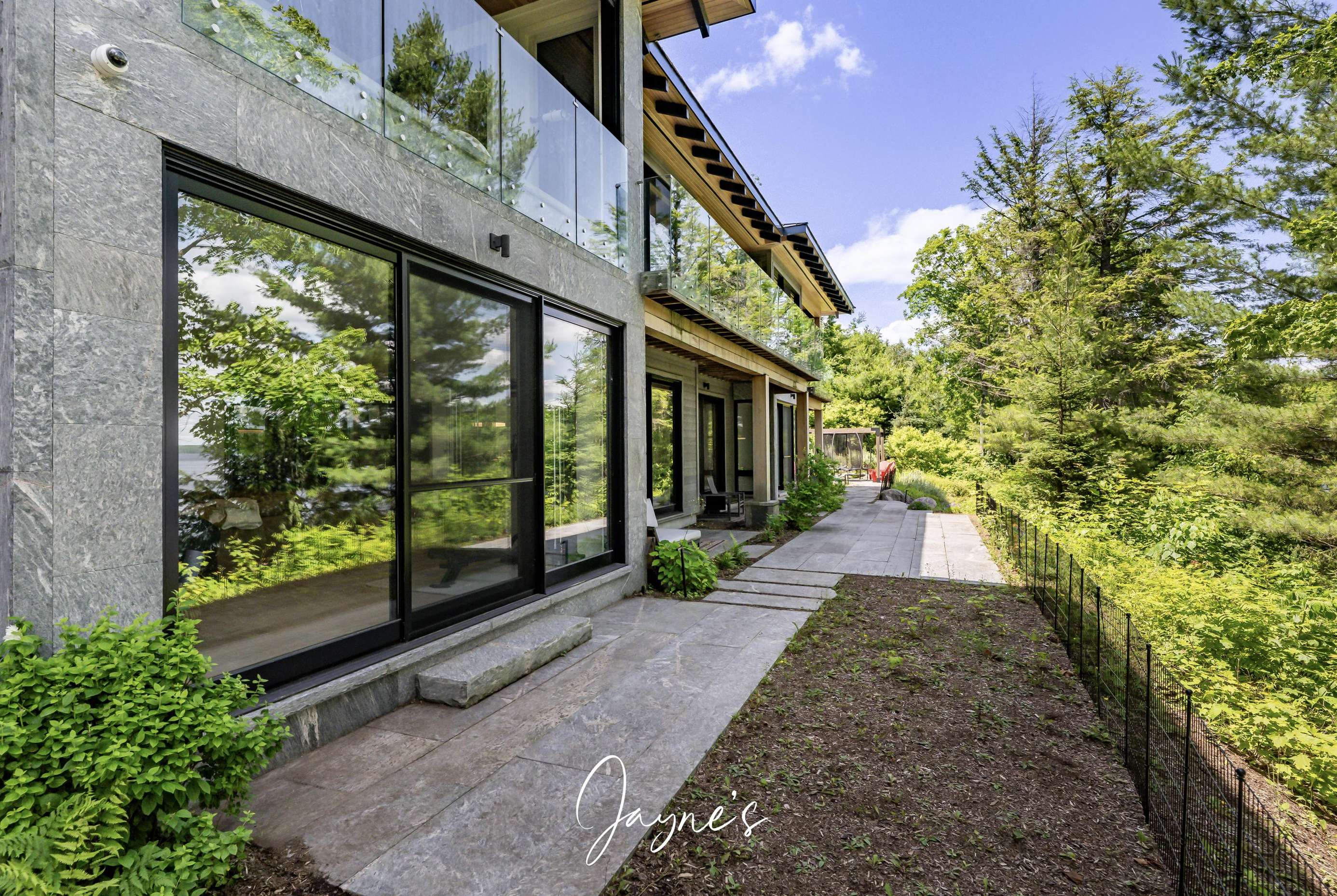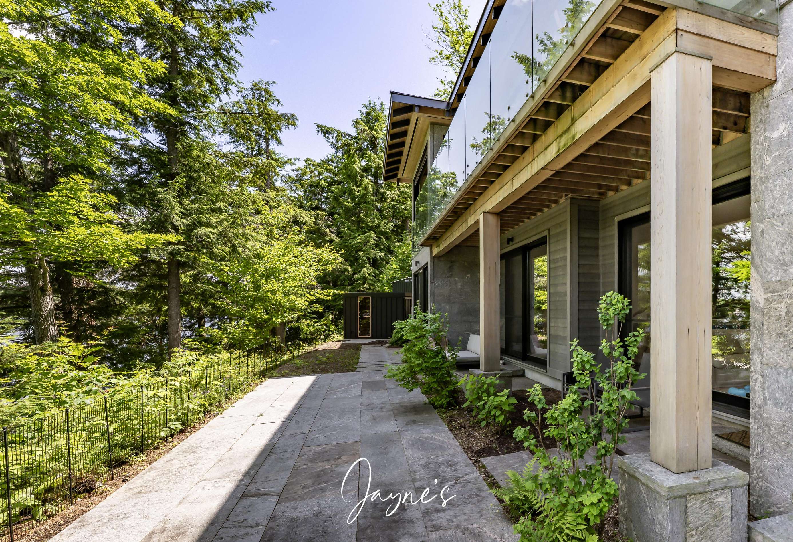RITZ ROSSEAU - Beautifully landscaped property with stone steps leading from the cottage to the immaculate boathouse. This cottage has floor to ceiling windows and multiple walk-outs. Enjoy a wood fire in the beautiful screened Muskoka room. The boathouse boasts fabulous seating for 20 on the dock to enjoy dinners by the lake or sit by the fire pit in the evening. The water at the dock is perfect for boating, and there is a rocky entry to a shallow area for those who want to swim out to the floating raft.