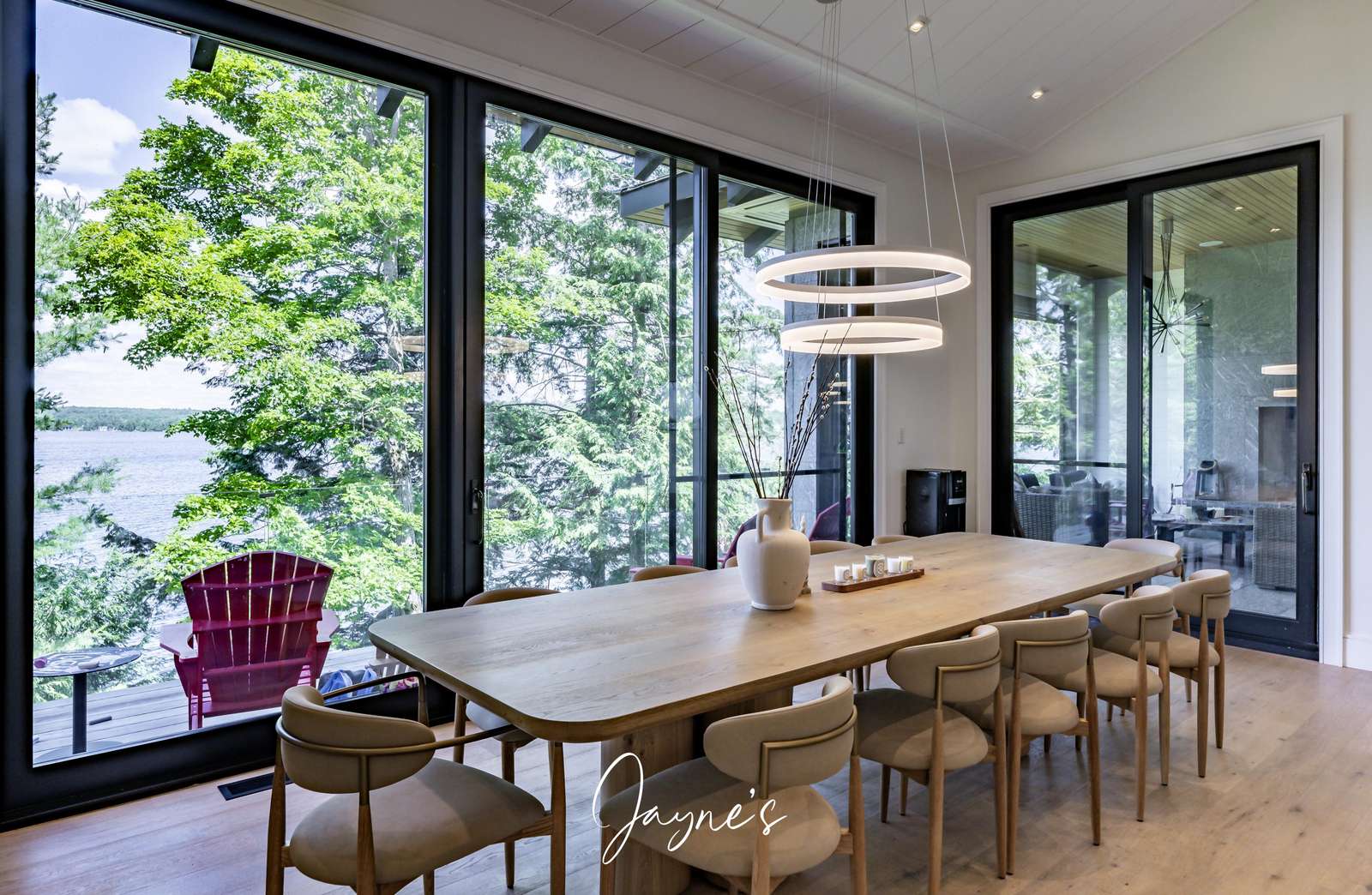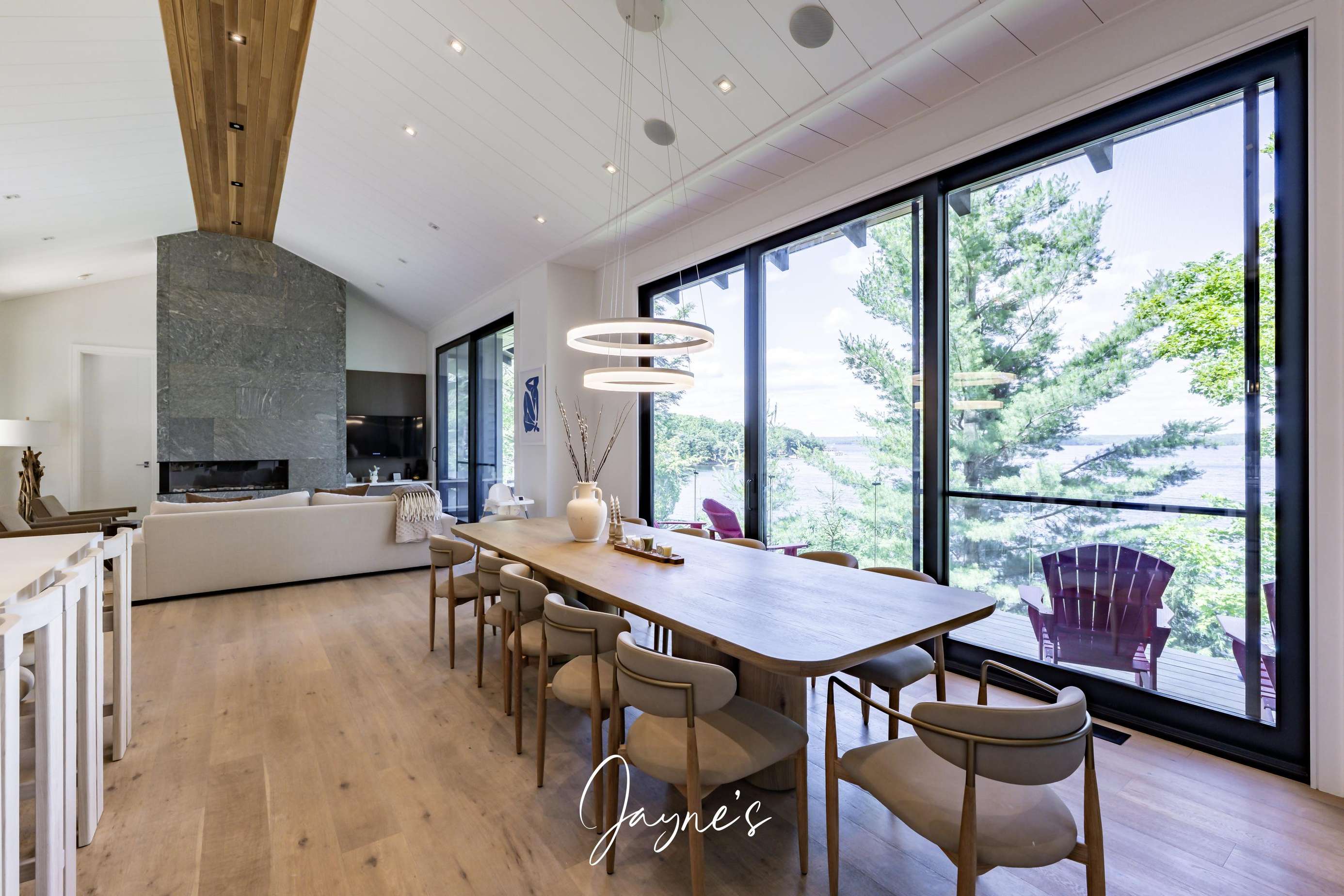 Open concept dining area with seating for 8 in the gorgeous natural light from floor to ceiling windows.