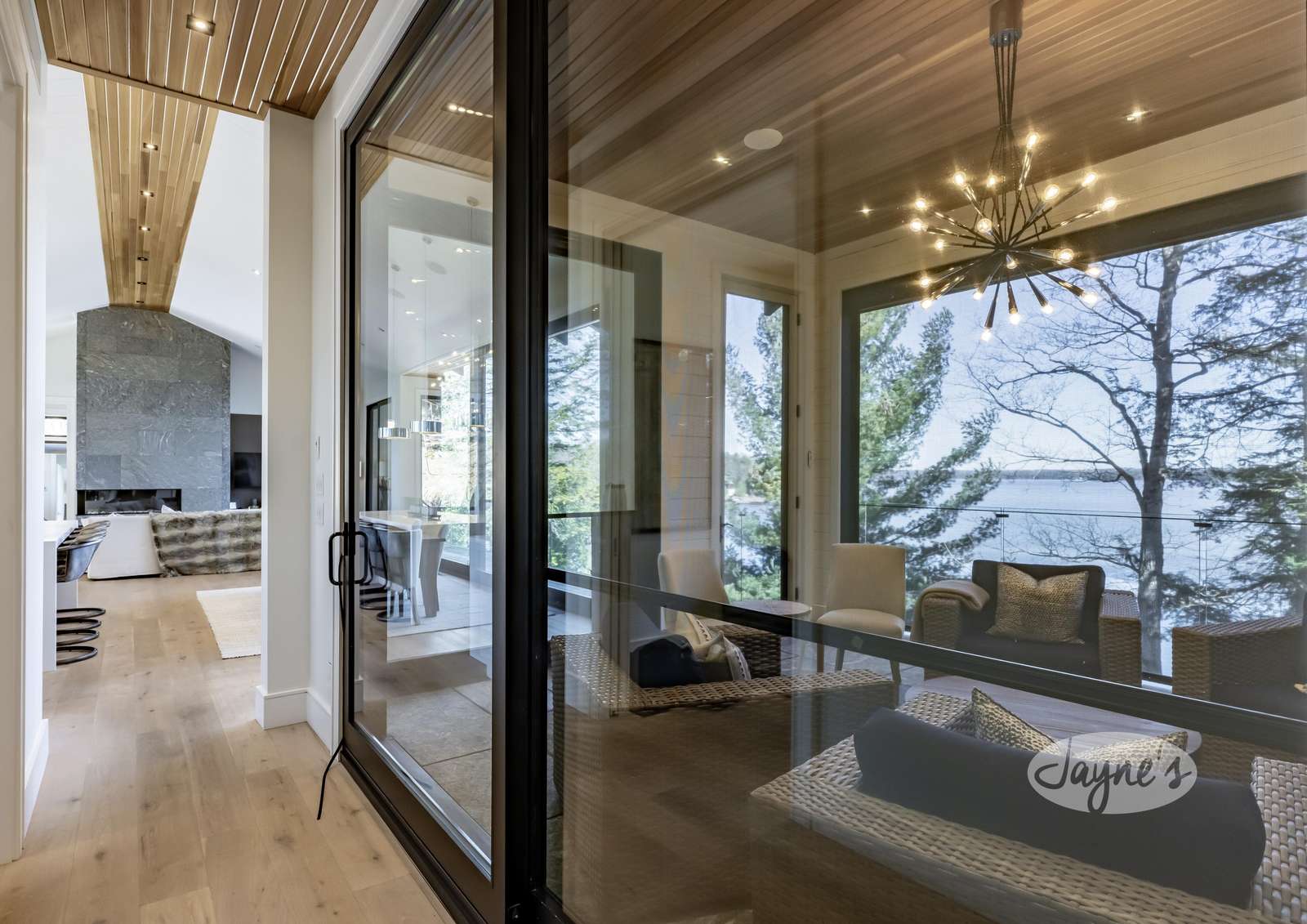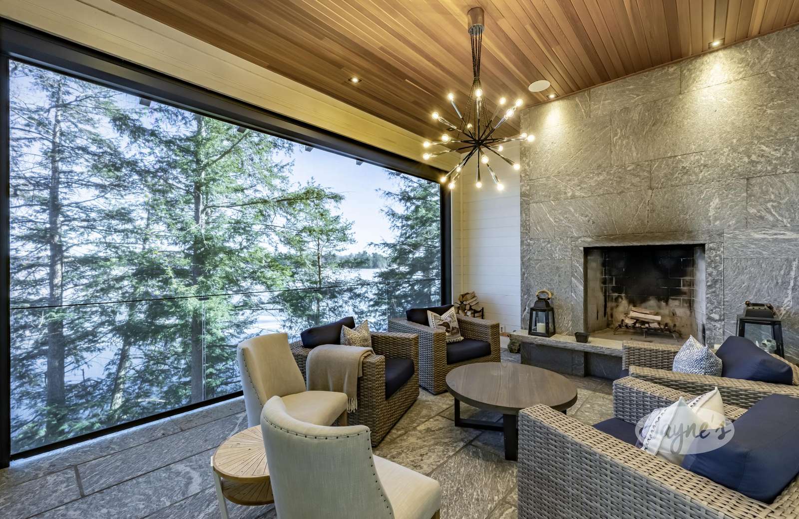 Charming Muskoka Room with seating surrounding a wood burning fireplace. Walkout to patio with floor to ceiling windows and roll screens.