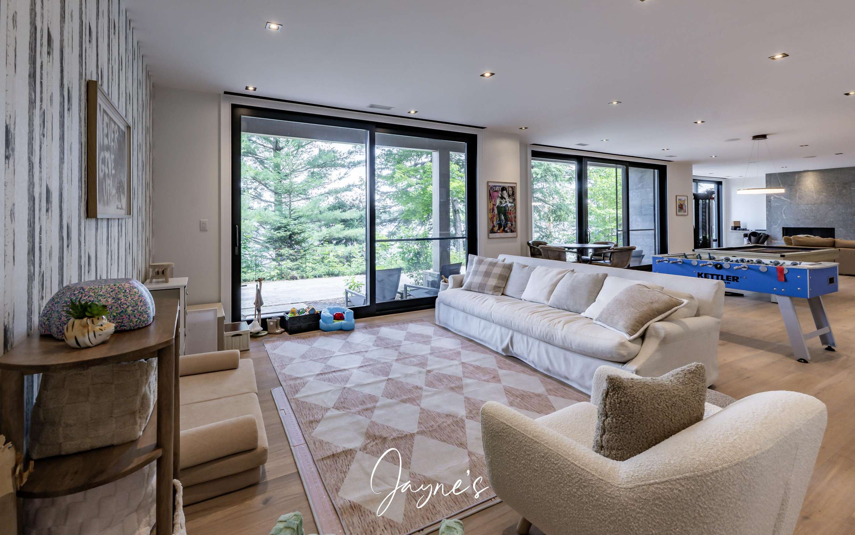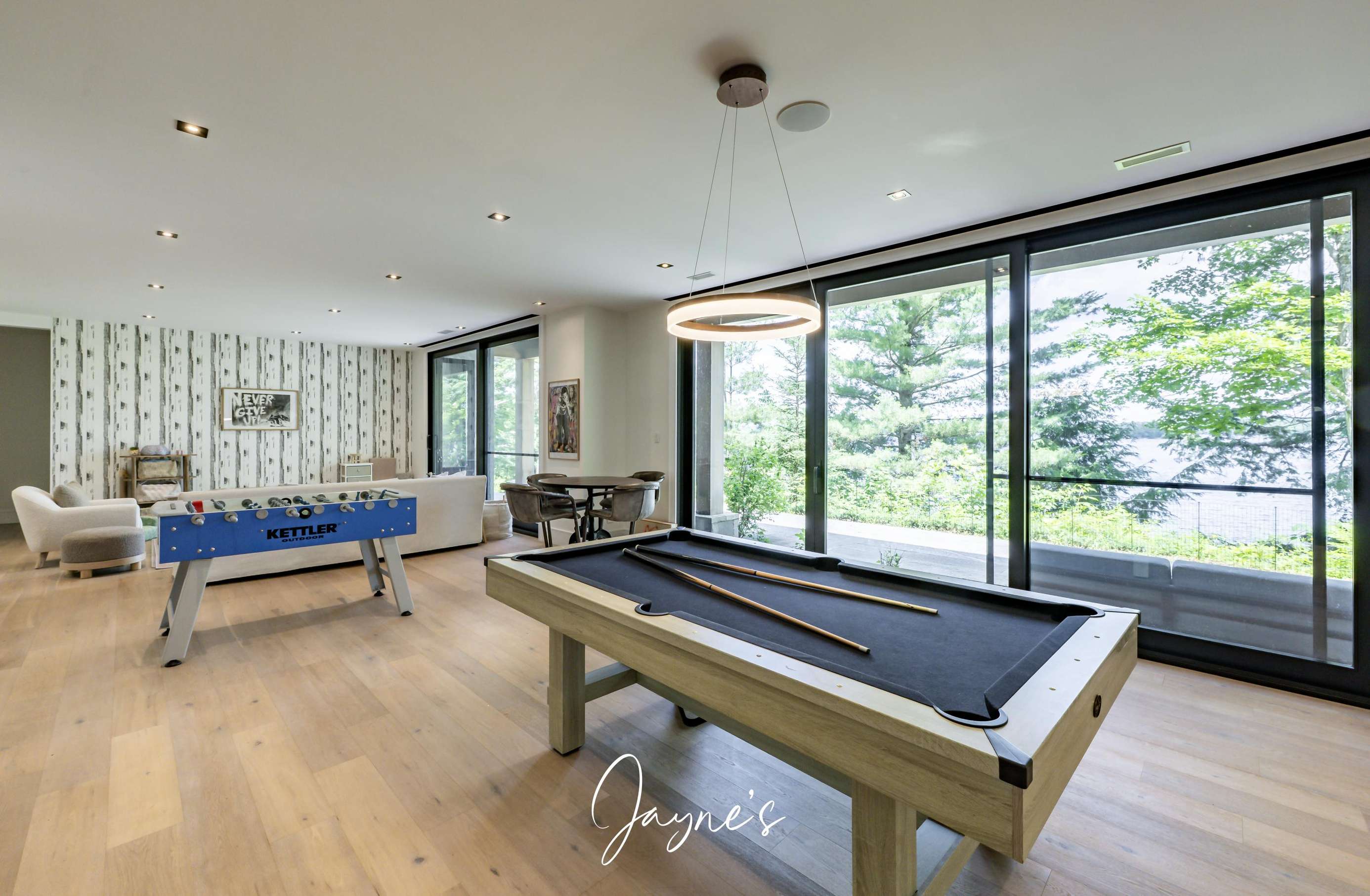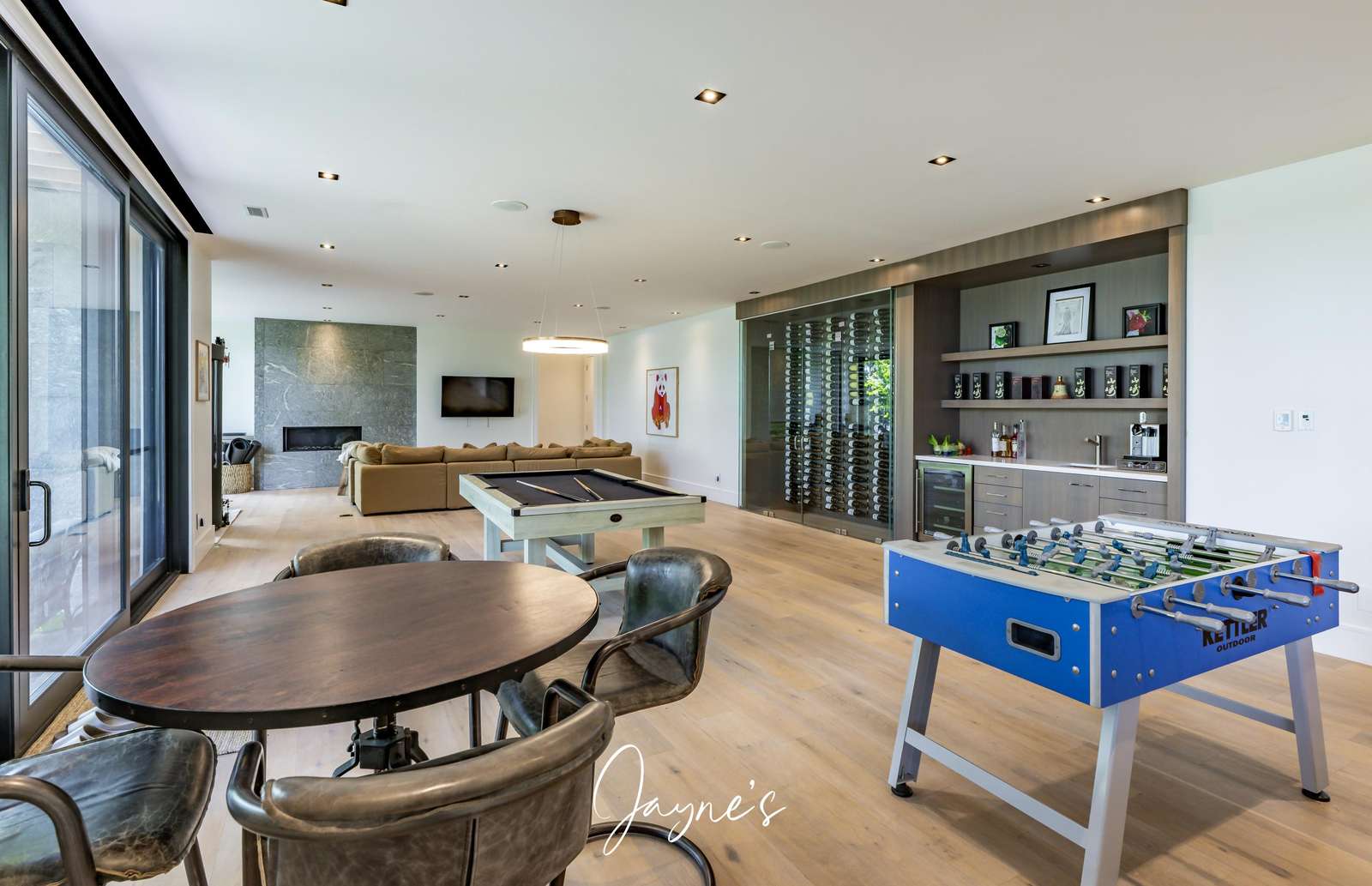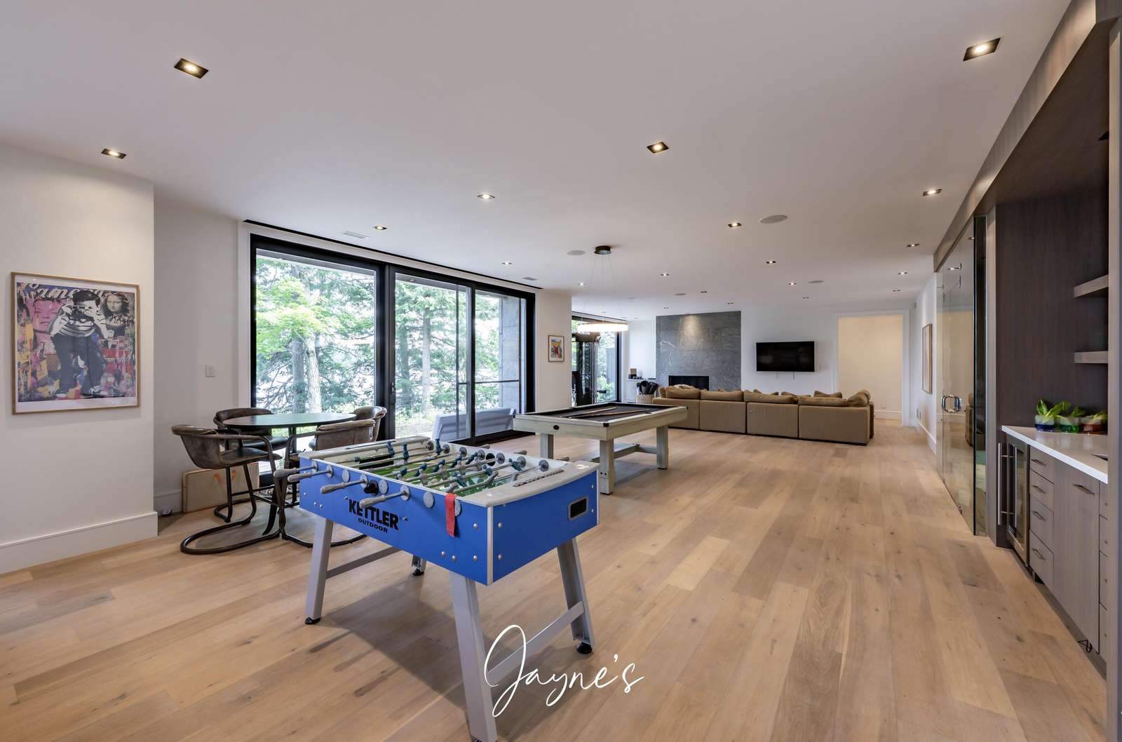 Large, bright games area with foosball table and pool table.