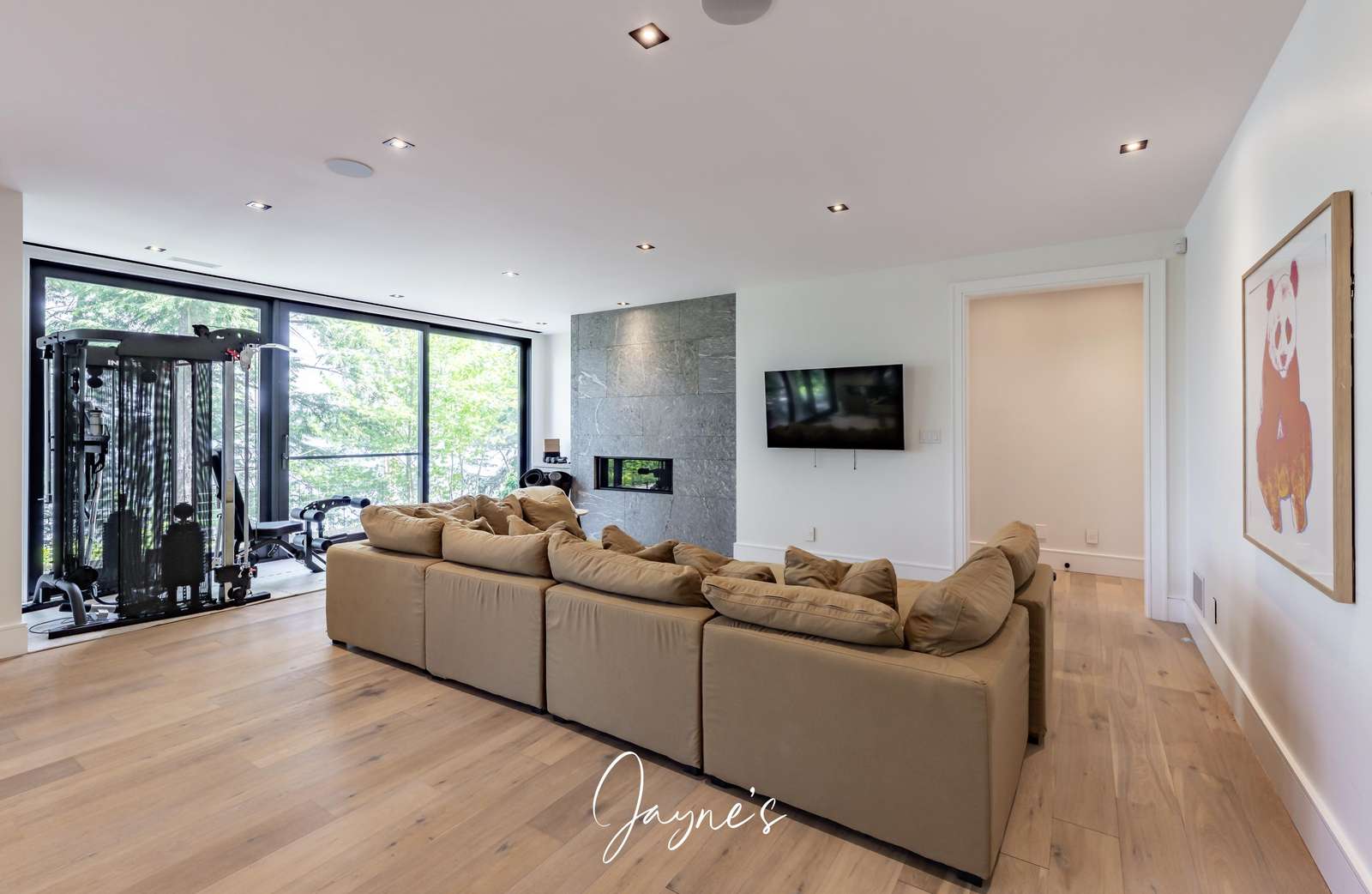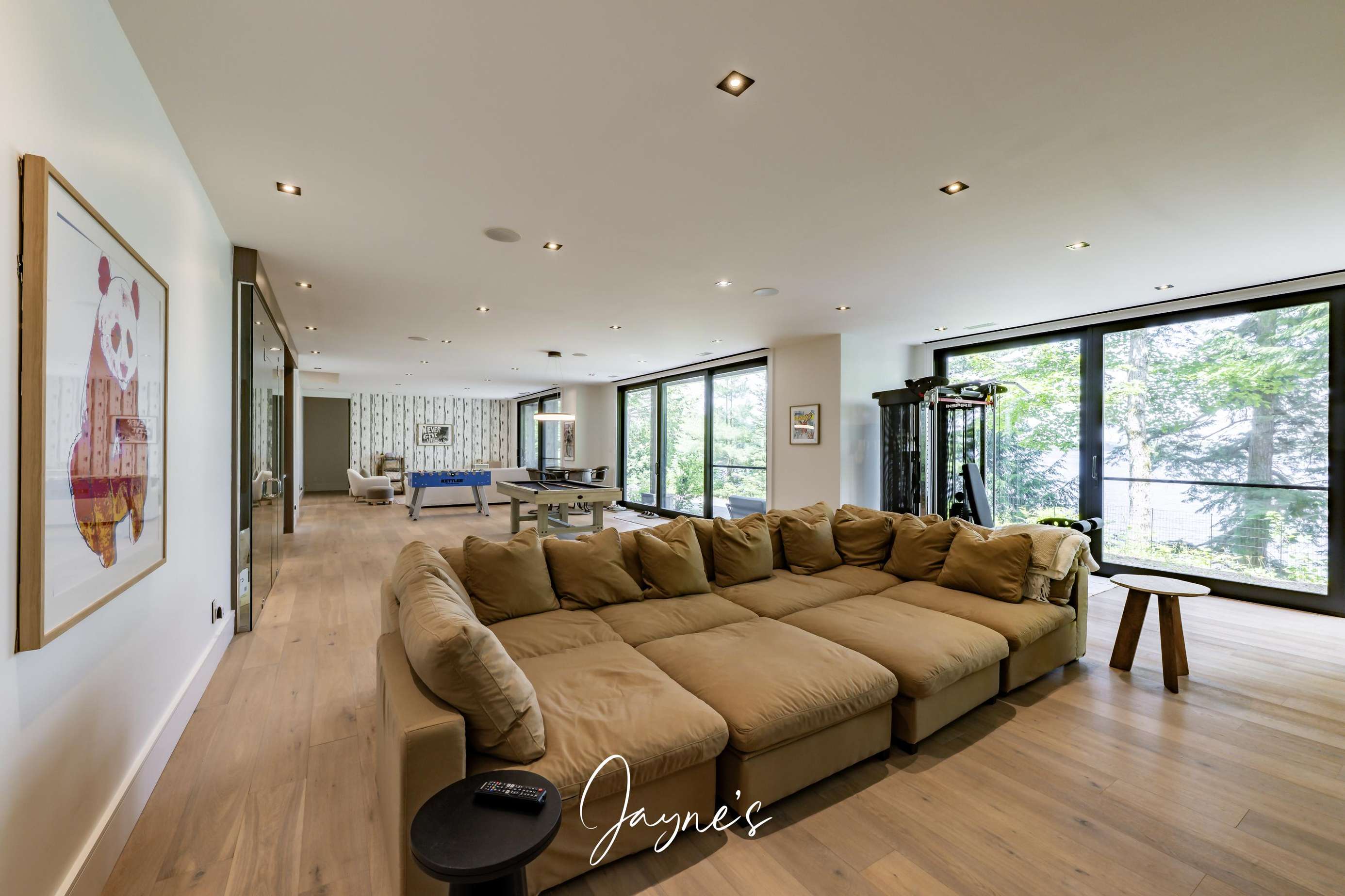 Spacious living area with TV, gas fireplace, large pit sofa, work out machine and bar area with bar fridge and wine cooler.