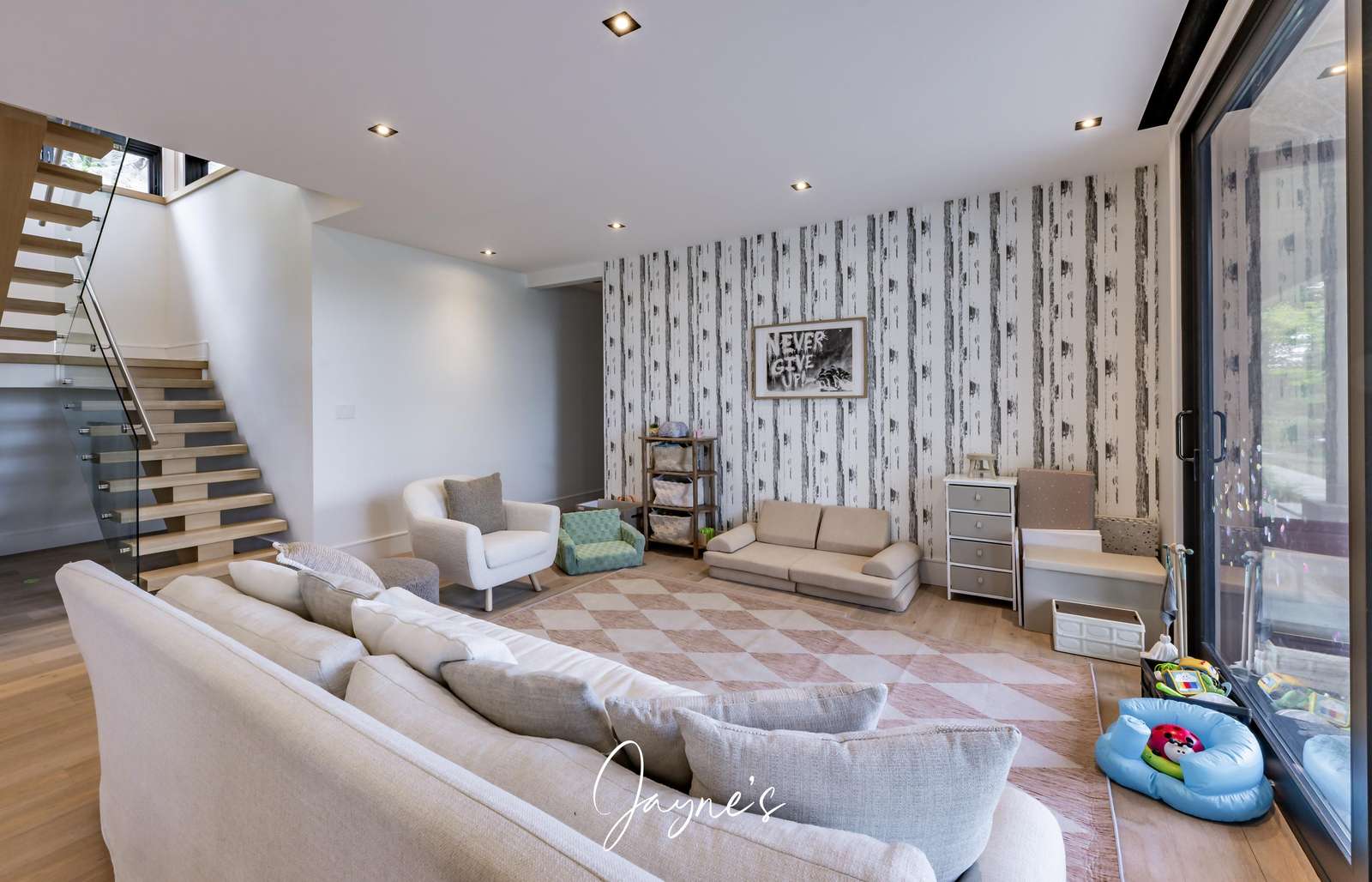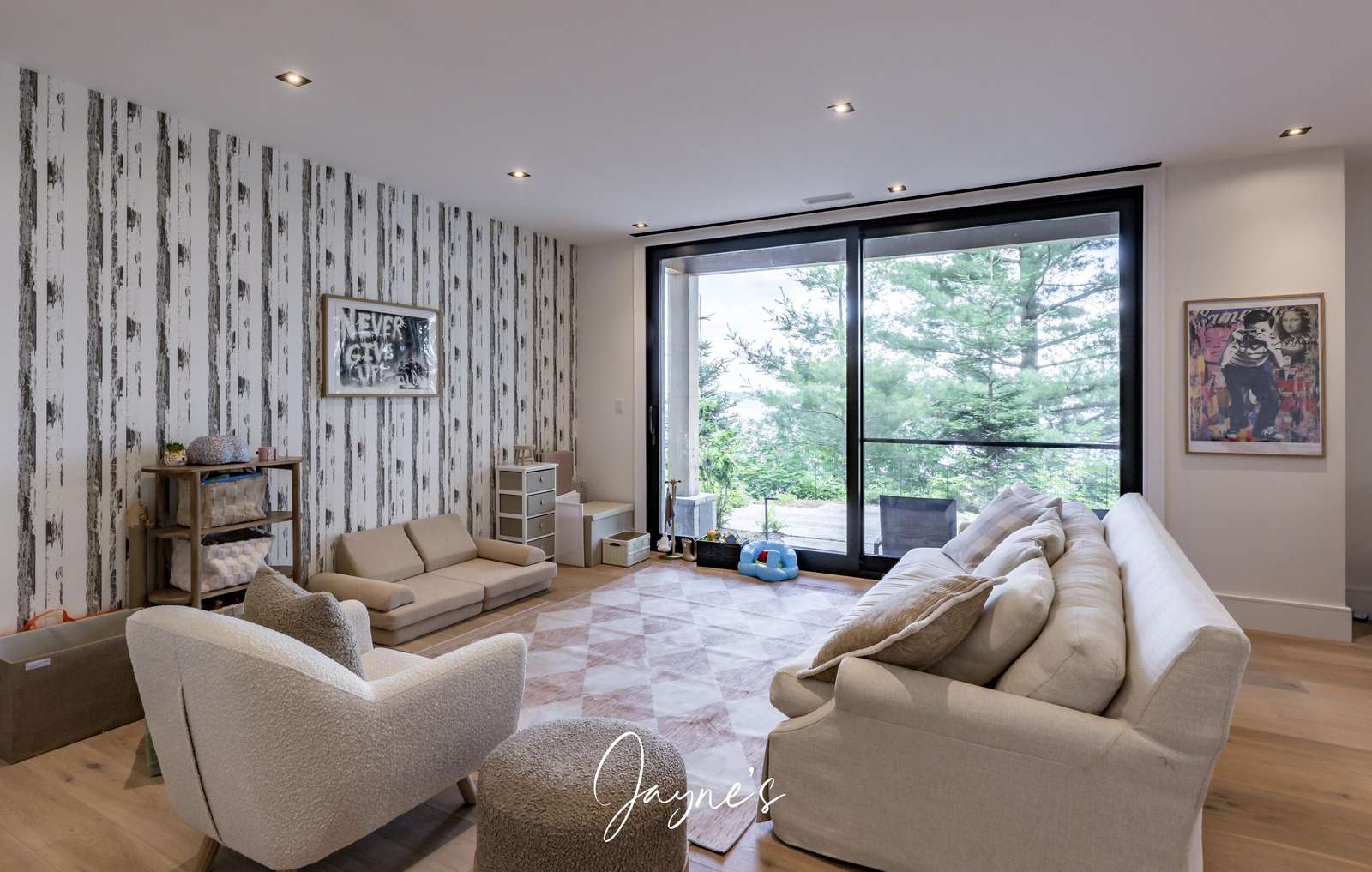Bright area with couch, chairs and toys