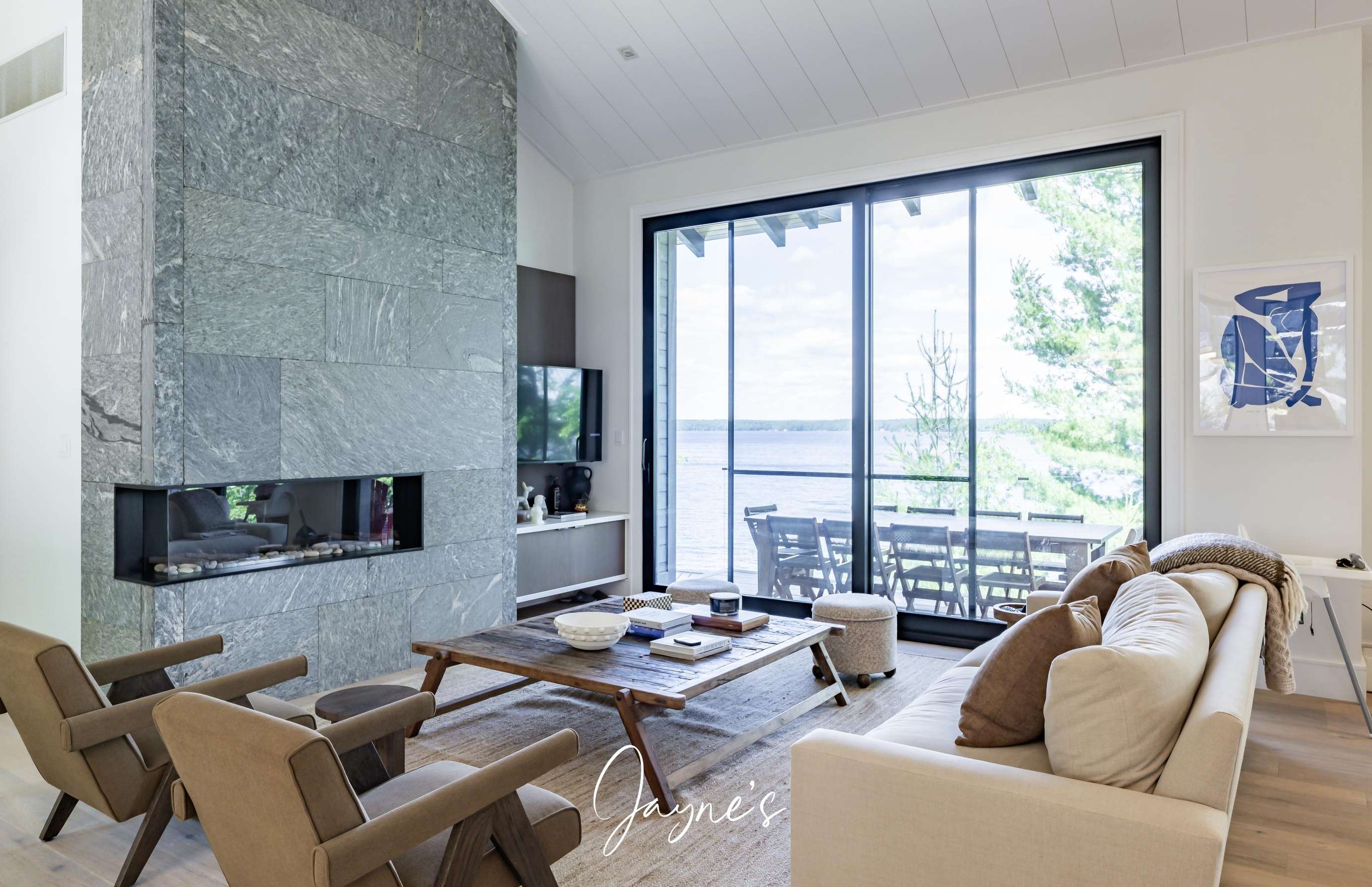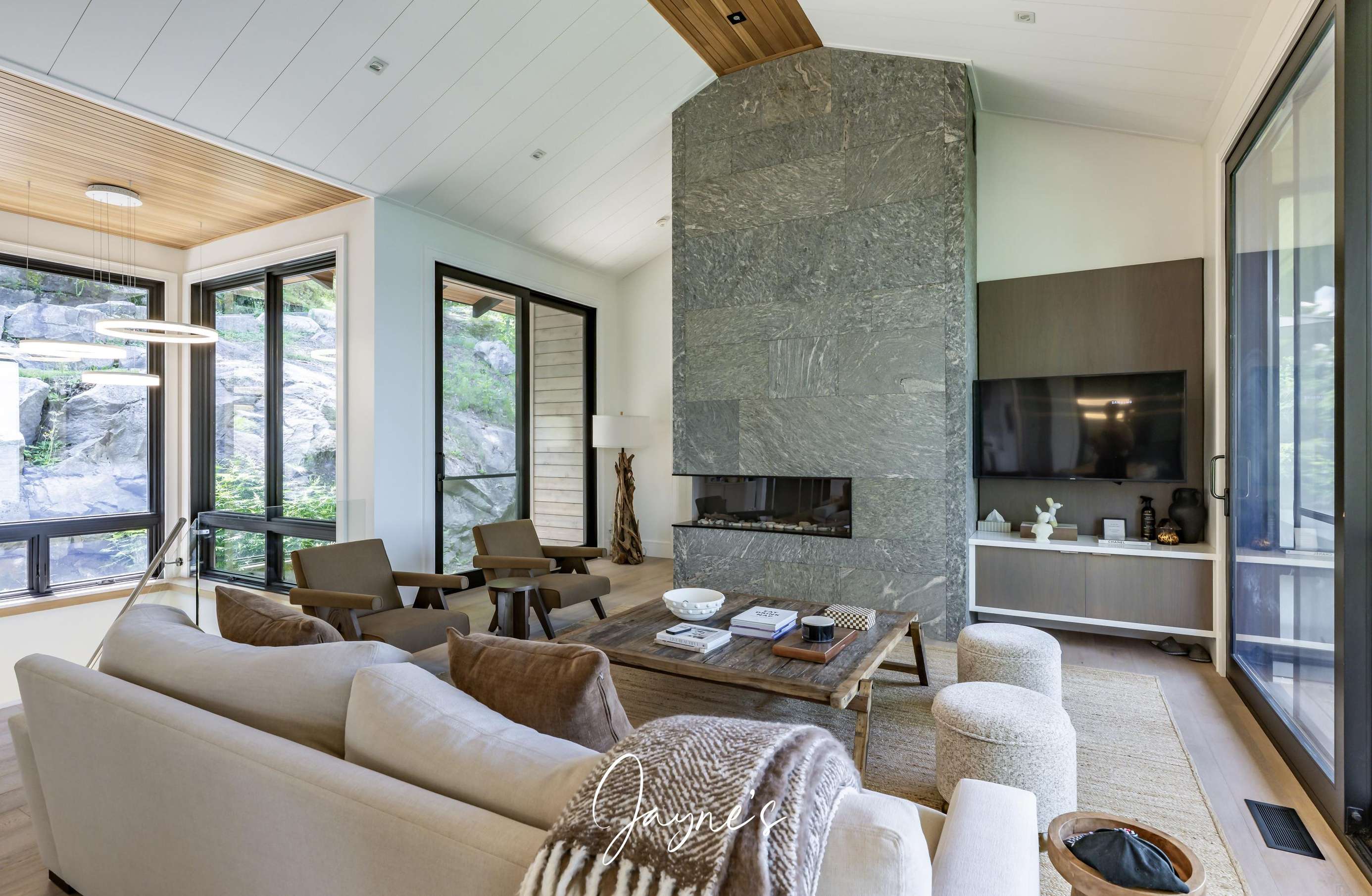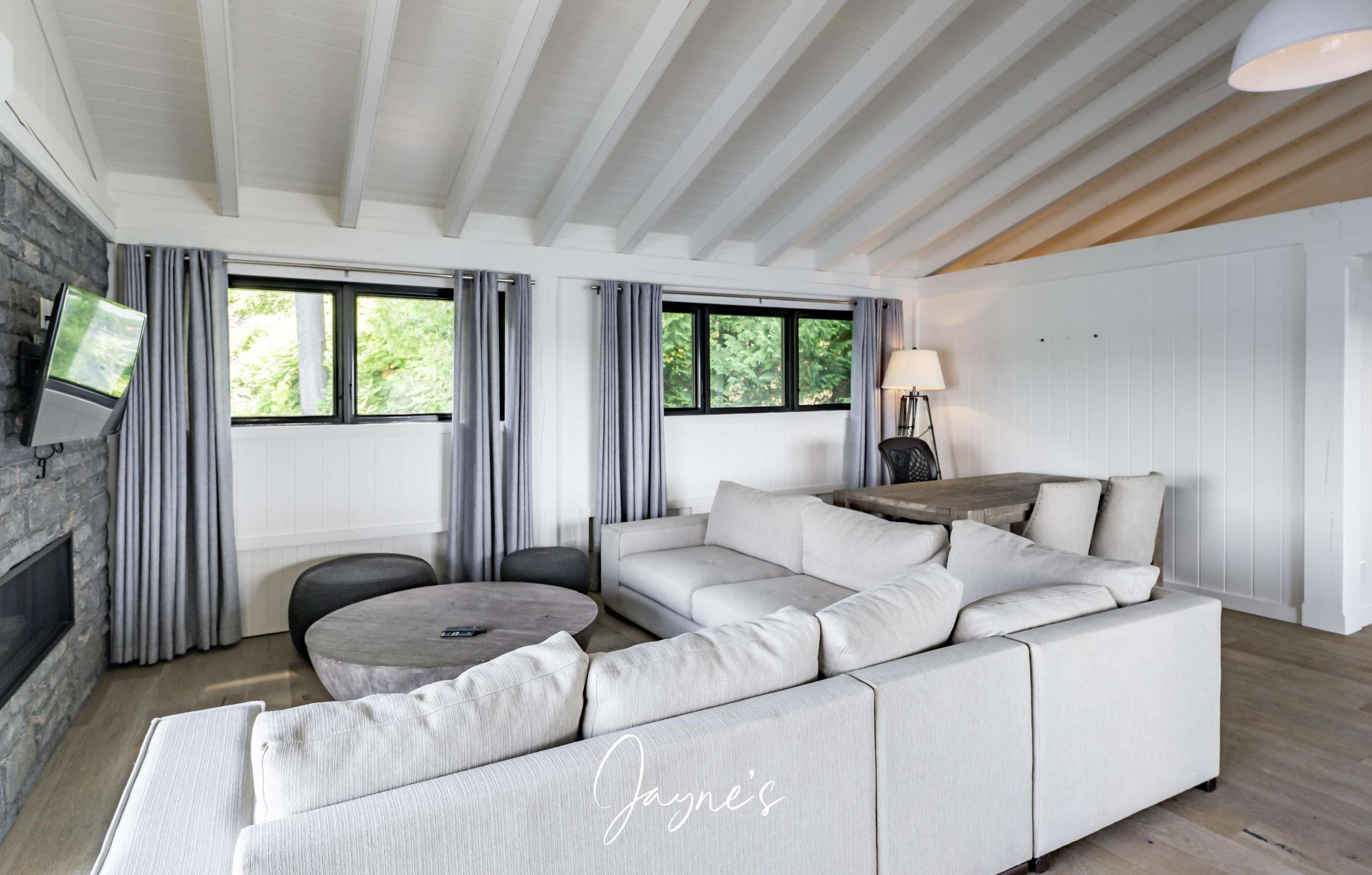Spacious with modern furniture. A lovely stone gas fireplace and TV with floor to ceiling windows with walkout to deck.