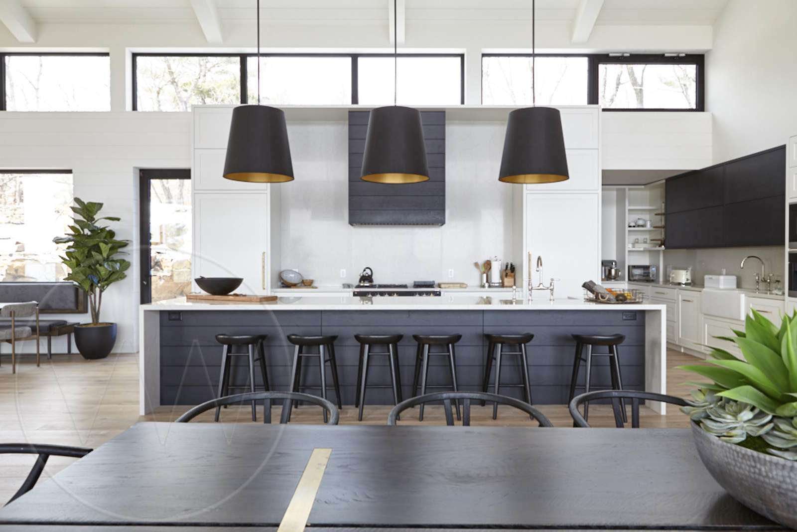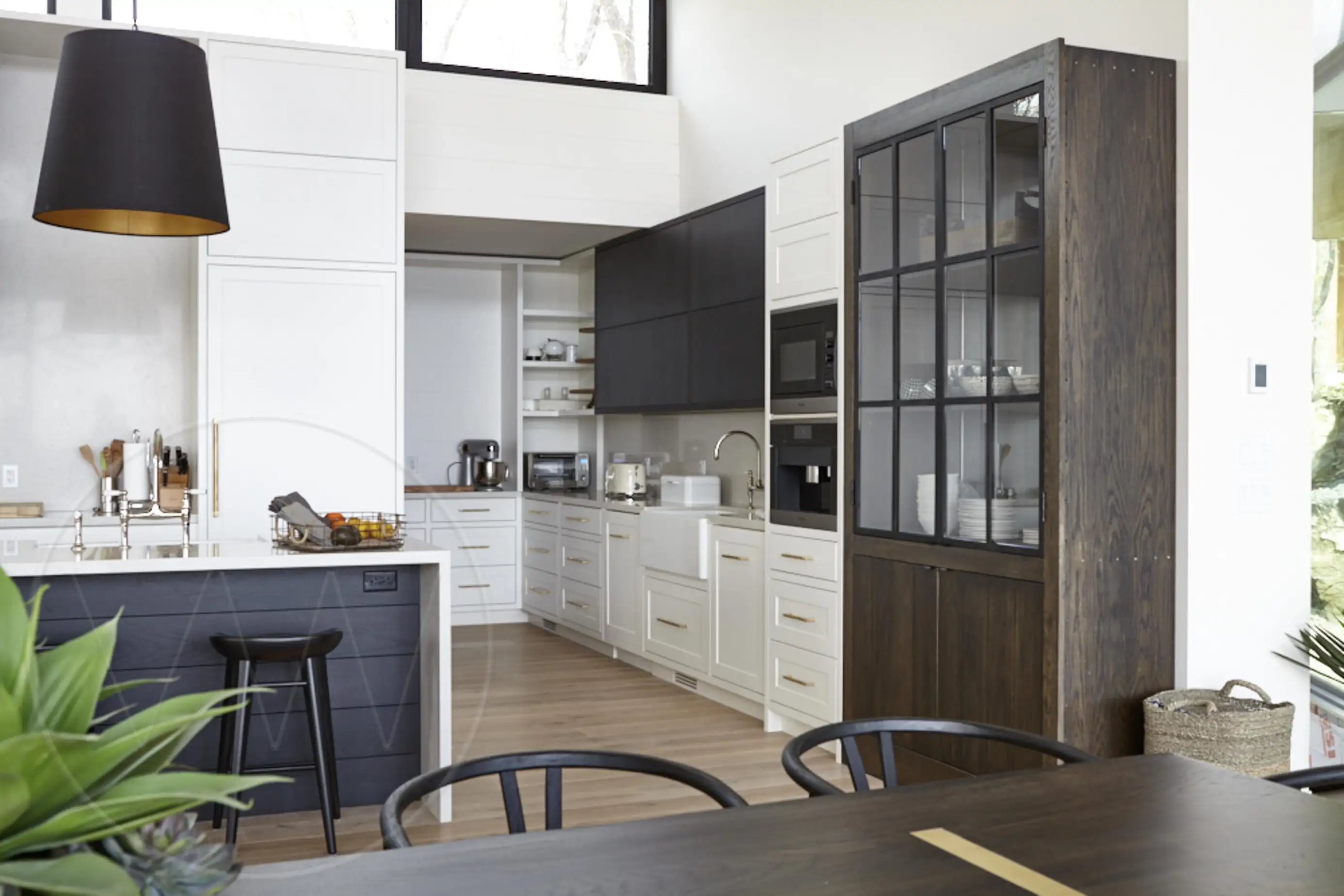 Expansive open concept with high-end appliances including a chef's pantry, deli fridge, two dishwashers, gas stove with griddle, cappuccino machine, large quartz top island with seating for 6 and a separate breakfast nook with bench seating