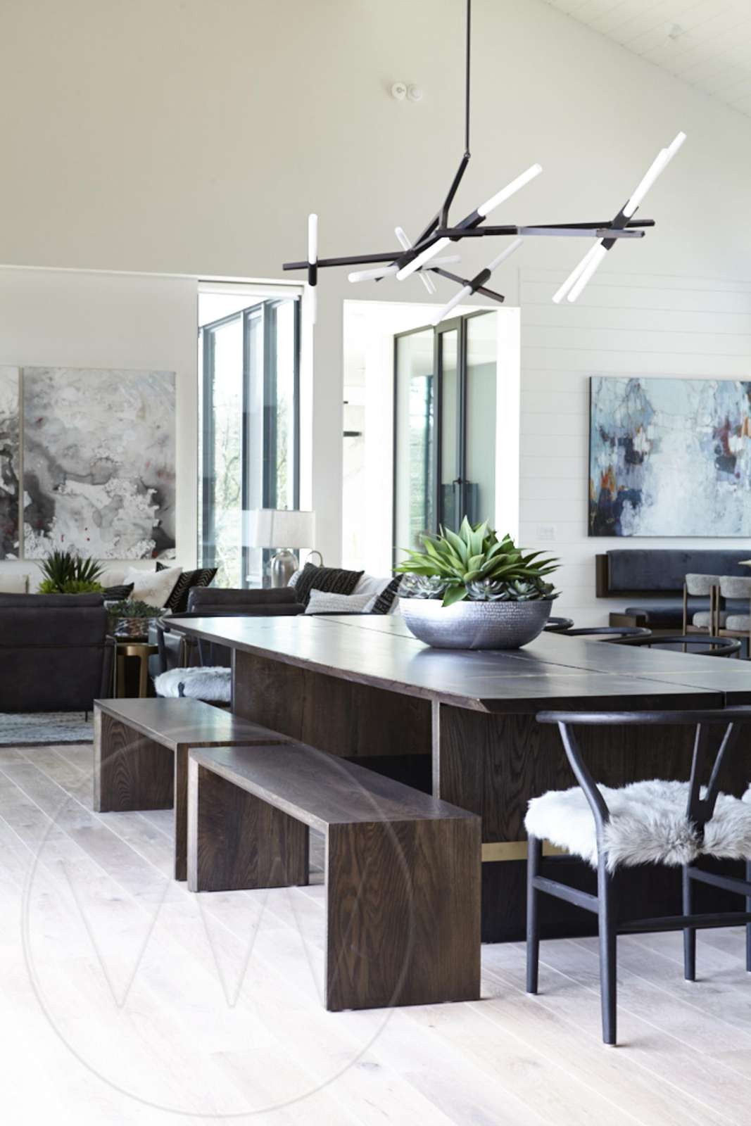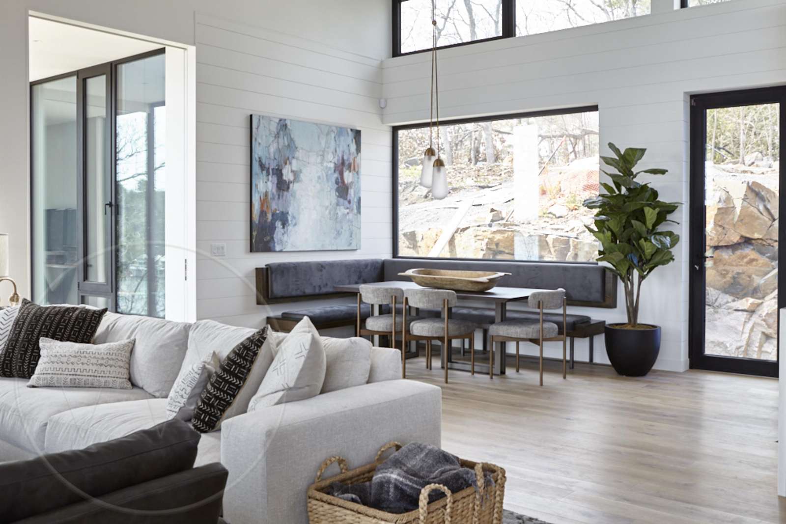 Open concept with floor to ceiling windows, seating for 14 and a walk out to deck