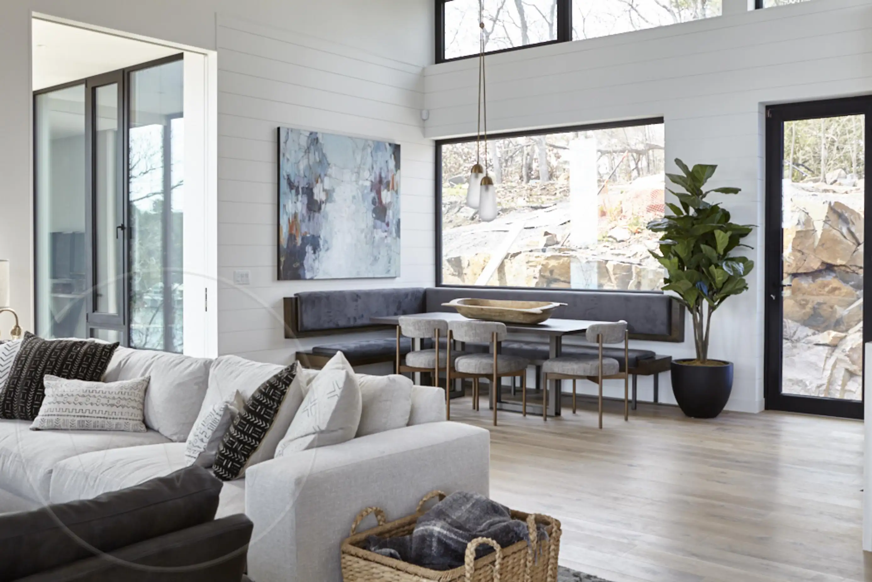 Open concept with l-shaped sofa, TV, and a dining area for 6
