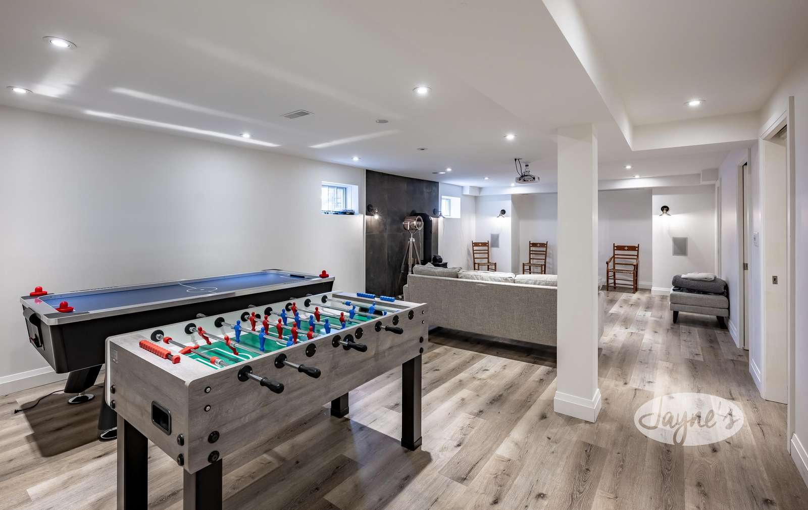 Couch, wood-stove, chairs and table, projector and screen, game tables.