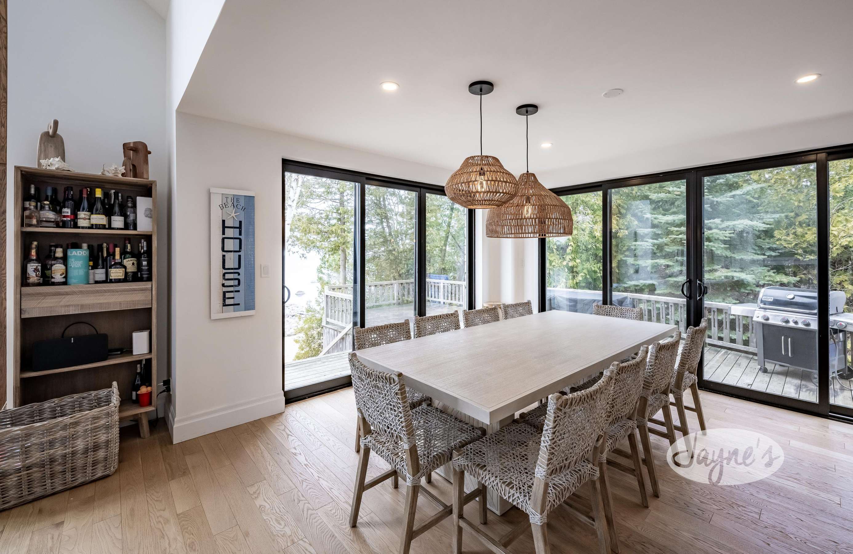 Open concept dining room with seating for 10, walkout to deck.