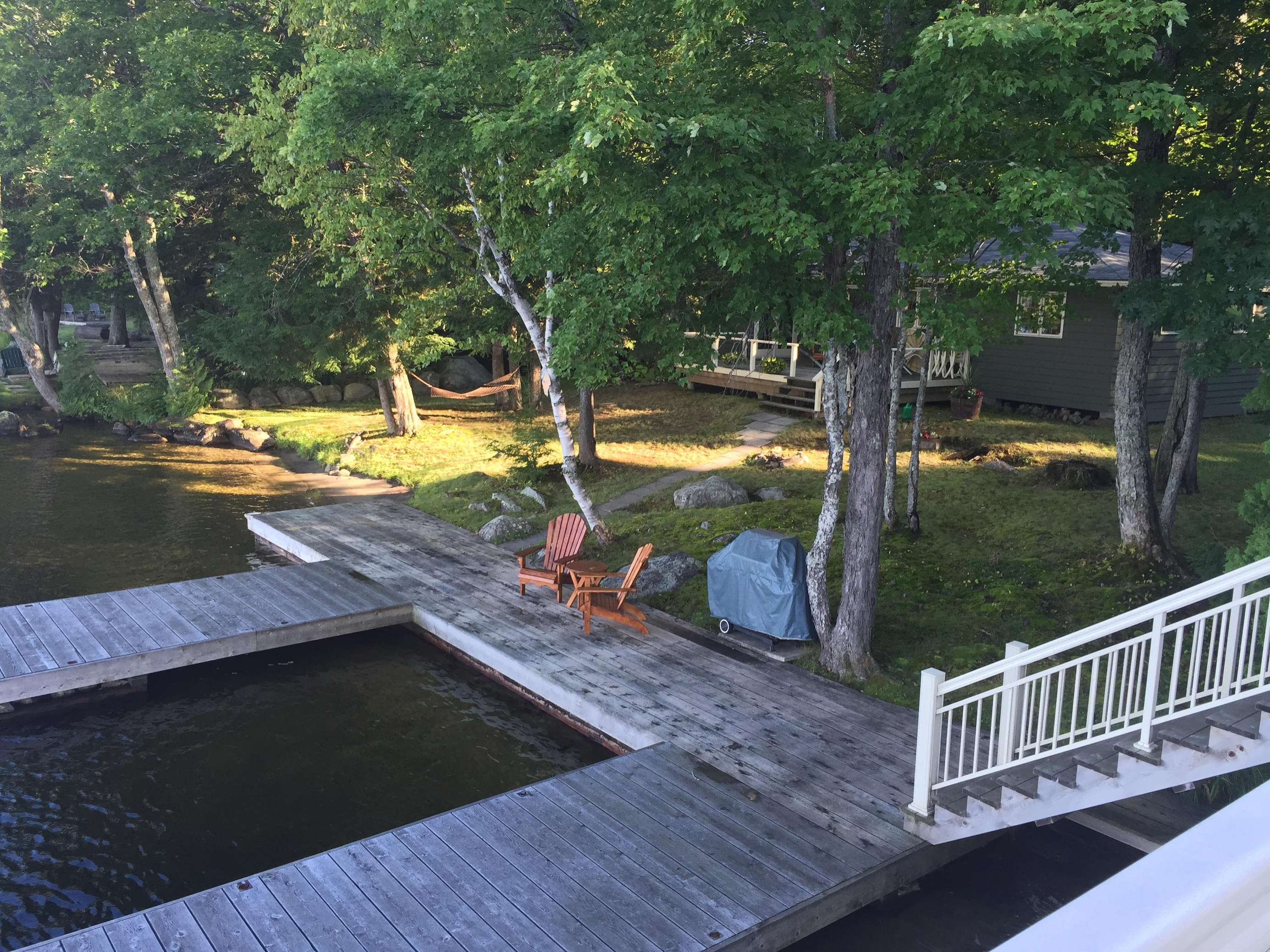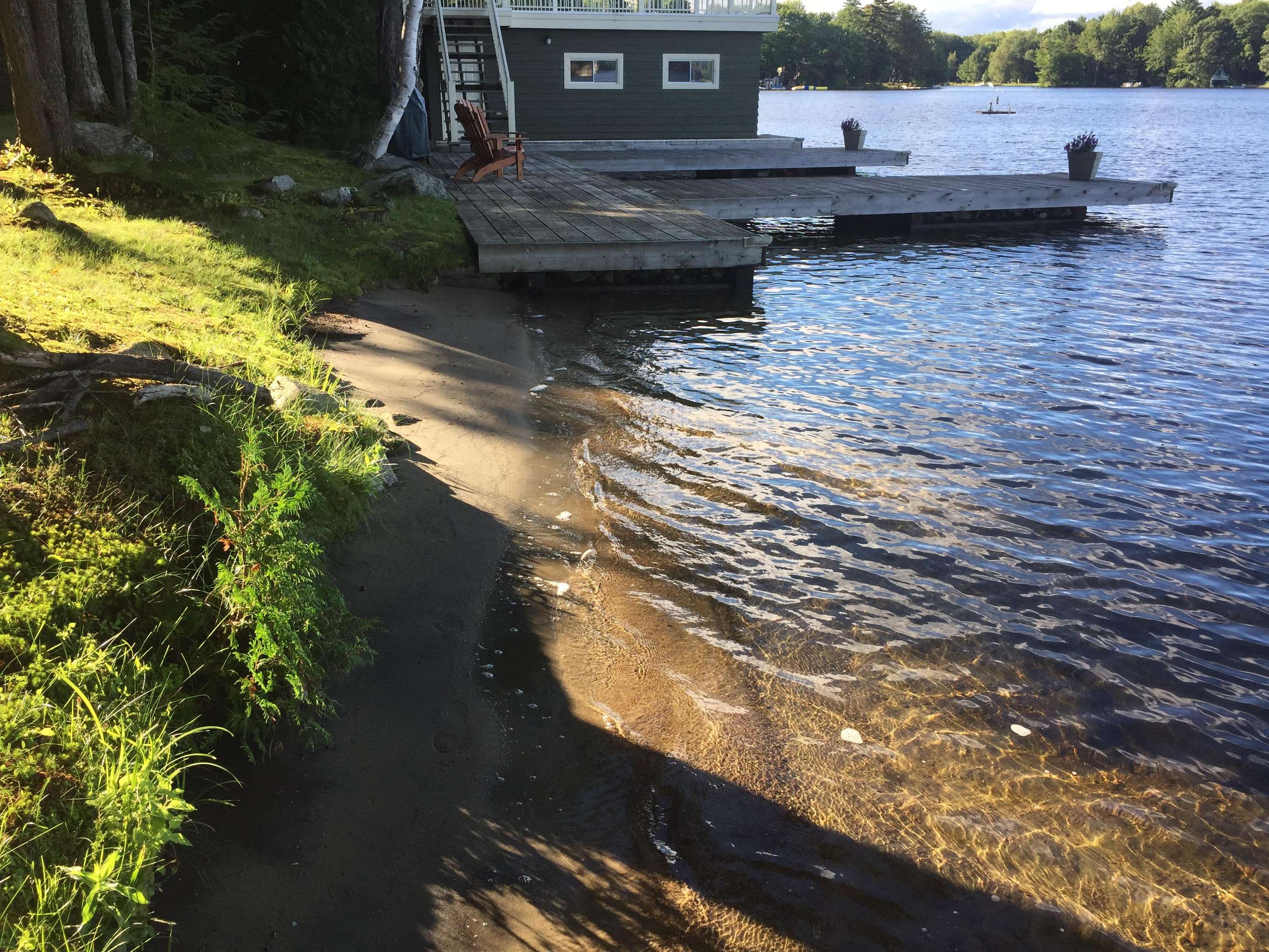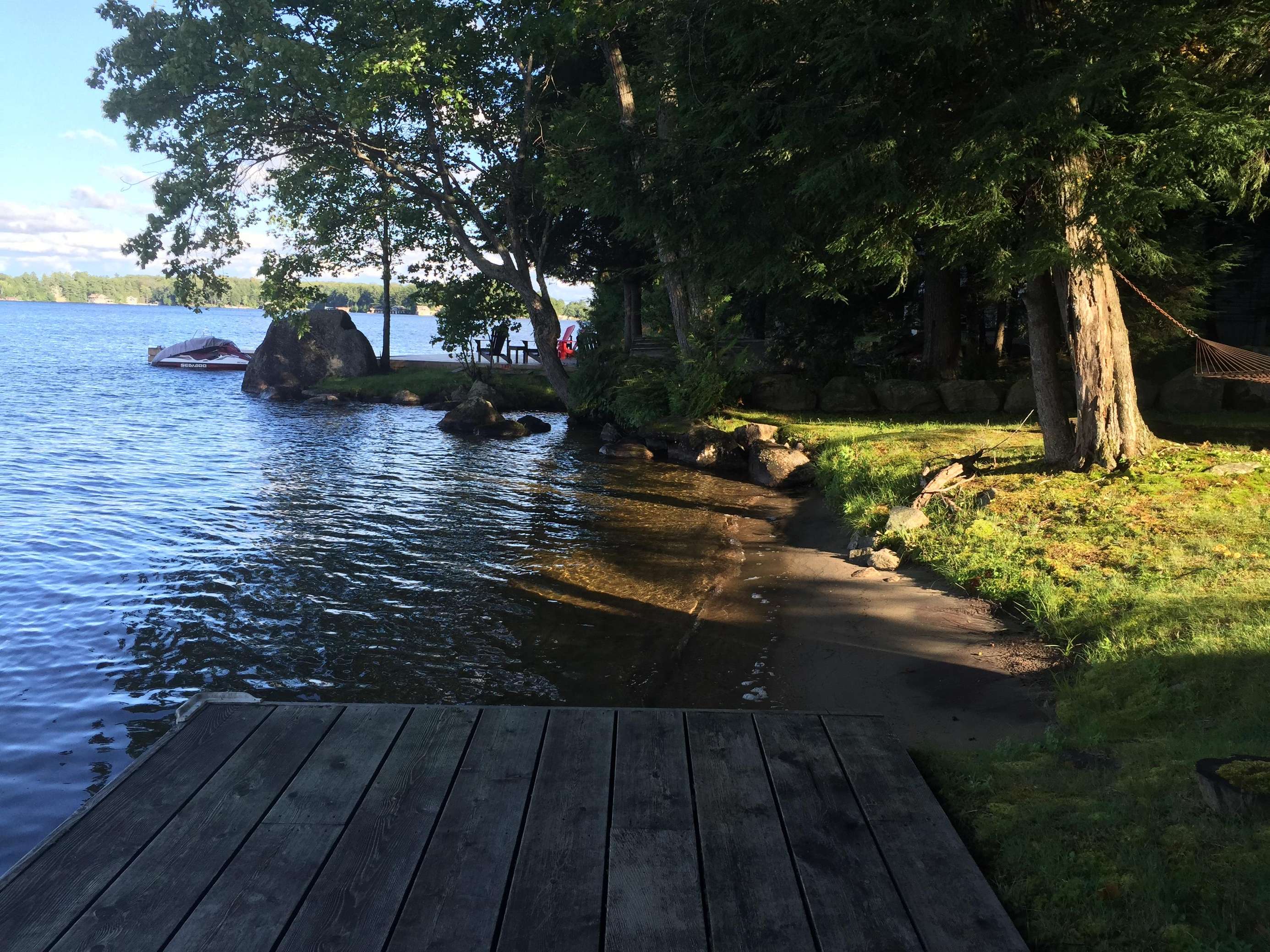 SERENITY BEACH is a great family cottage! 150' lake frontage. Flat tableland make this cottage great for the young and young-at-heart. Soft grassy lot with enough depth before the shore line for the young to play about. Rooftop sundeck. The water at the end of the dock is 8 feet deep and there is a nice hard-packed sand beach about 40' long which runs over the dock area. The beach is great for easy water entry and swimming for the young. Relax in the hammock as the day draws down then enjoy the evening by the waterside fire pit.