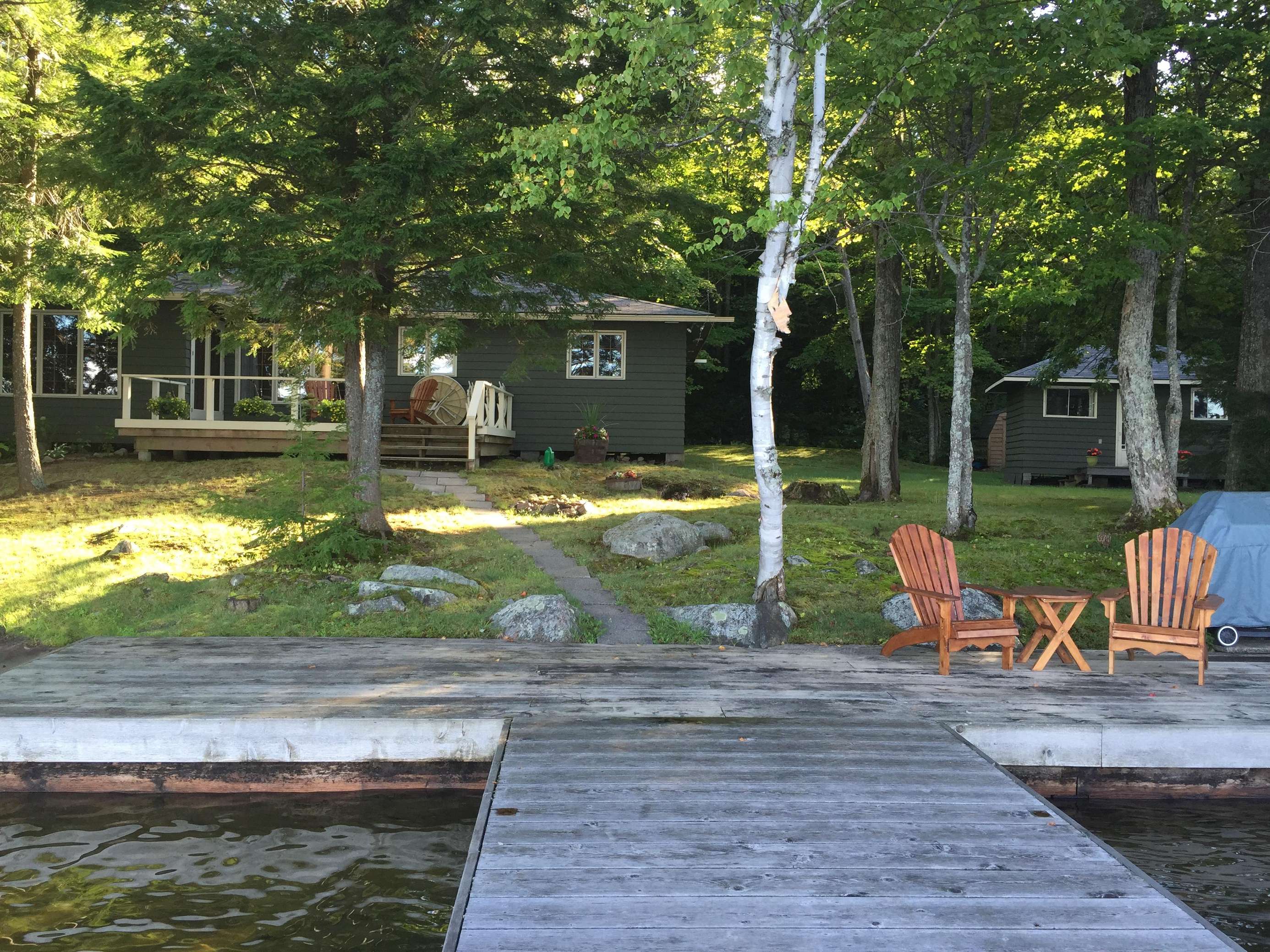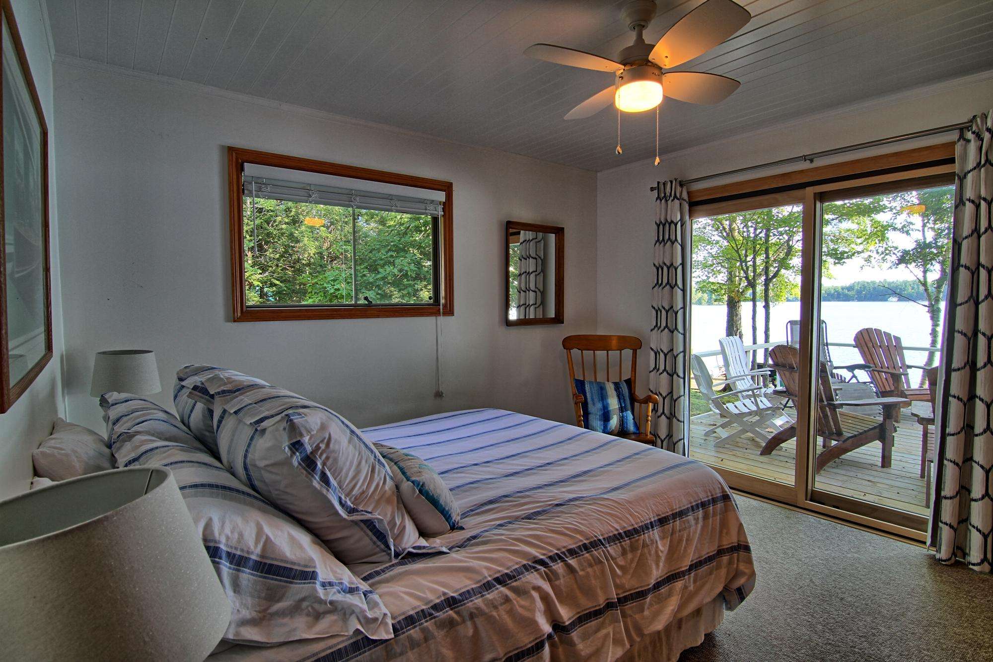 Newly renovated interior! Clean and nicely-appointed 4 bedrooms 2 baths in main cottage and 1 bedroom, 1 bath Guest Cabin. Fully-equipped kitchen with island and 2 bar stools, wood-burning fireplace, dining area to seat 8. Satellite TV in Great Room. Deck off cottage with Muskoka chairs and small dining table. 1 bedroom off Great Room, 3 bedrooms down hallway. Each bedroom has good closet space. The Primary bedroom located at front of cottage with view of lake. Bathroom in bedroom wing has tub/shower combination. Other bathroom with shower by entry hall. Guest Bunkie hosts a Queen bedroom and bathroom and freshly painted white. Dock area has more Muskoka chairs.
