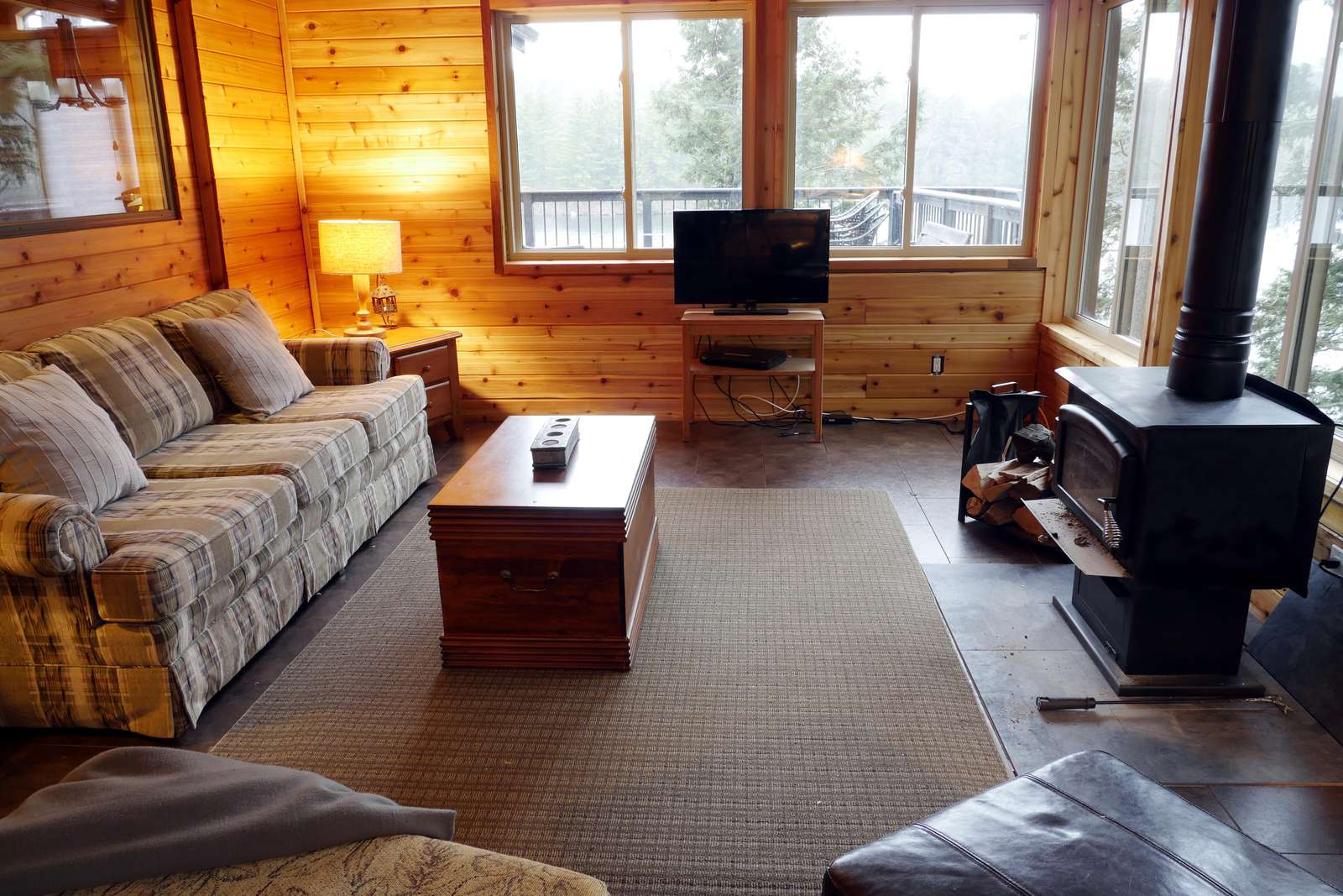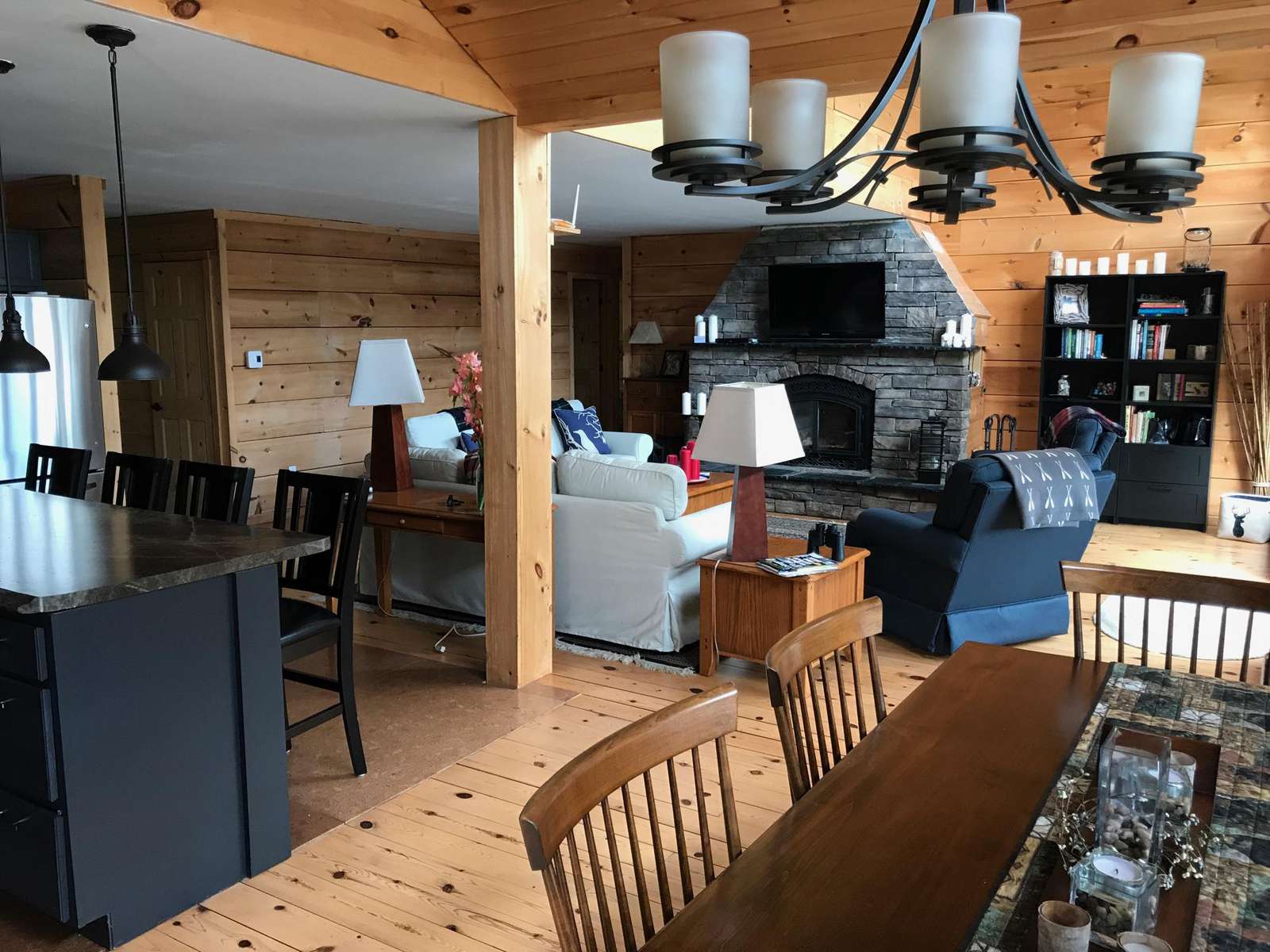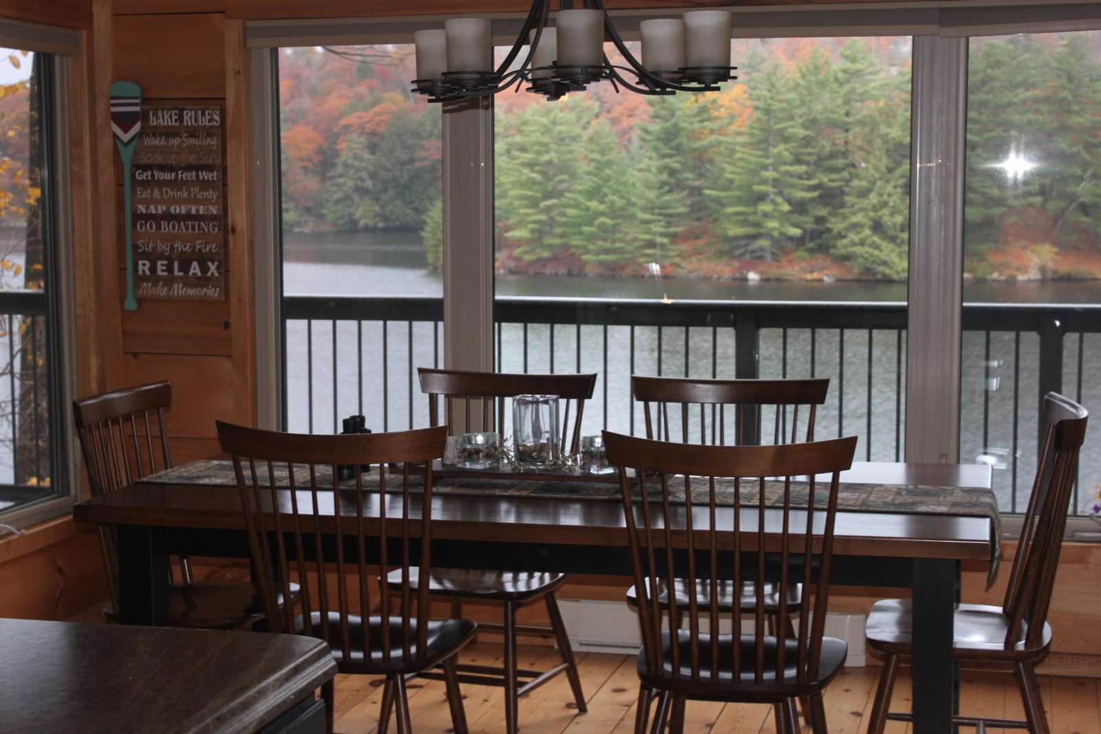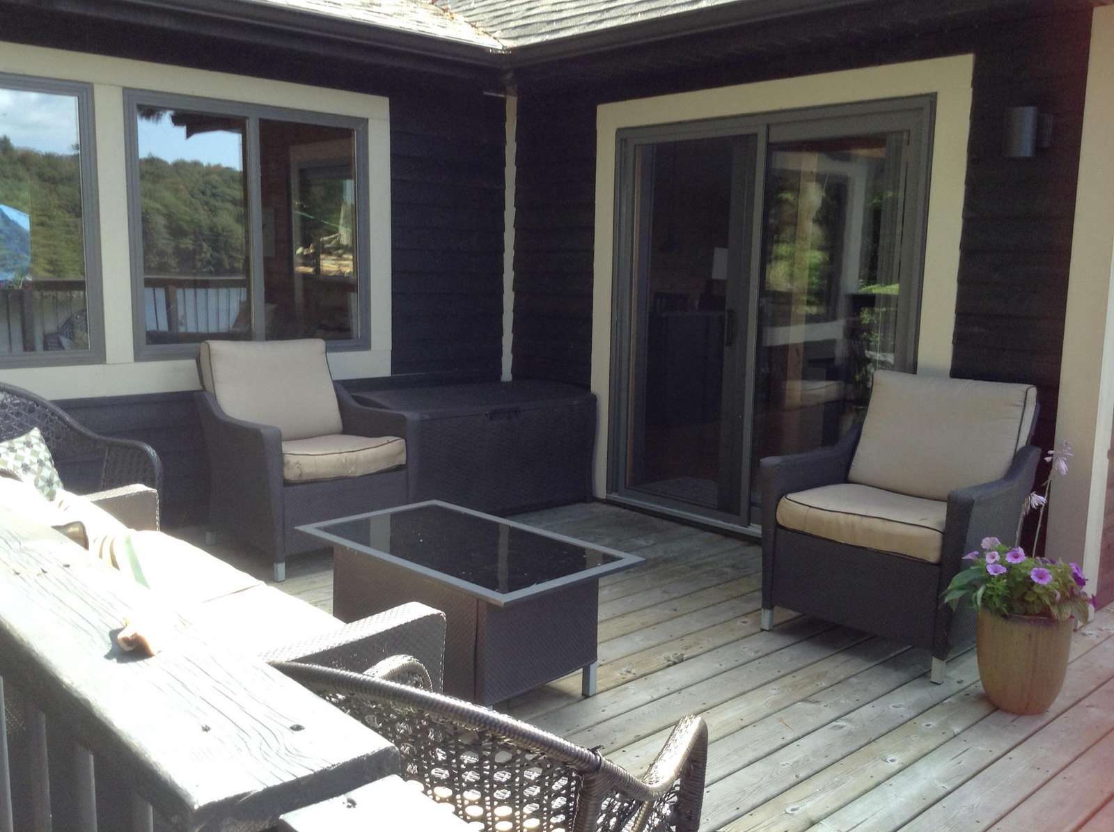 Step into this lovely cottage with large wall of windows and deck that runs across the lake side of the Great Room. The focal point of the Great Room is the beautiful fireplace with TV (with satellite) above surrounded by comfortable seating. The kitchen is updated with stainless appliances and island with 4 bar stools. The dining room table comfortably seats 8. Off the kitchen is the Muskoka room, a screened in room to collect the fresh breeze but stay protected from bugs. There is also a TV (with satellite) in the Muskoka Room. The deck has a table, chairs, sitting area and a lounge chair. 4 bedrooms are on the main floor, including an ensuite and full bathroom. Walk outside from the deck to the lower level and you will find the "Bunkie". There are 2 bedrooms and a hallway between all facing the water. Both bedrooms have a queen bed - great for a visiting family. In the middle, there is also a 2-piece bathroom.