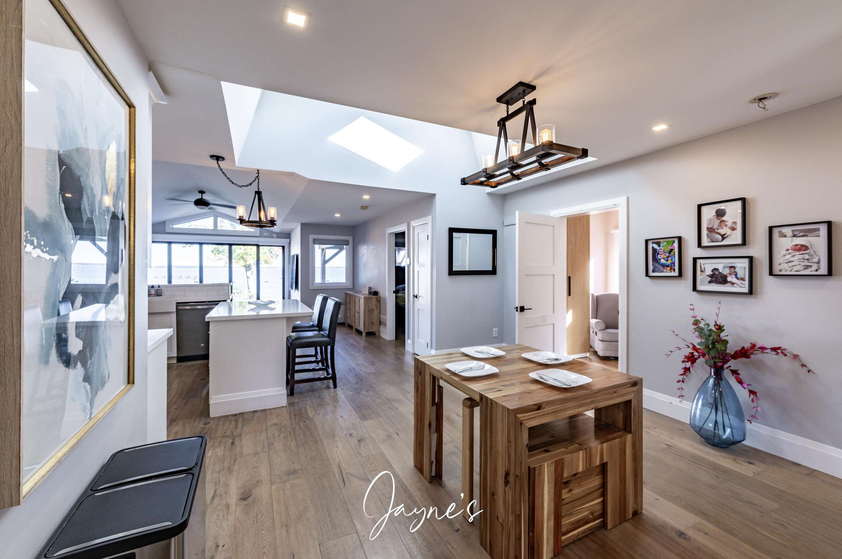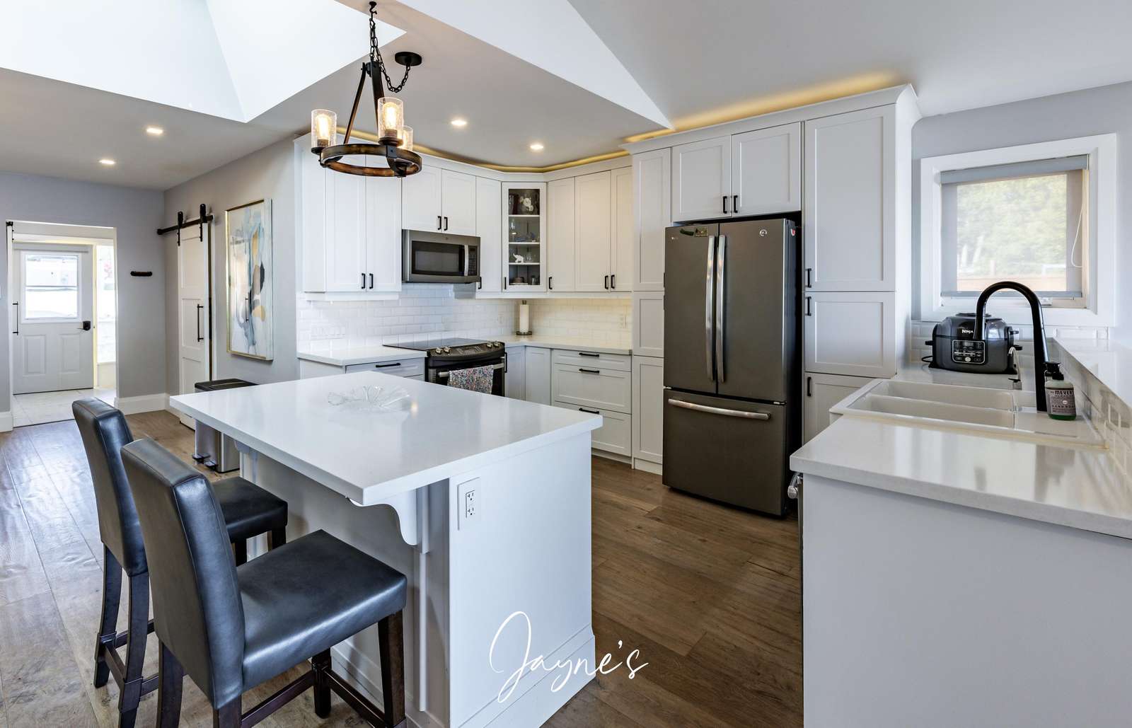 -Open concept kitchen with stainless steel appliances, island with 2 stools