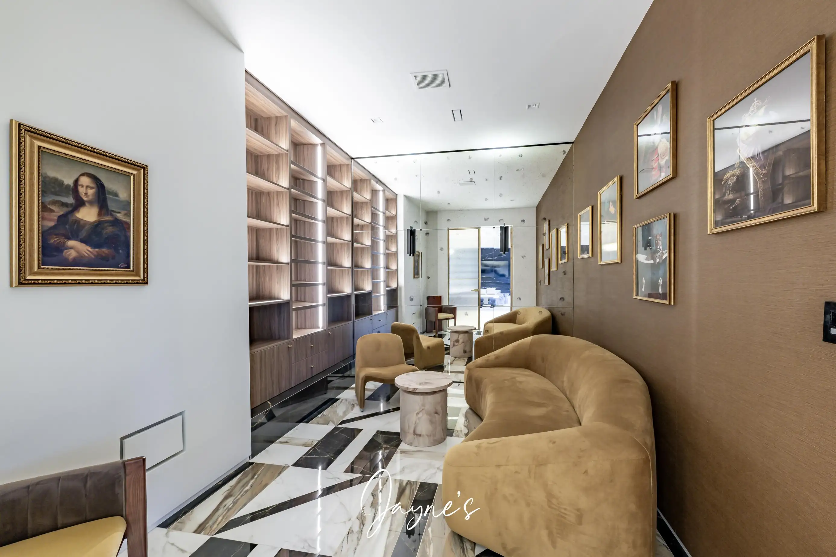 Built in shelves, mirrored wall, a chair and 3 seater sofa