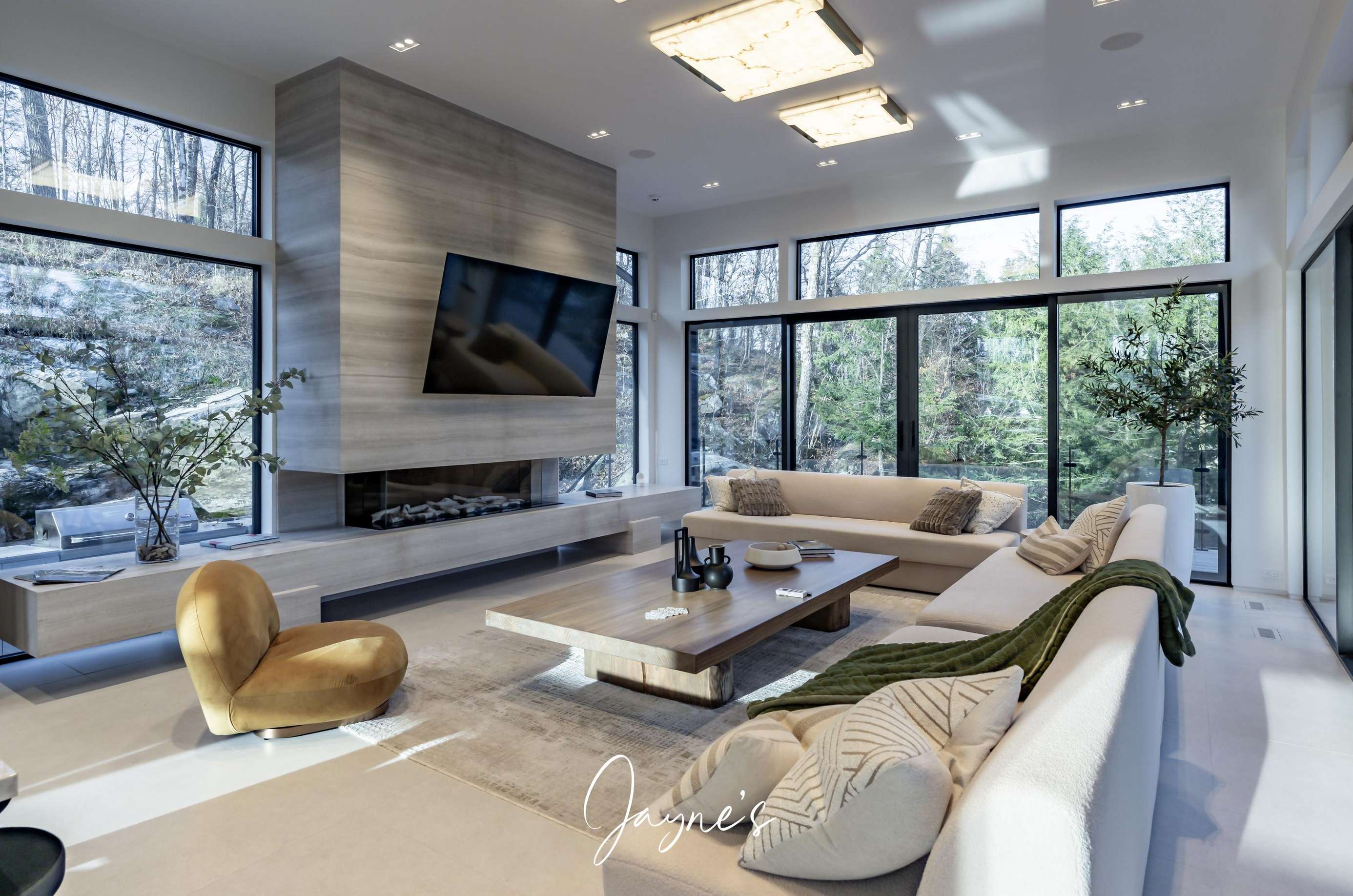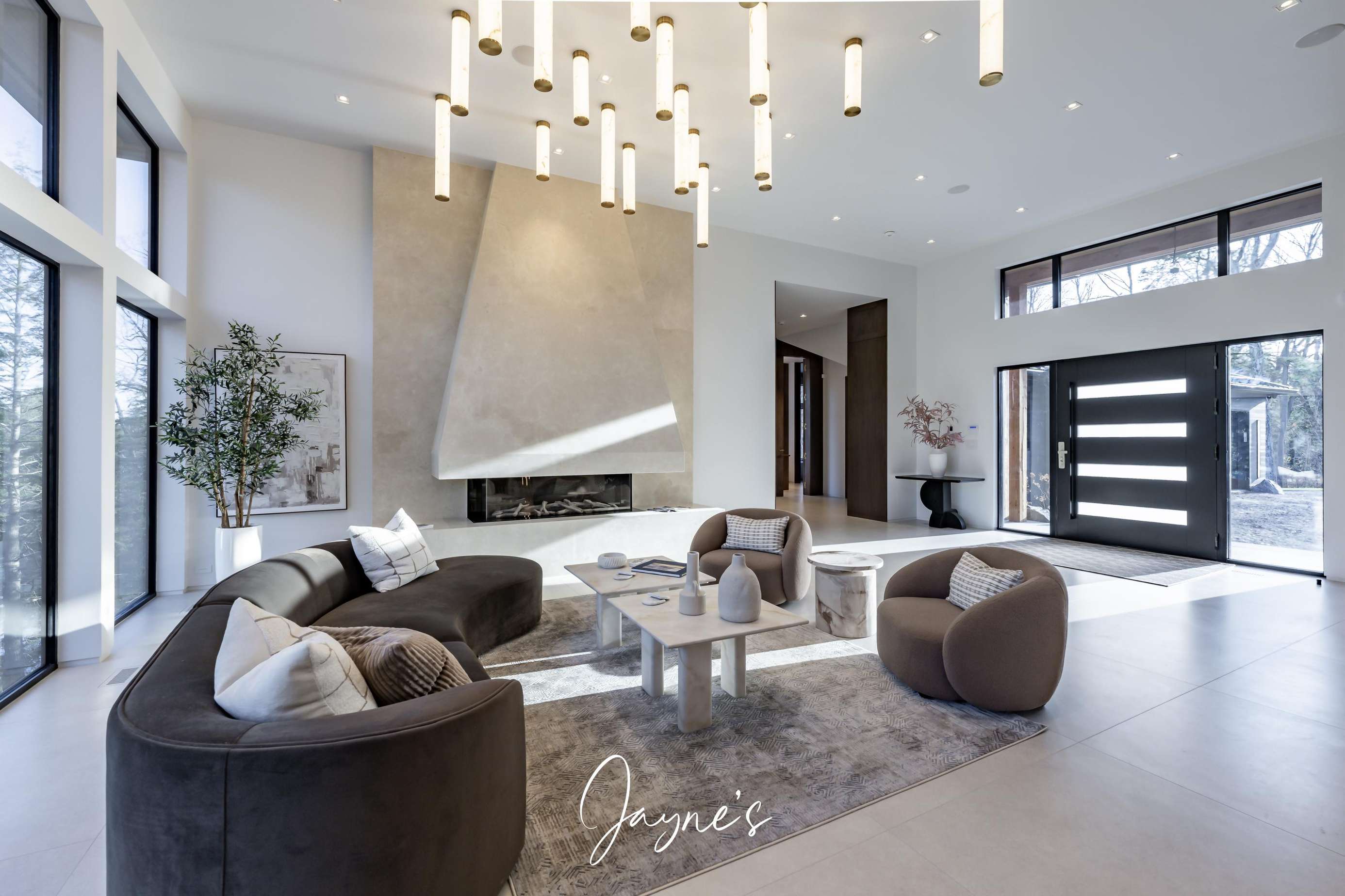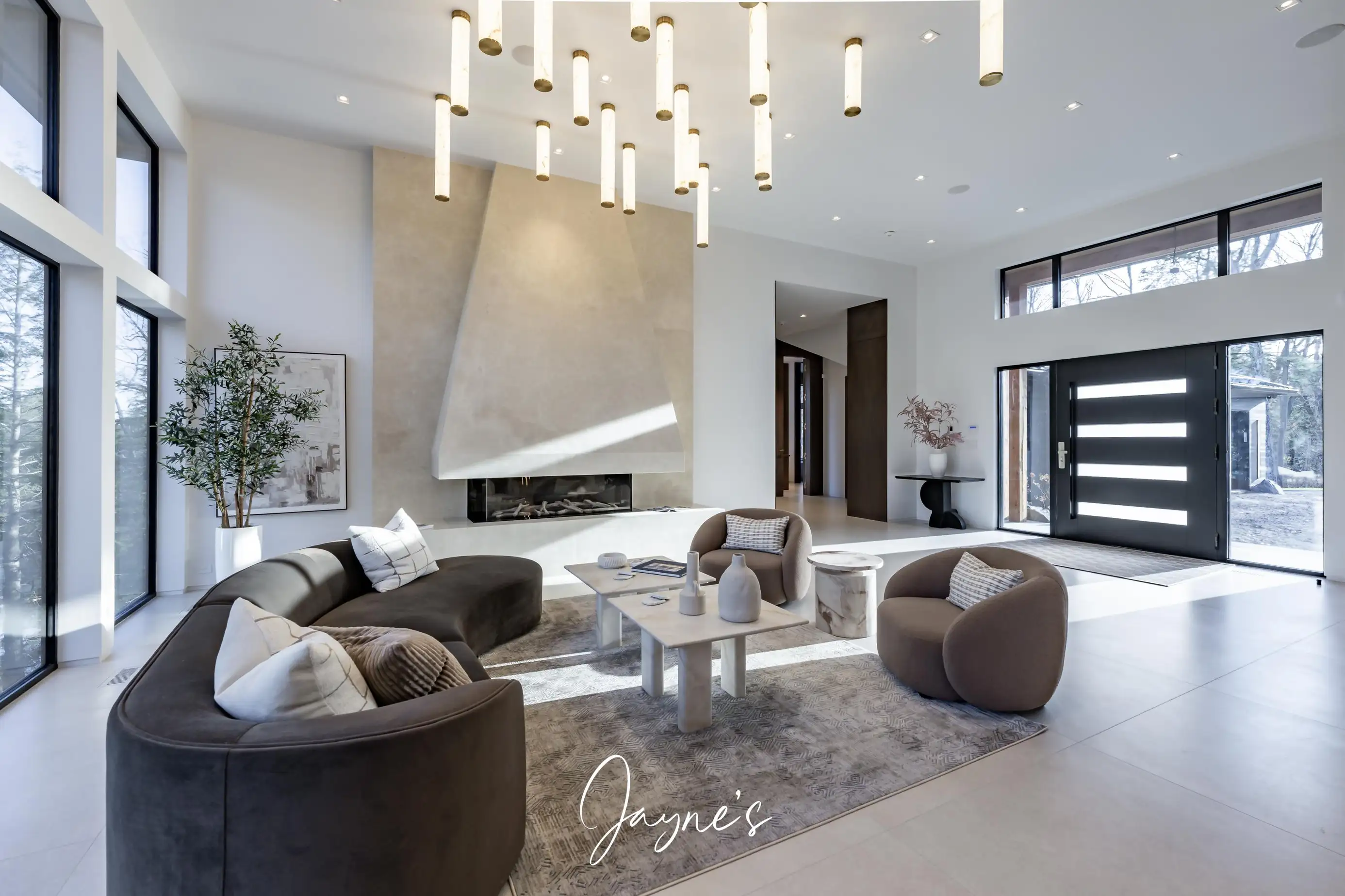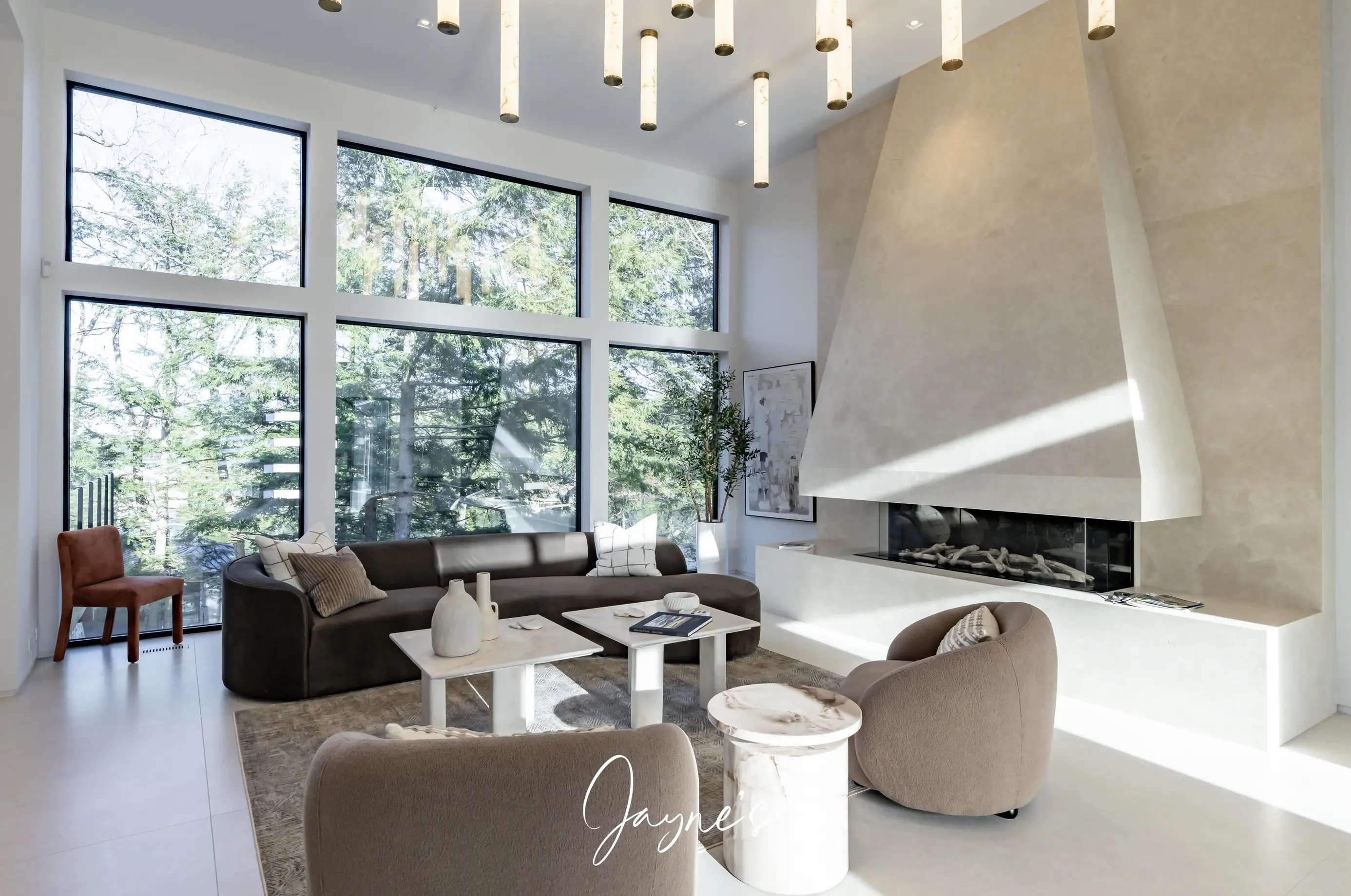 Open concept with high ceilings and large windows, long chaise lounge, 2 chairs and gas fireplace