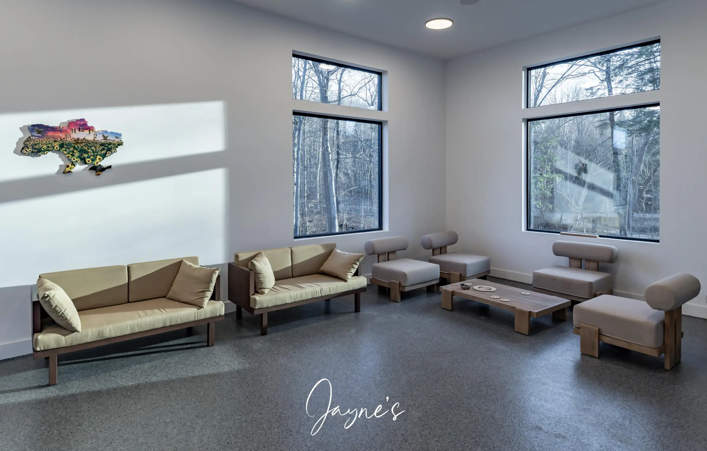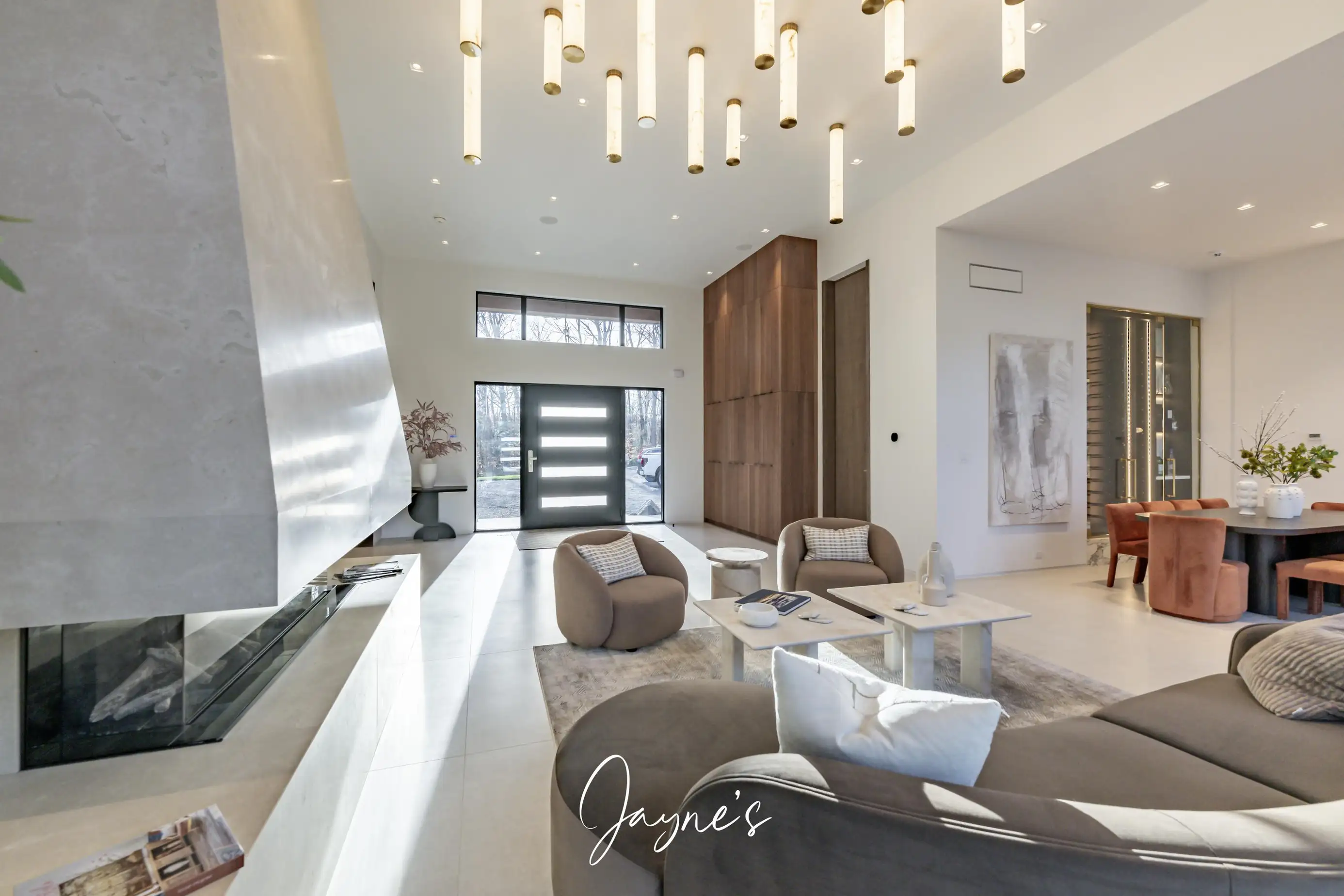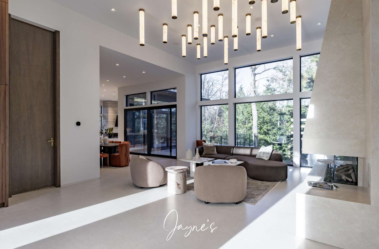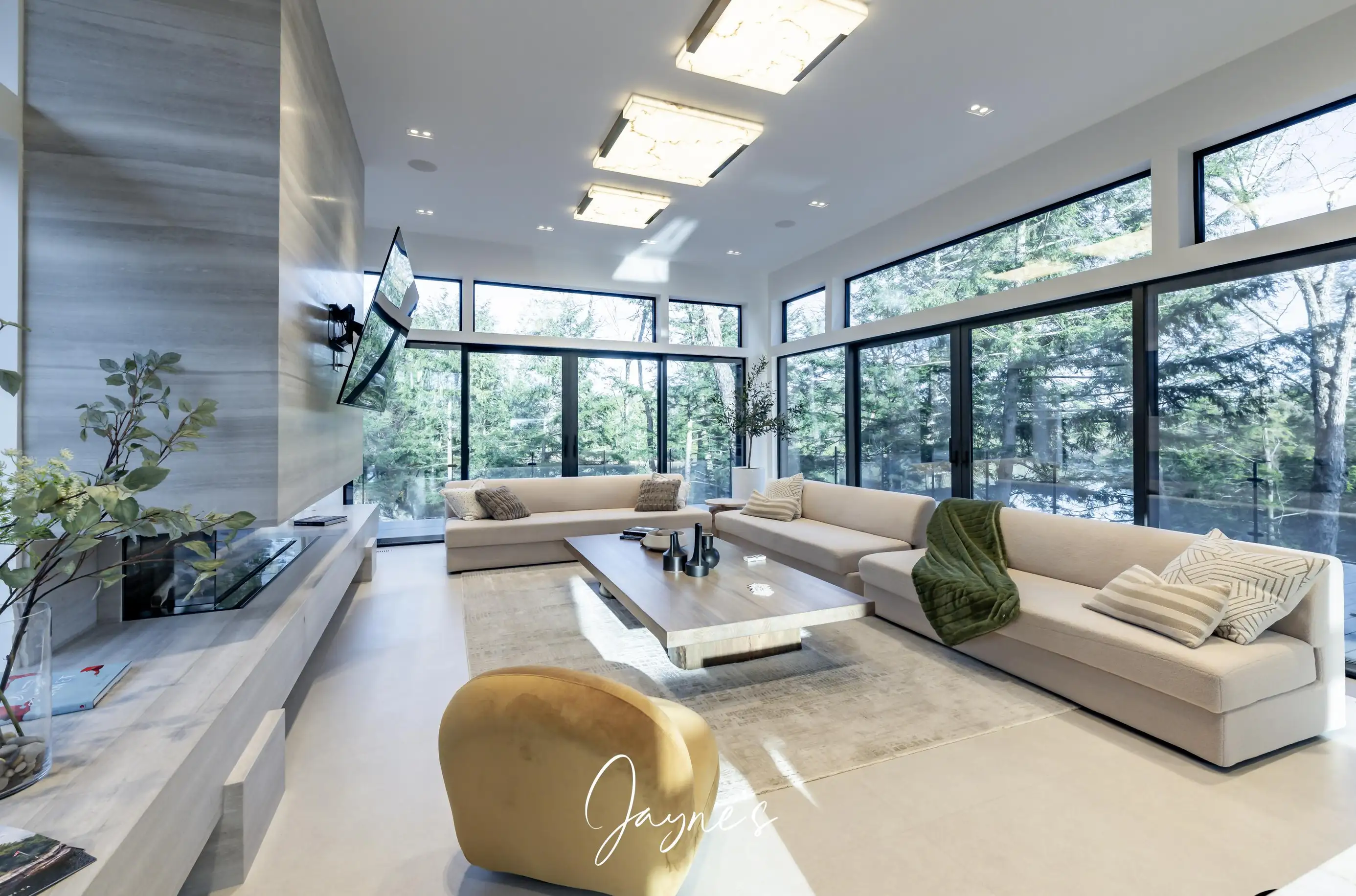 Open concept with high ceilings and large windows, long chaise lounge, 2 chairs and gas fireplace