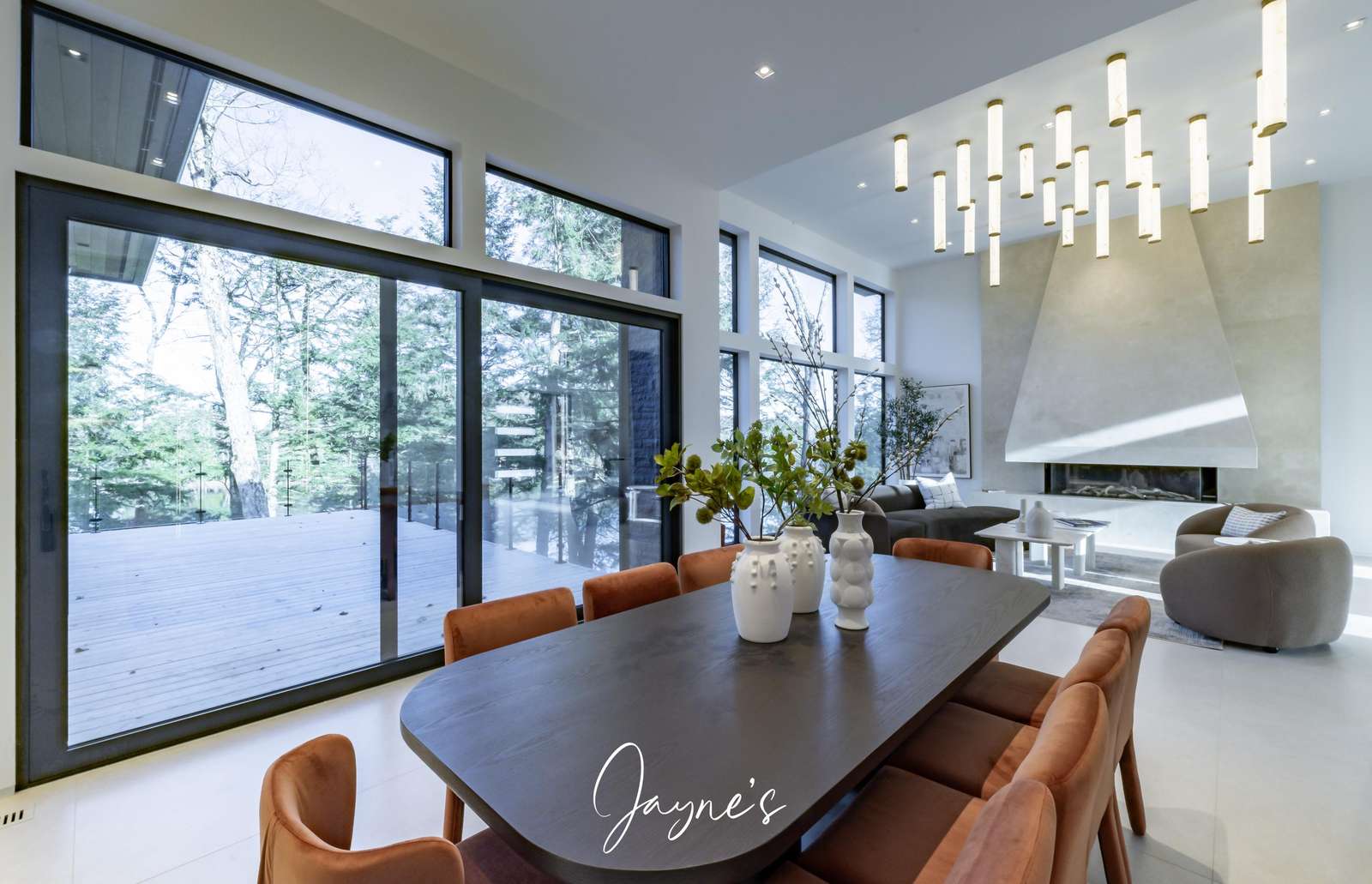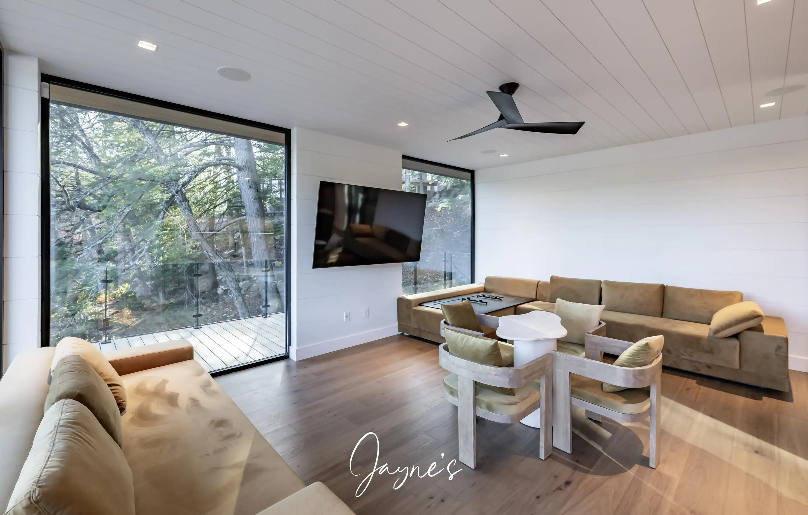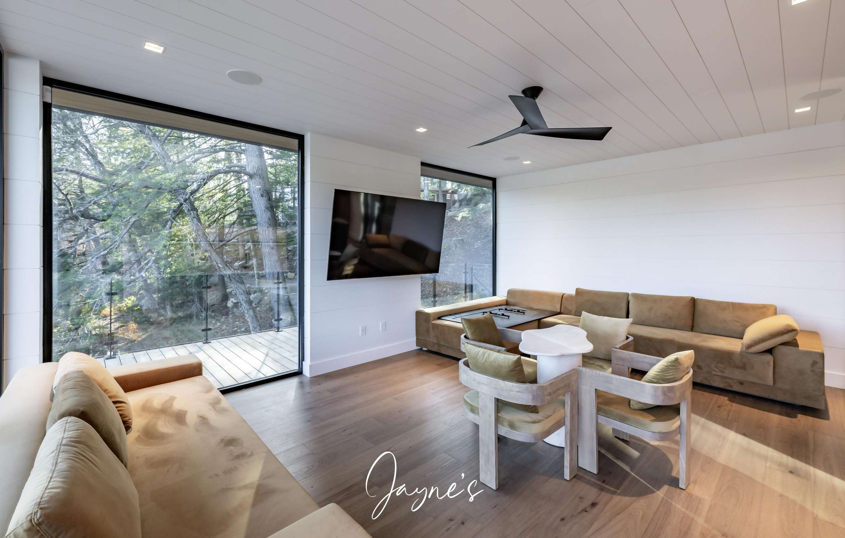 Spacious room with gas fireplace, TV, 6 seater sofa, 4 seater sofa, chair, high ceilings and walkout to deck with sliding doors