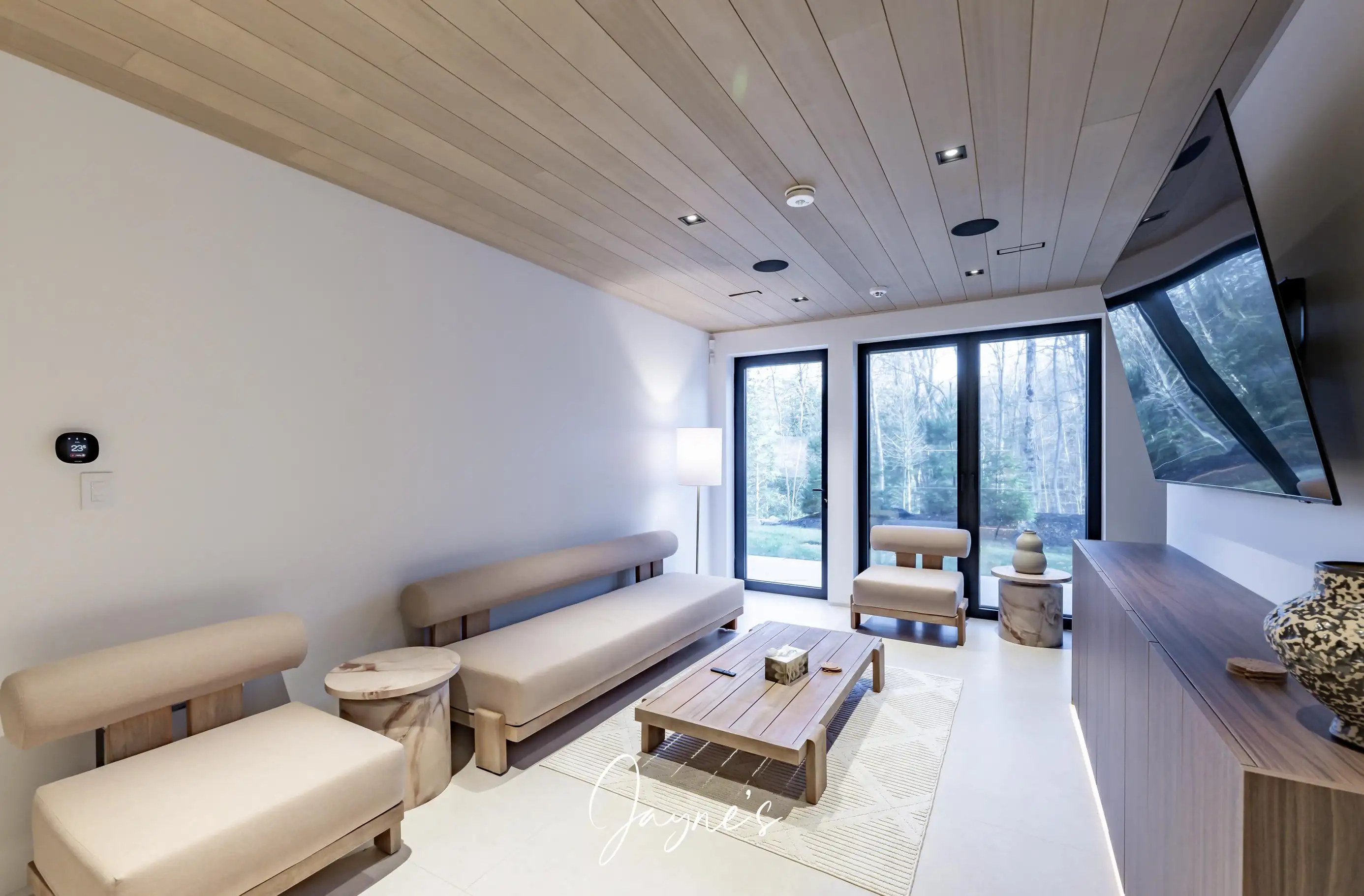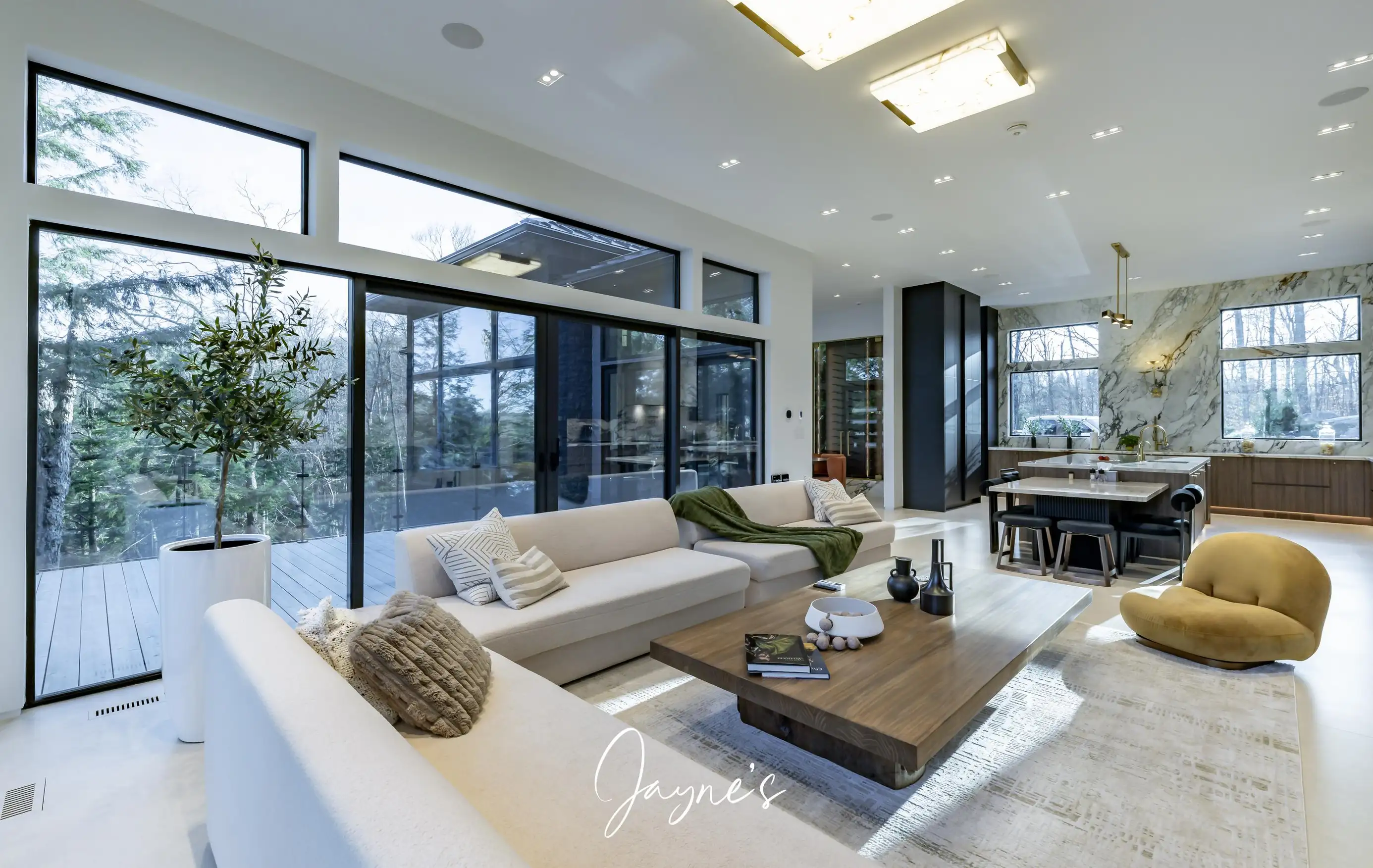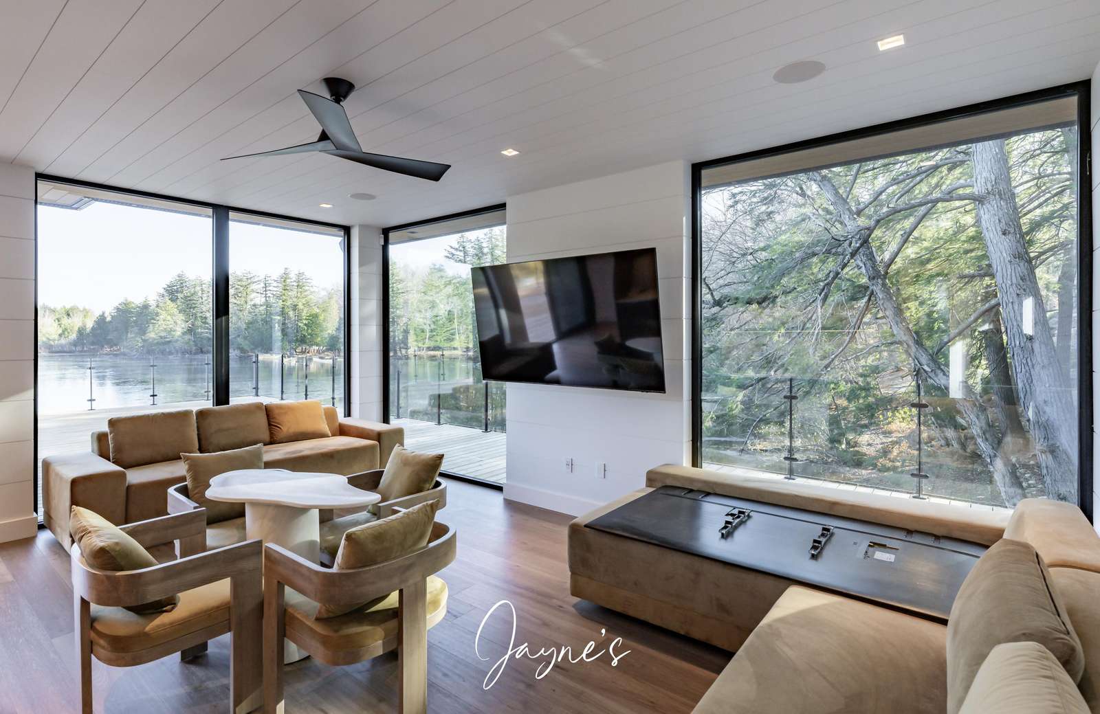 Spacious room with gas fireplace, TV, 6 seater sofa, 4 seater sofa, chair, high ceilings and walkout to deck with sliding doors