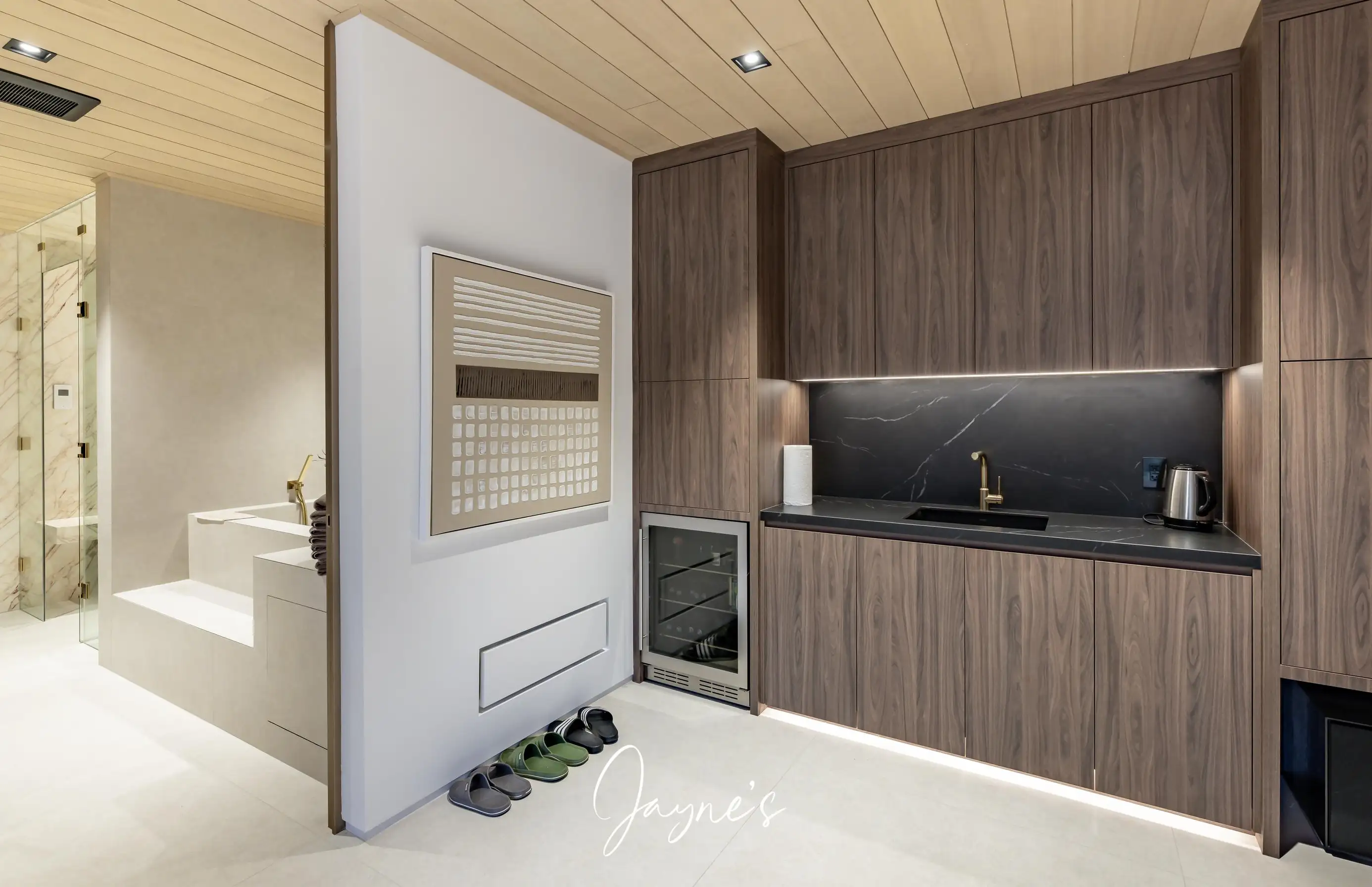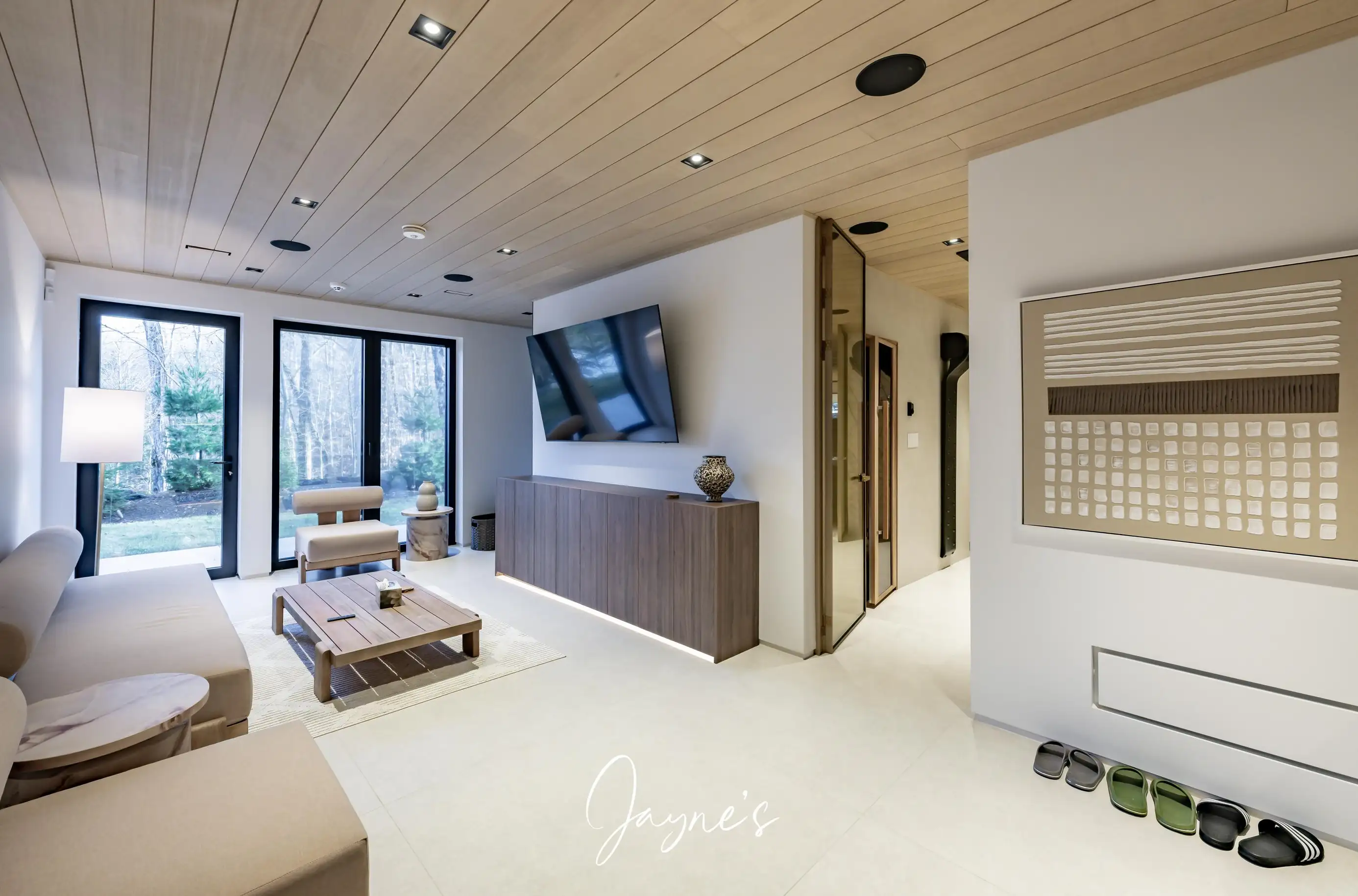 Large area with TV, 2 chairs, 4 seater sofa, wet bar with mini fridge connecting to 8 person sauna, spa tub, body dryer and steam shower