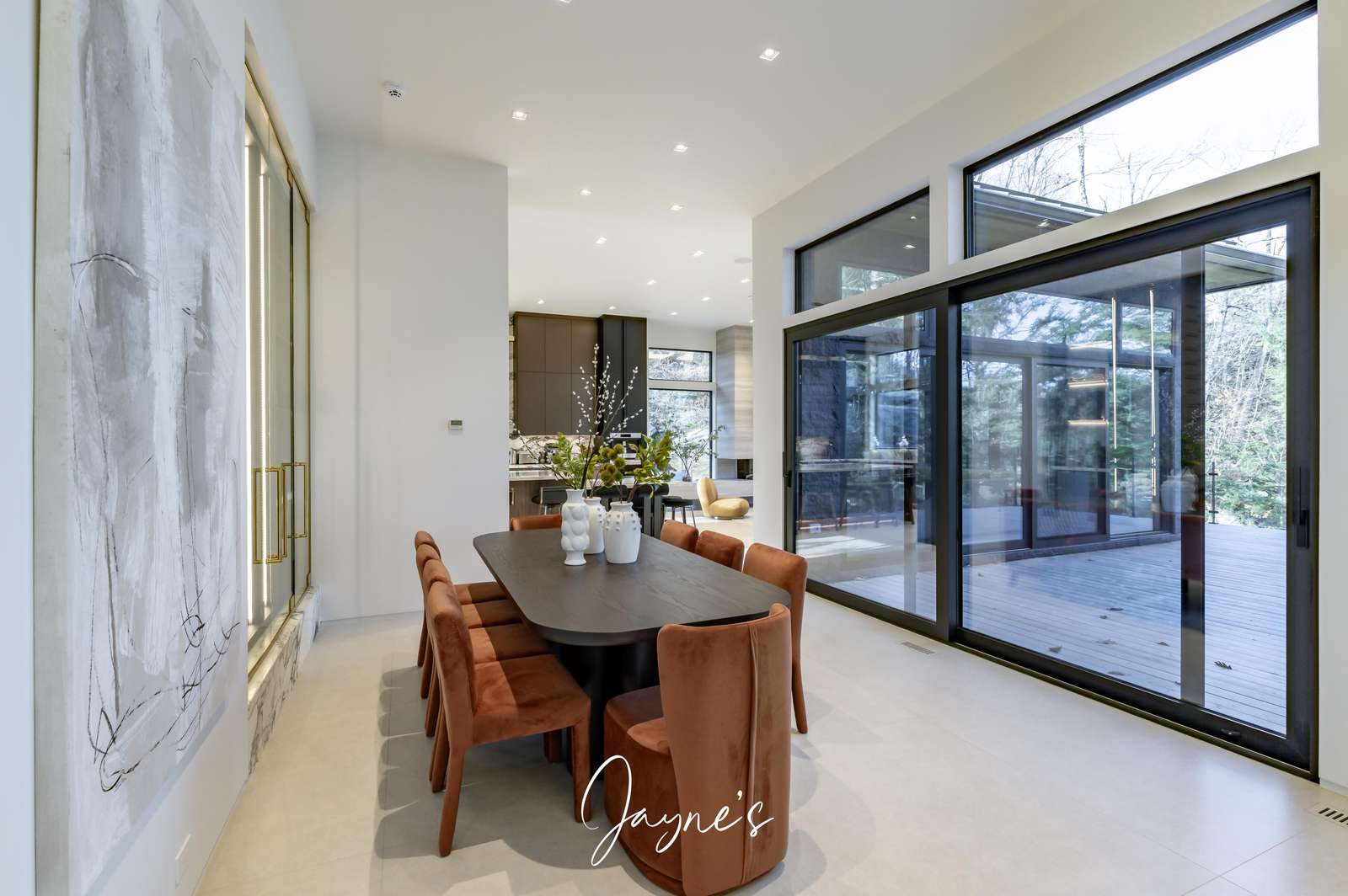 Bright open concept with seating for 10, wine storage and walkout to deck