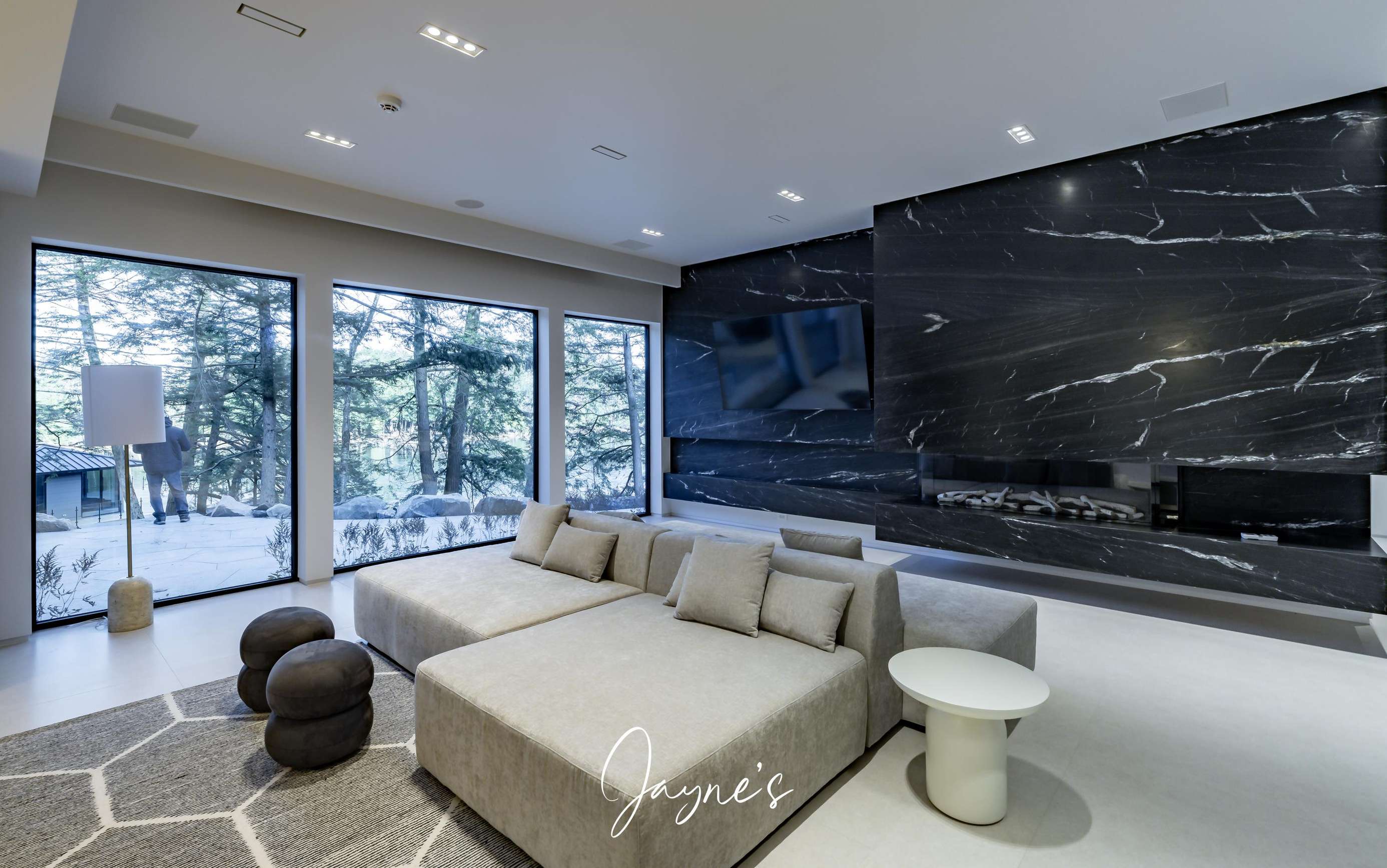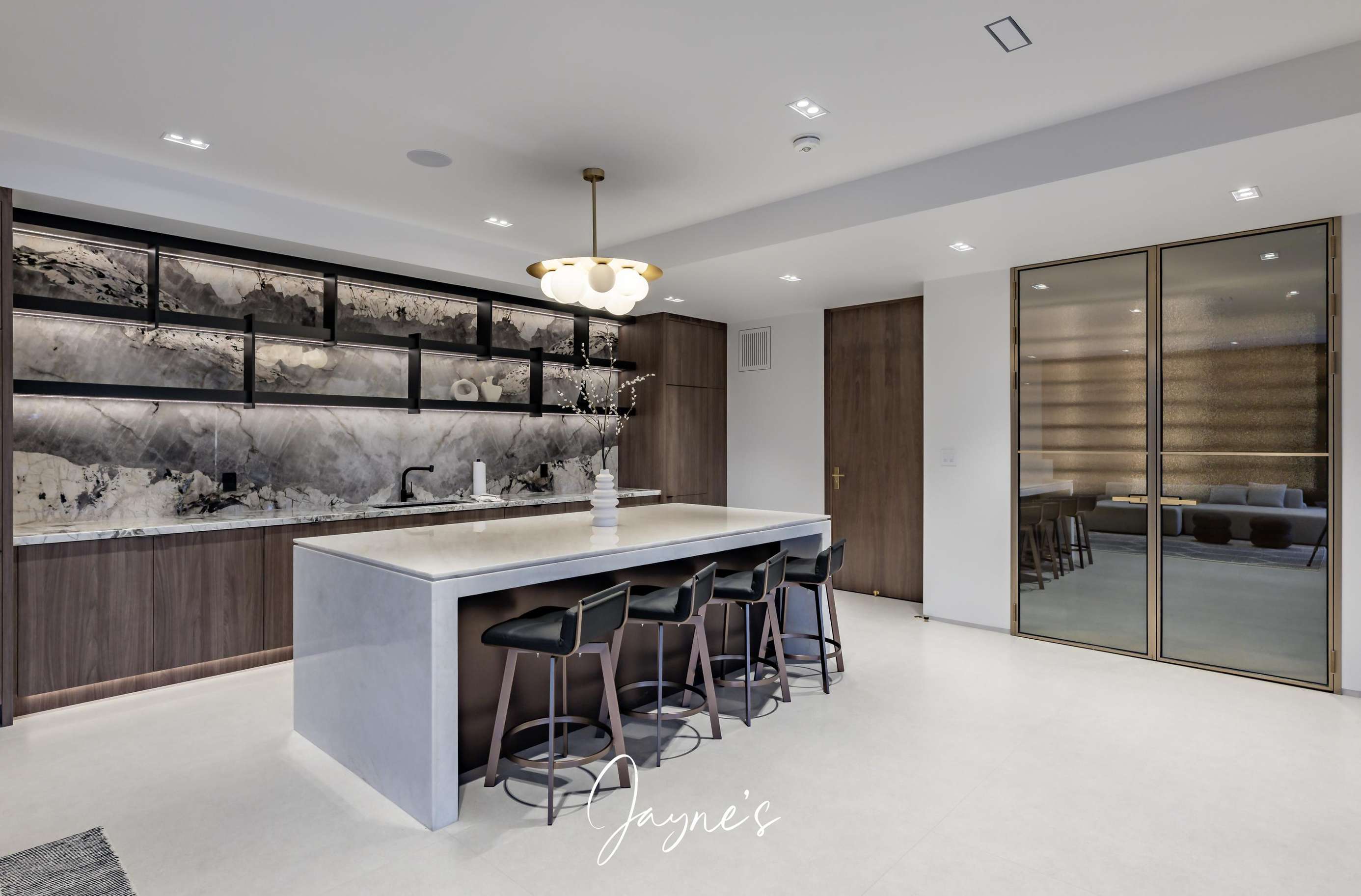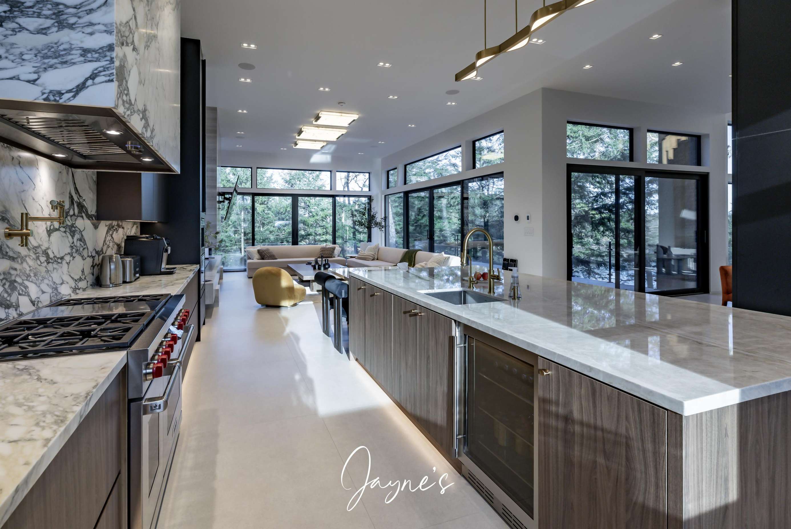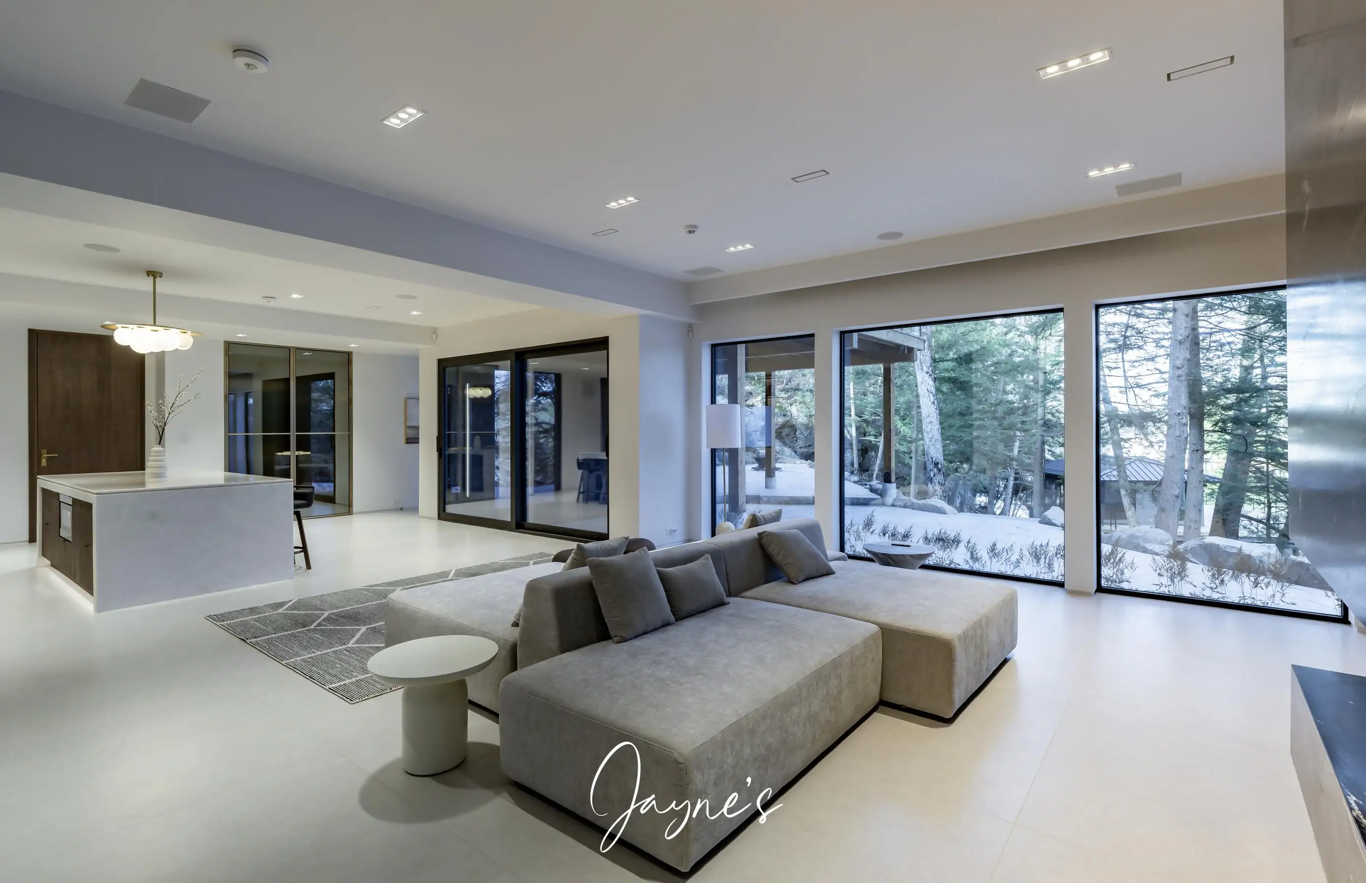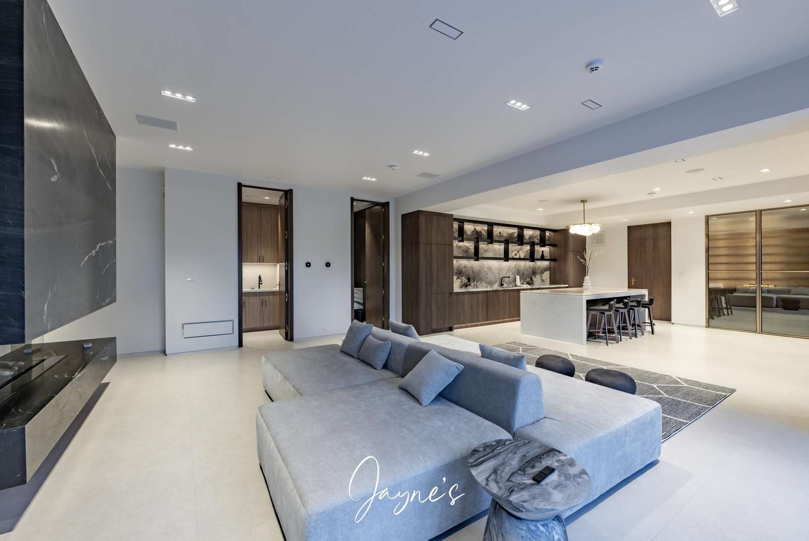 Spacious open concept with gas fireplace, 4 double seater lounges, walkout to patio, wet bar with fridge, stone counter top island with seating for 5