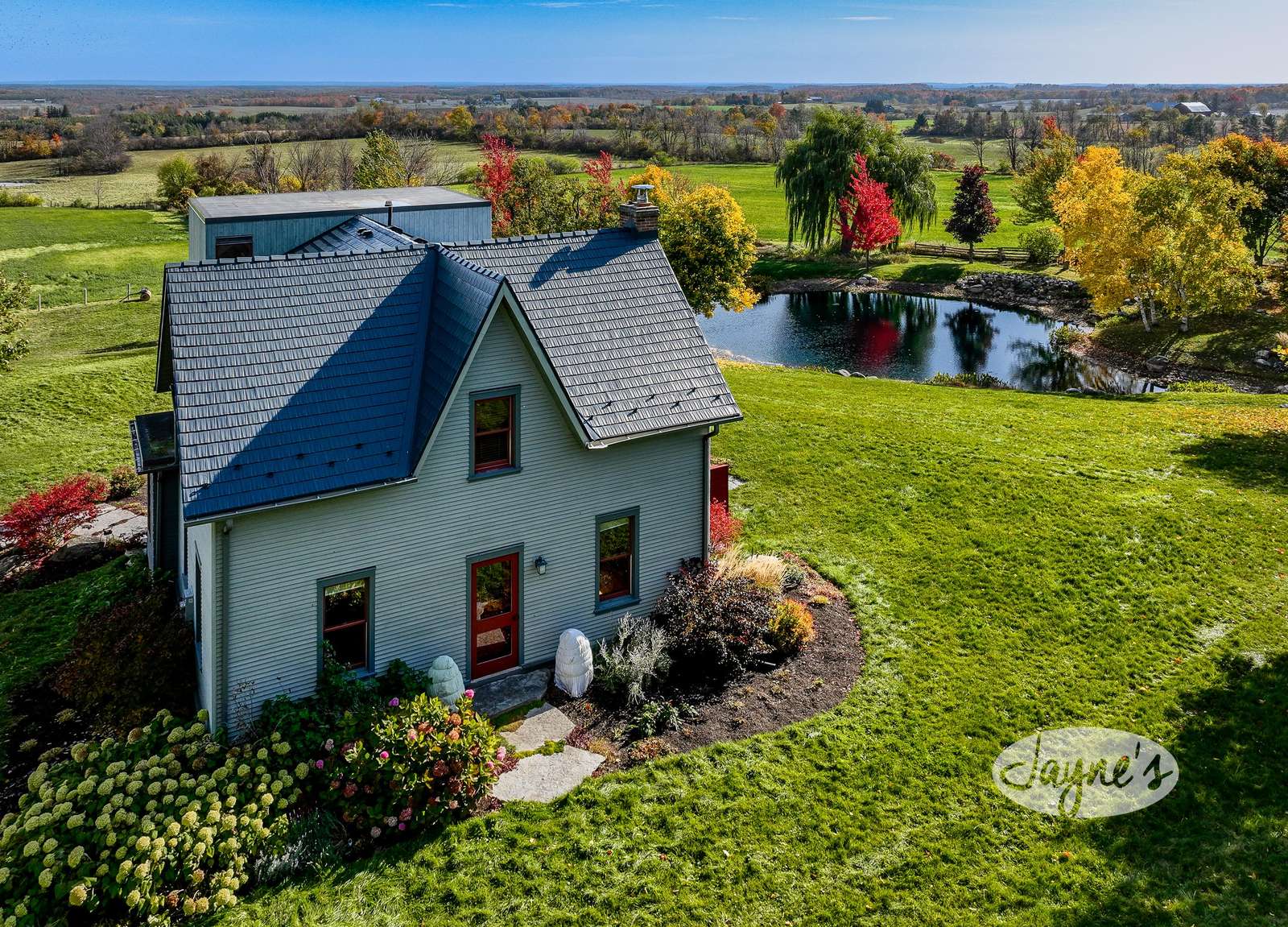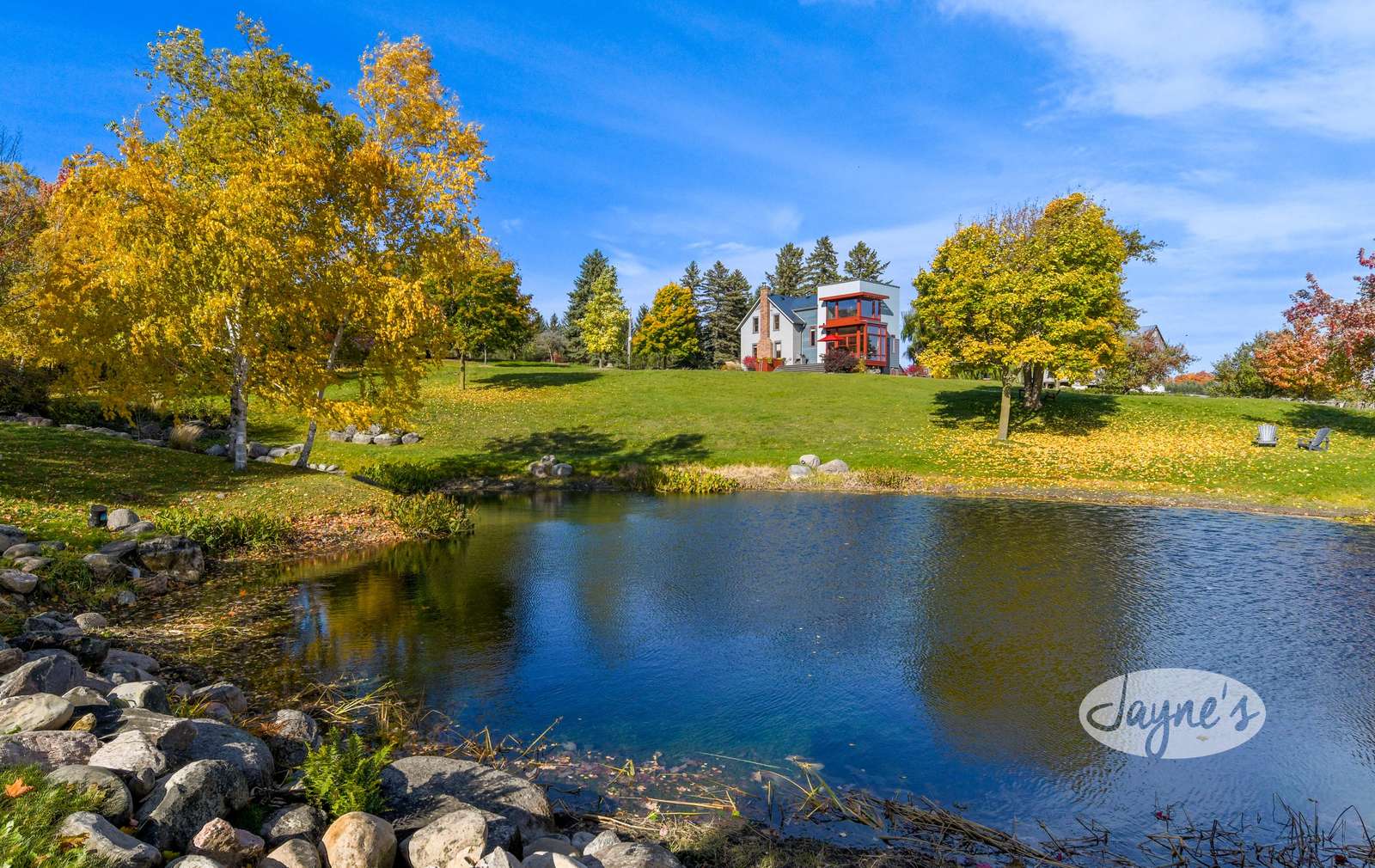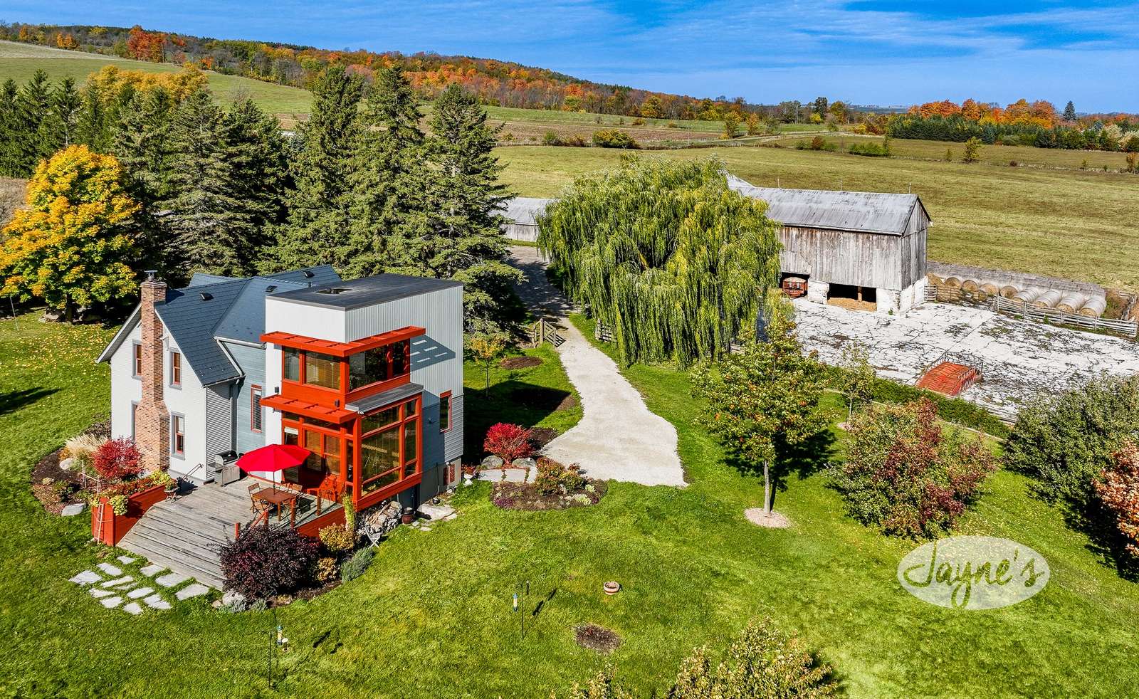 This charming and unique winter retreat rests on 25 acres of rolling hills and scenic ridges sheltered on one side by mature maples and spruce. Be ready to be captivated by this renovated century old farmhouse with a glass and wood addition designed to bring the spectacular outside in and it does just that. The home is completely private from the road and neighbours. Driving down the driveway one first comes upon a barn, followed by a turn at which point the home is suddenly in view. A welcoming deck with glass railings allows for an unobstructed expansive south and east view of the rolling country side and large pond.
