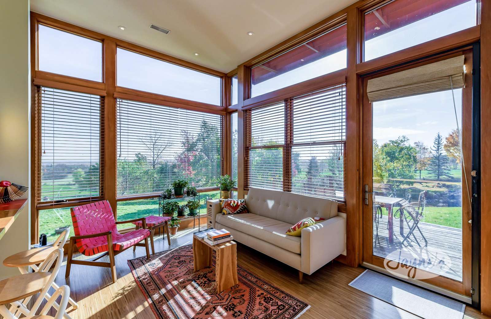 Comfortable sofa and chair. Floor to ceiling east and south facing windows with spectacular views bringing the outside in. Walk out to deck.