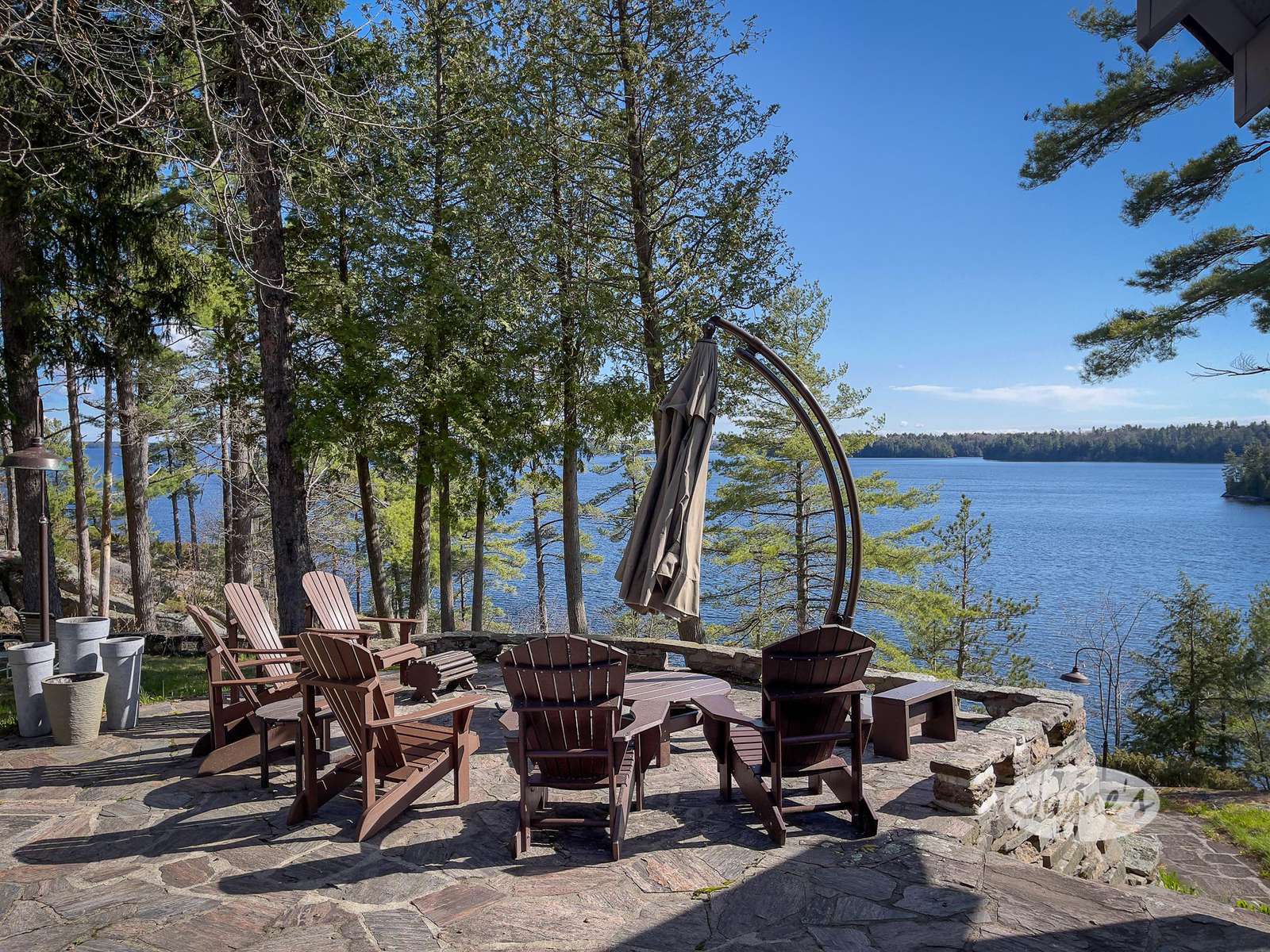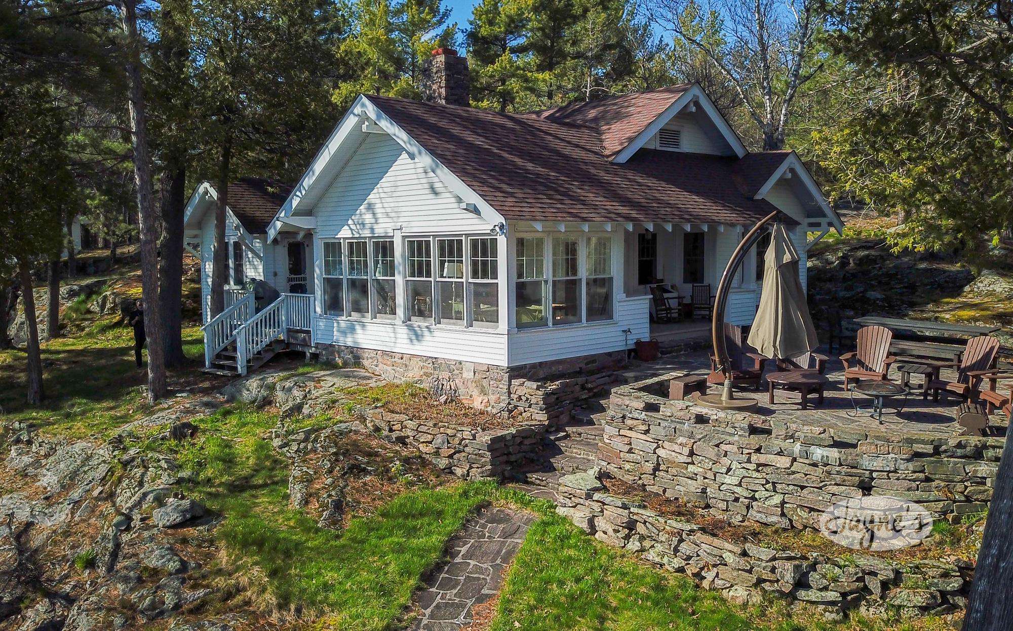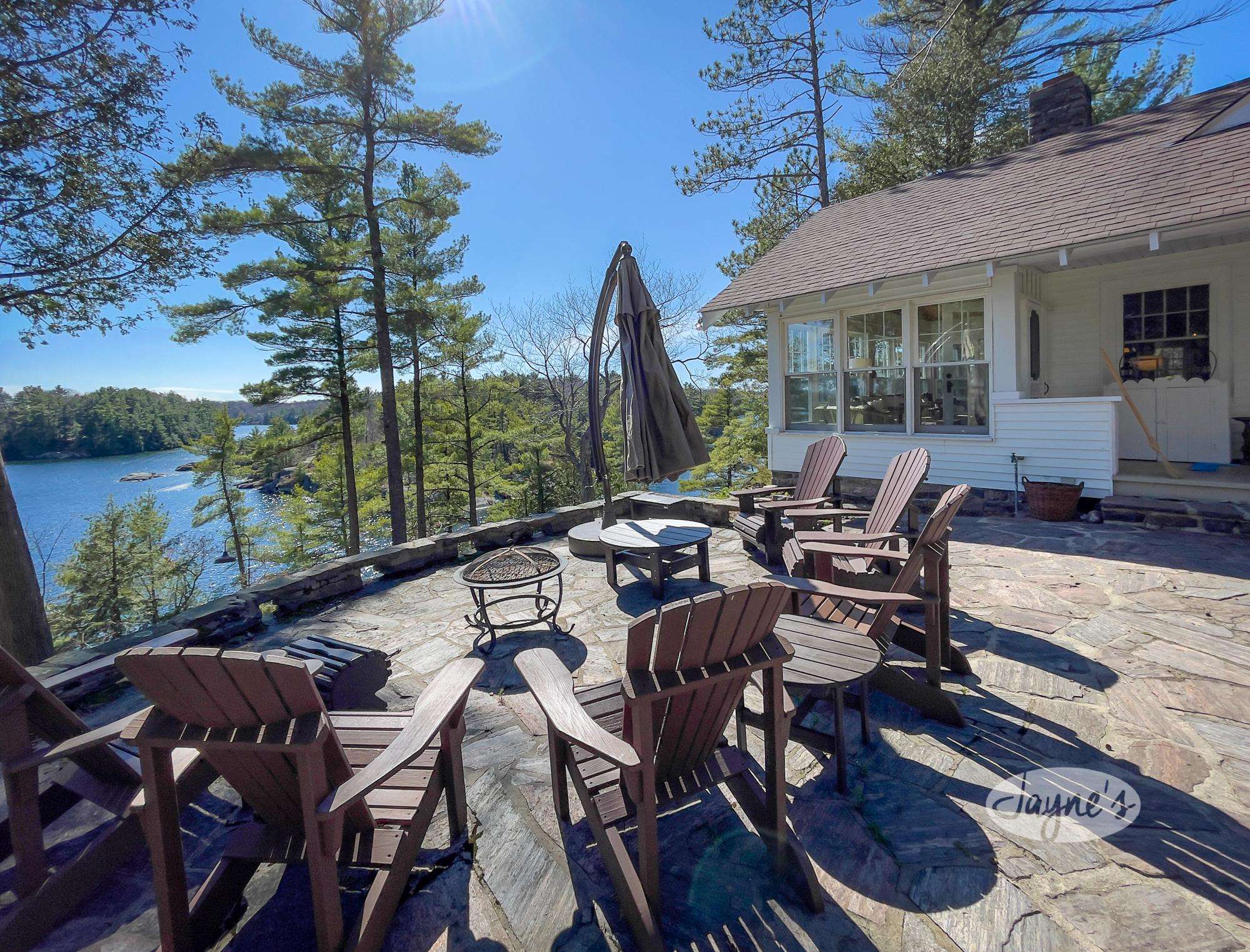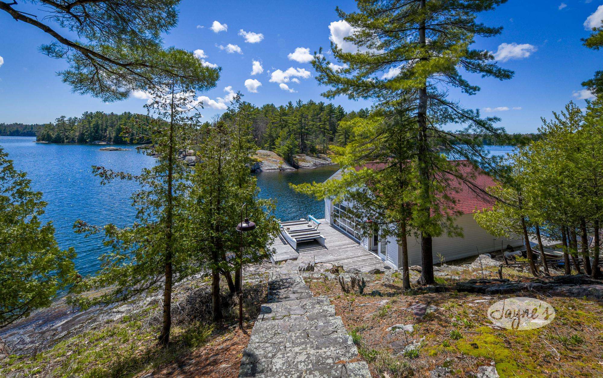 STERLING POINT has been enjoyed by generations of the same family for nearly 100 years. It sits at the end of a very quiet, private road. The circular drive makes for easy in and out access. With parking for up to six cars there is plenty of space for you and your extended family or friends. As you make your way to the main house, you can't help but get distracted by the incredible view of Lake Joseph. At the side of the main house is a stone terrace with a sitting area and an umbrella to protect from too much sun. A dining table and benches allow for easy outdoor dining on a beautiful day. This property sits high up from the waters edge providing a panoramic view and plenty of breezes off the lake. This area up top is flat and level. Enjoy star gazing and roasting marshmallows with the kids around the fire pit in the evenings. To the other side of the main house and parking area are two guest houses/bunkies, both very private and a good distance from the main house if you are entertaining guests, extended family or for the kids to have their own space. Take the stone steps or inclinator down to the new boathouse and expansive dock. Here you will find a comfortable sitting area with beautiful new outdoor furniture to enjoy your days down at the water. There is a shallower rocky walk in or deep water diving off the dock. If you love to swim, you will enjoy these crystal clear waters!