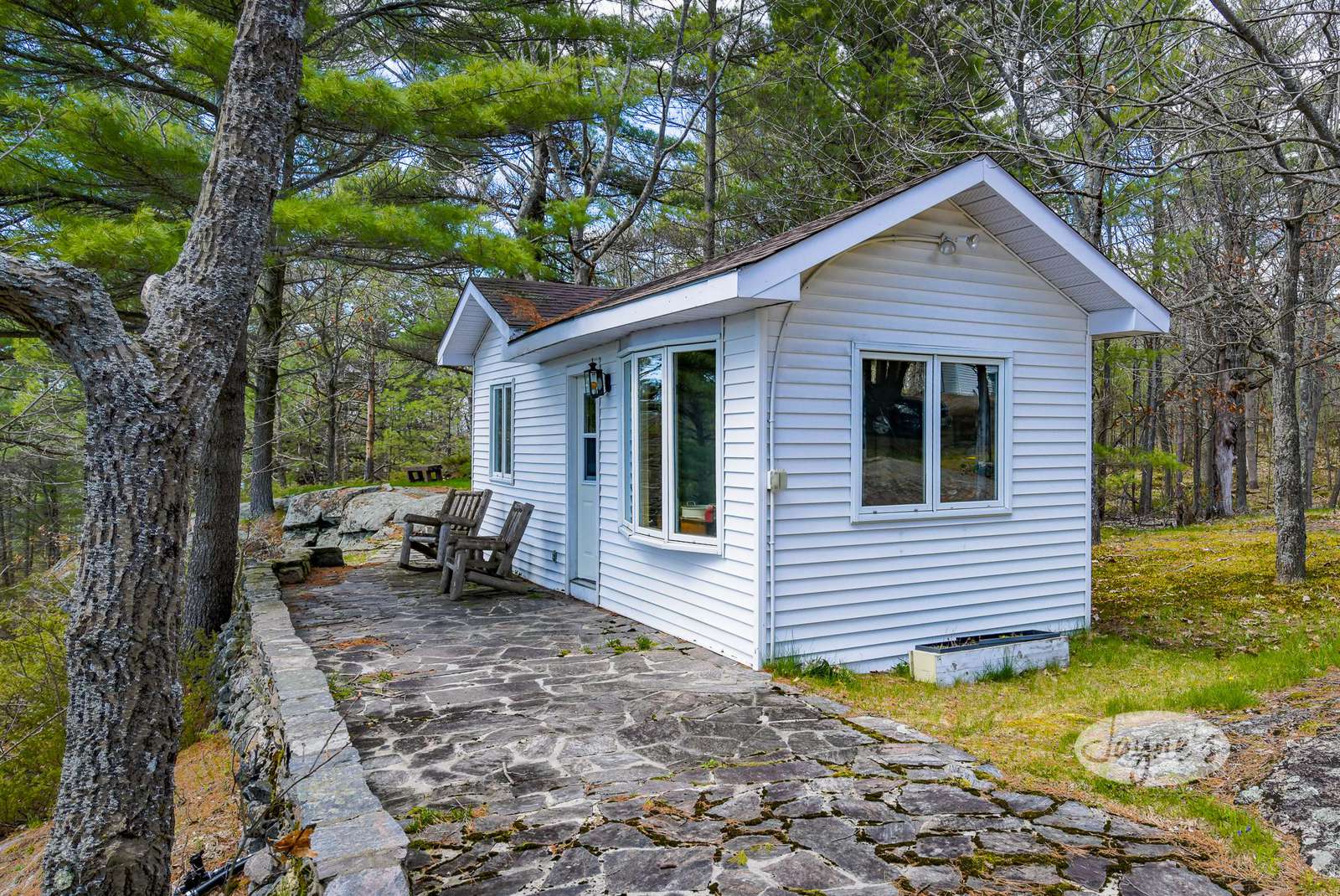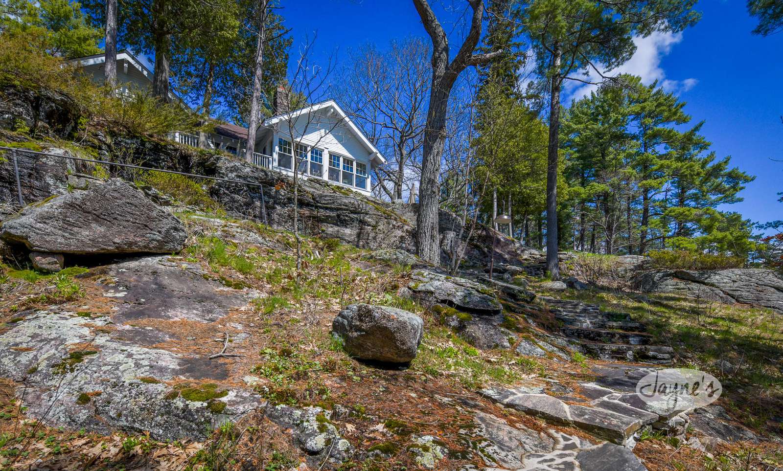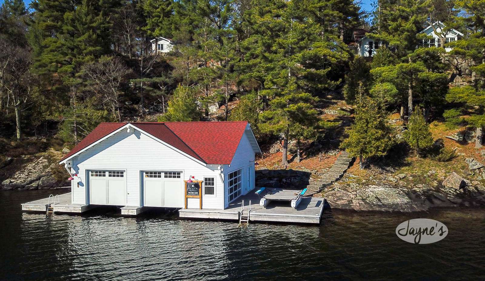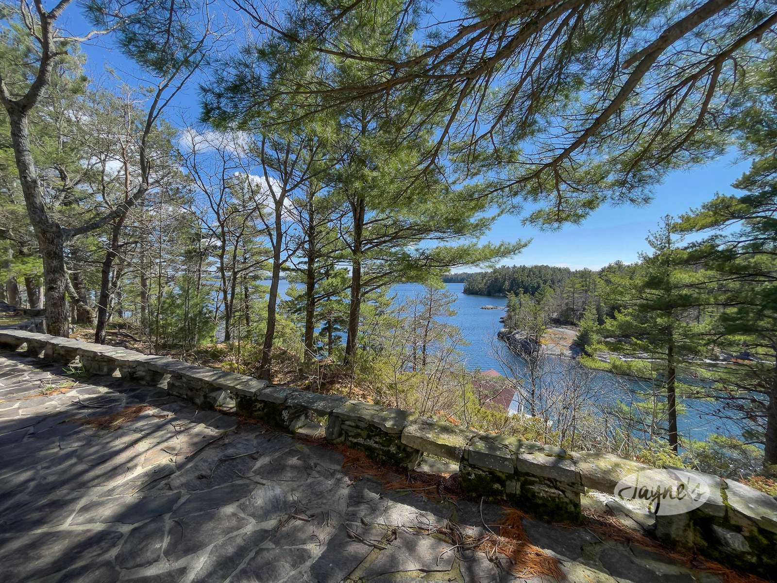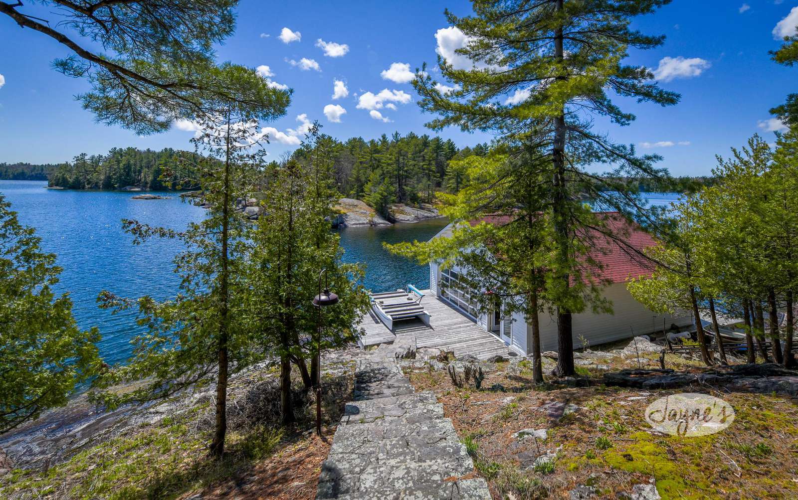 STERLING POINT has been enjoyed by generations of the same family for nearly 100 years. It sits at the end of a very quiet, private road. The circular drive makes for easy in and out access. With parking for up to six cars there is plenty of space for you and your extended family or friends. As you make your way to the main house, you can't help but get distracted by the incredible view of Lake Joseph. At the side of the main house is a stone terrace with a sitting area and an umbrella to protect from too much sun. A dining table and benches allow for easy outdoor dining on a beautiful day. This property sits high up from the waters edge providing a panoramic view and plenty of breezes off the lake. This area up top is flat and level. Enjoy star gazing and roasting marshmallows with the kids around the fire pit in the evenings. To the other side of the main house and parking area are two guest houses/bunkies, both very private and a good distance from the main house if you are entertaining guests, extended family or for the kids to have their own space. Take the stone steps or inclinator down to the new boathouse and expansive dock. Here you will find a comfortable sitting area with beautiful new outdoor furniture to enjoy your days down at the water. There is a shallower rocky walk in or deep water diving off the dock. If you love to swim, you will enjoy these crystal clear waters!