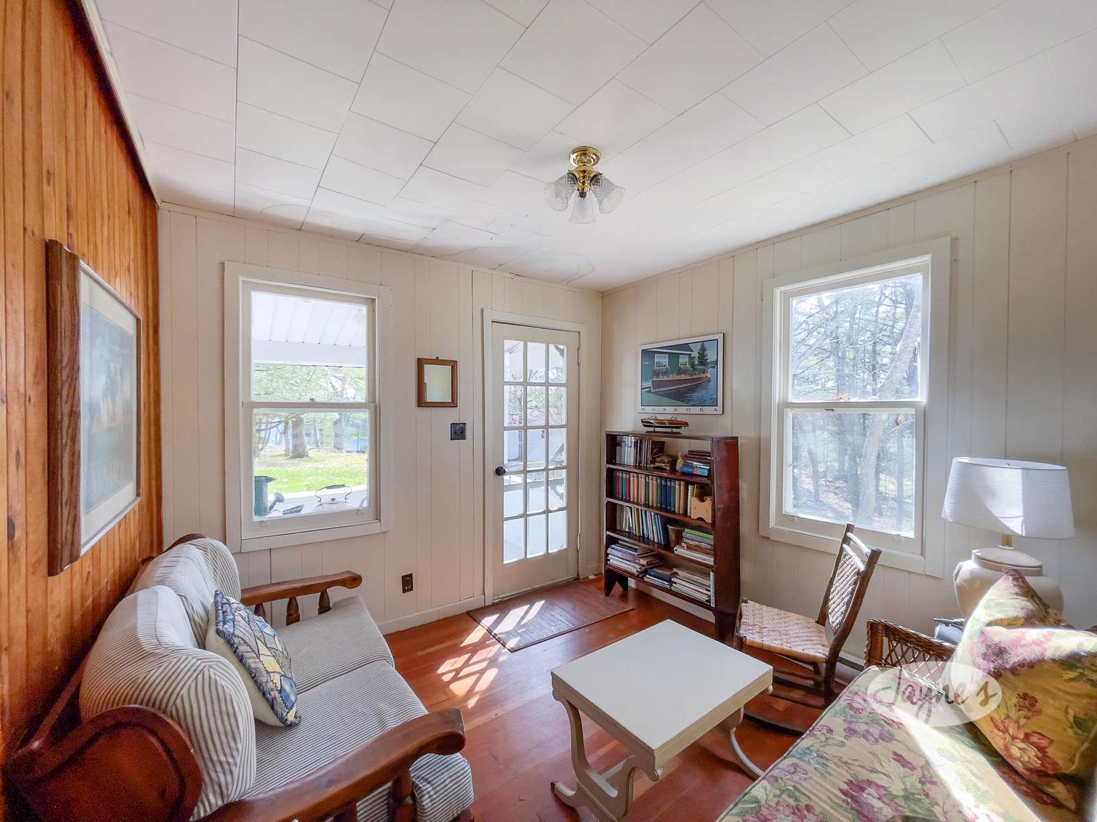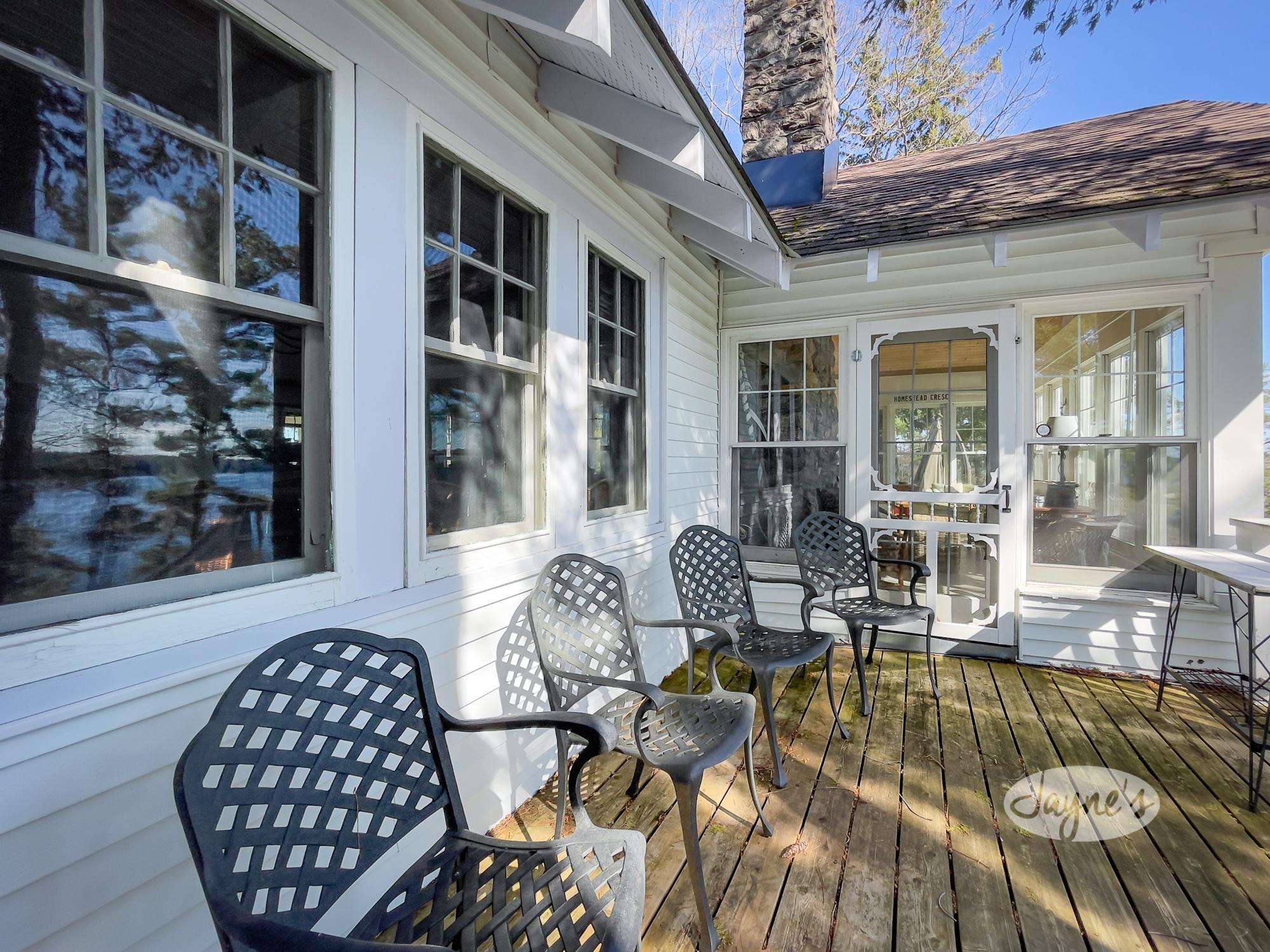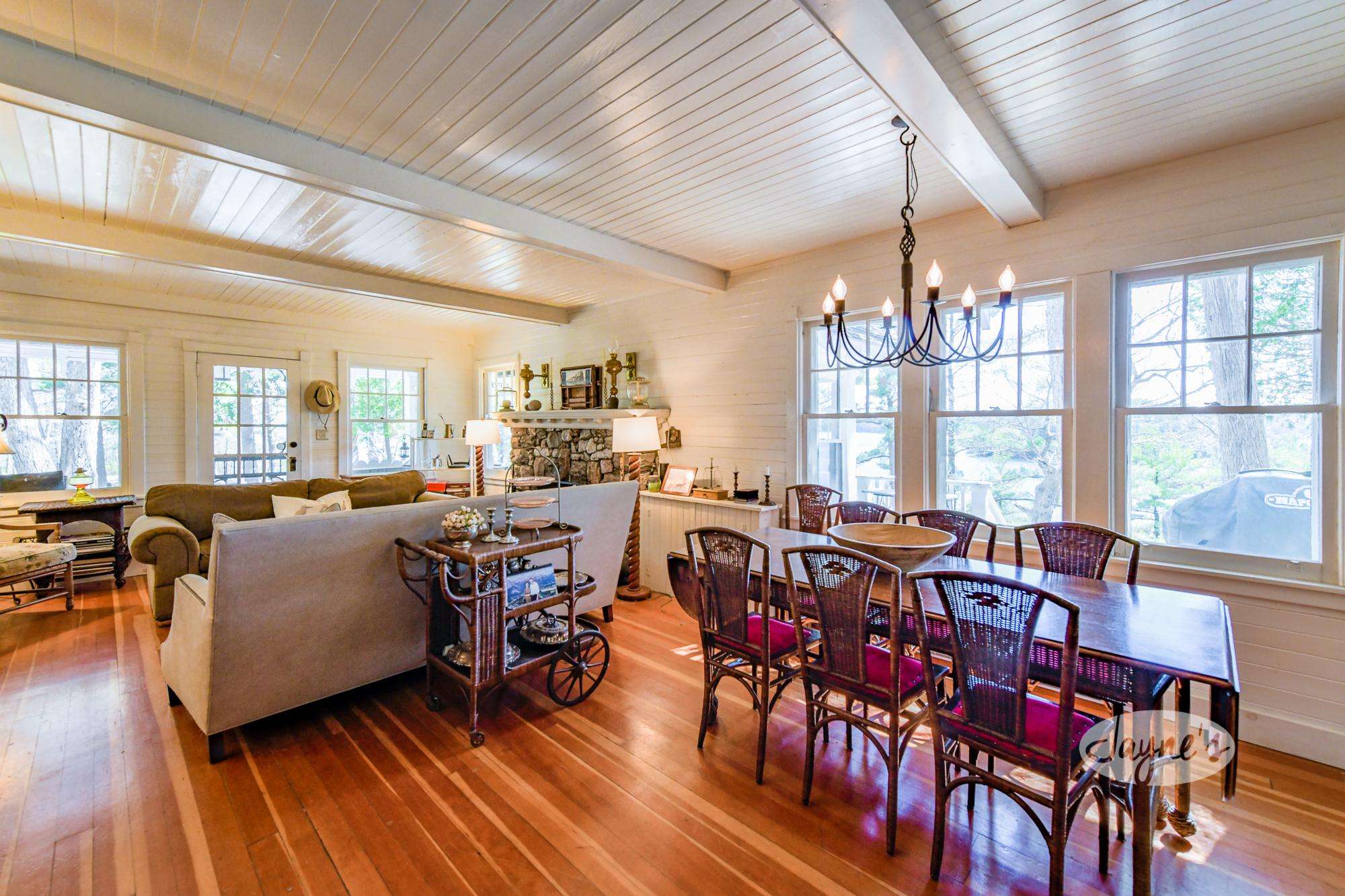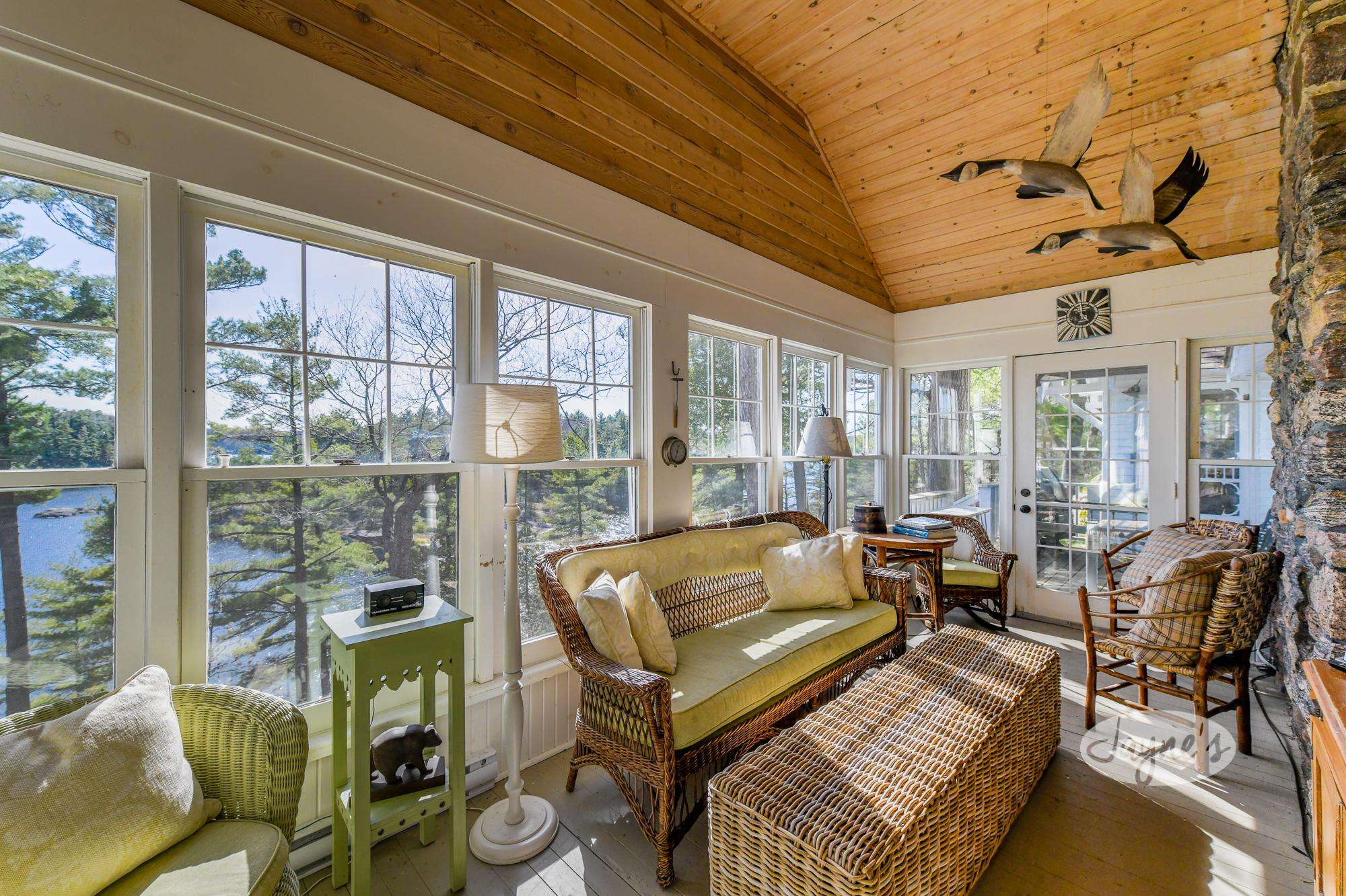 This Muskoka room looks out onto the lake and is a great place to enjoy the outdoors away from the bugs and the sun. With the large screen TV and original stone wall no matter where you sit in this room you will have the best seat in the house!