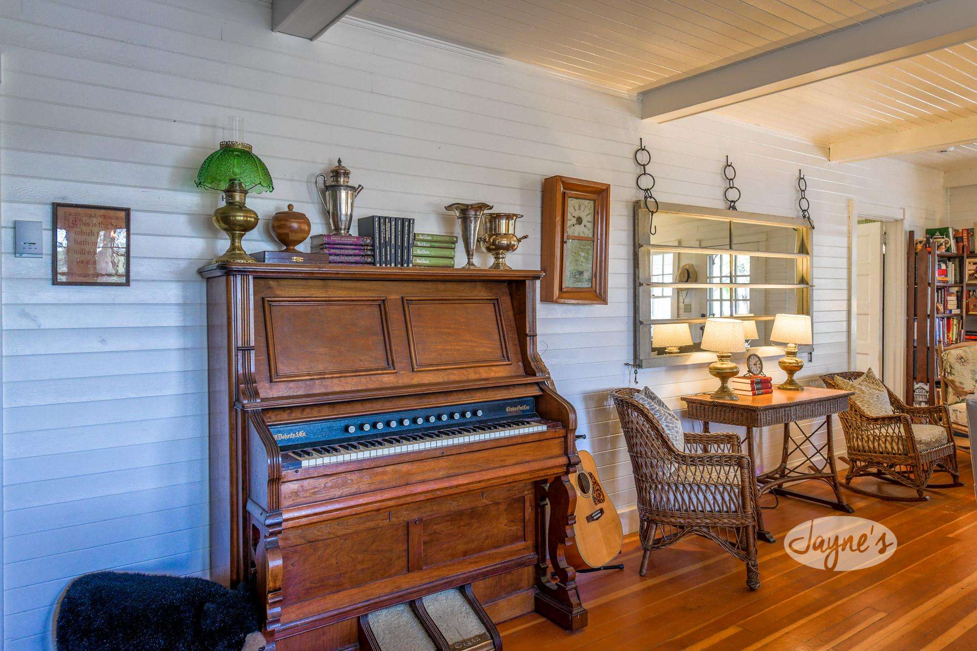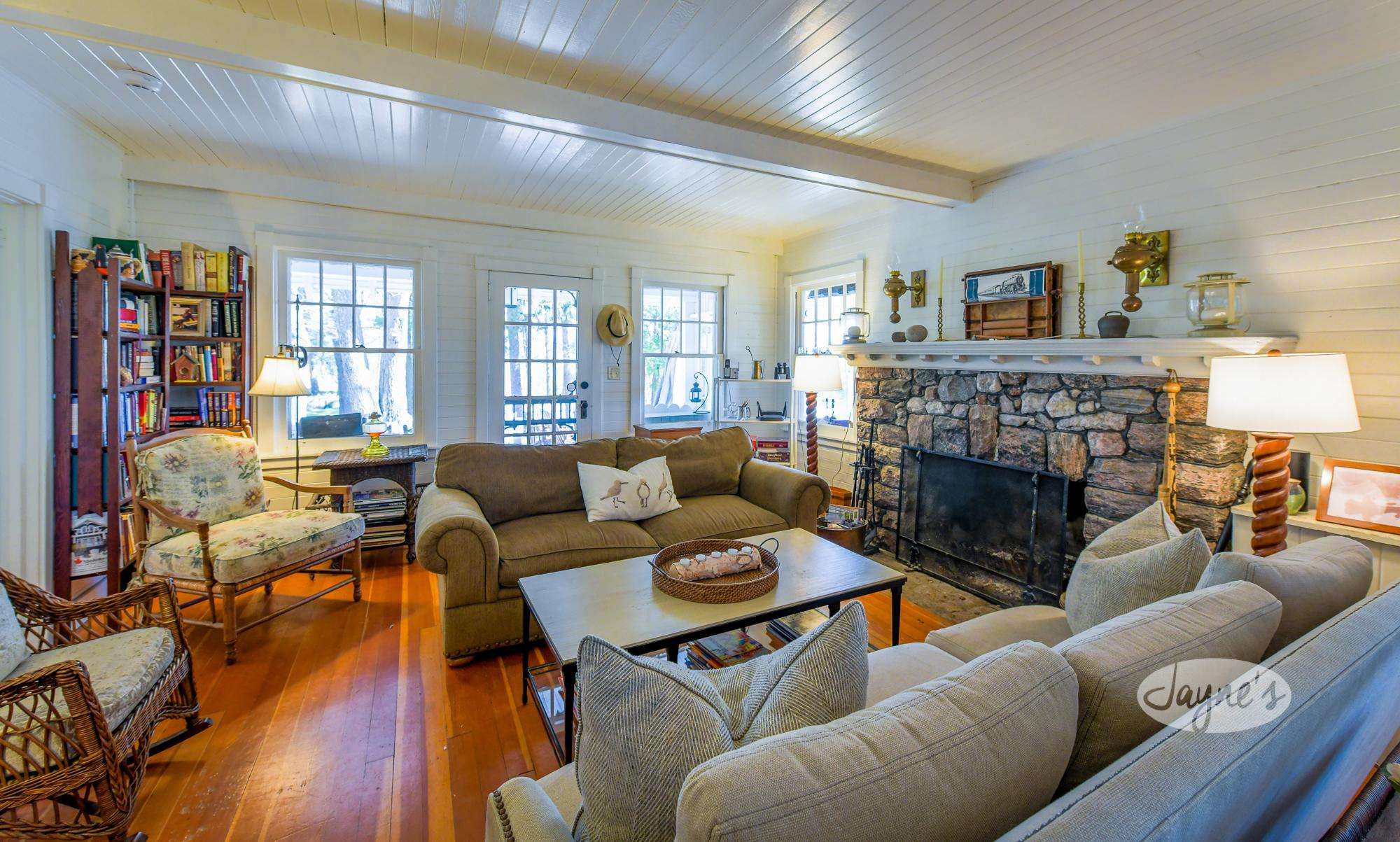 The living room has comfy seating and a wood burning fireplace to take the chill off on a cool summer night.