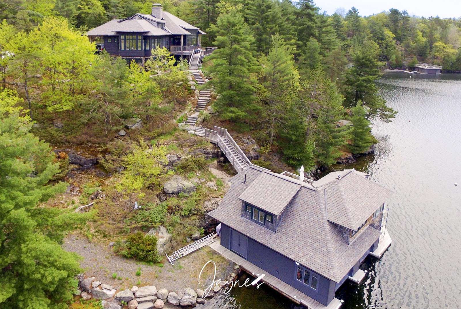 This gorgeous, sprawling cottage on the shores of Lake Joseph is designed for all to enjoy as a relaxing retreat, a 5-bedroom main cottage and 1-bedroom boathouse with spacious multi-level decks and southwestern exposure!