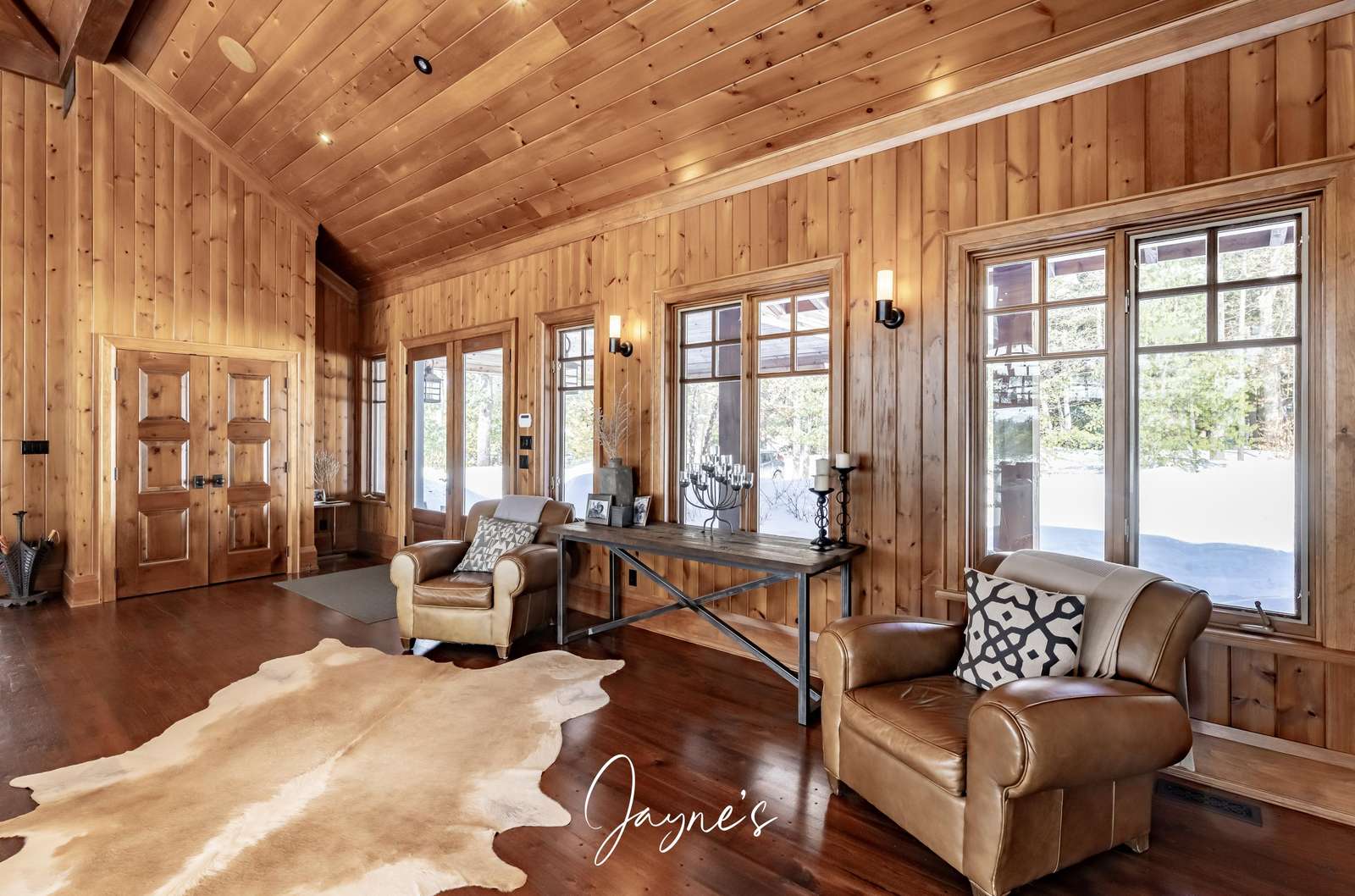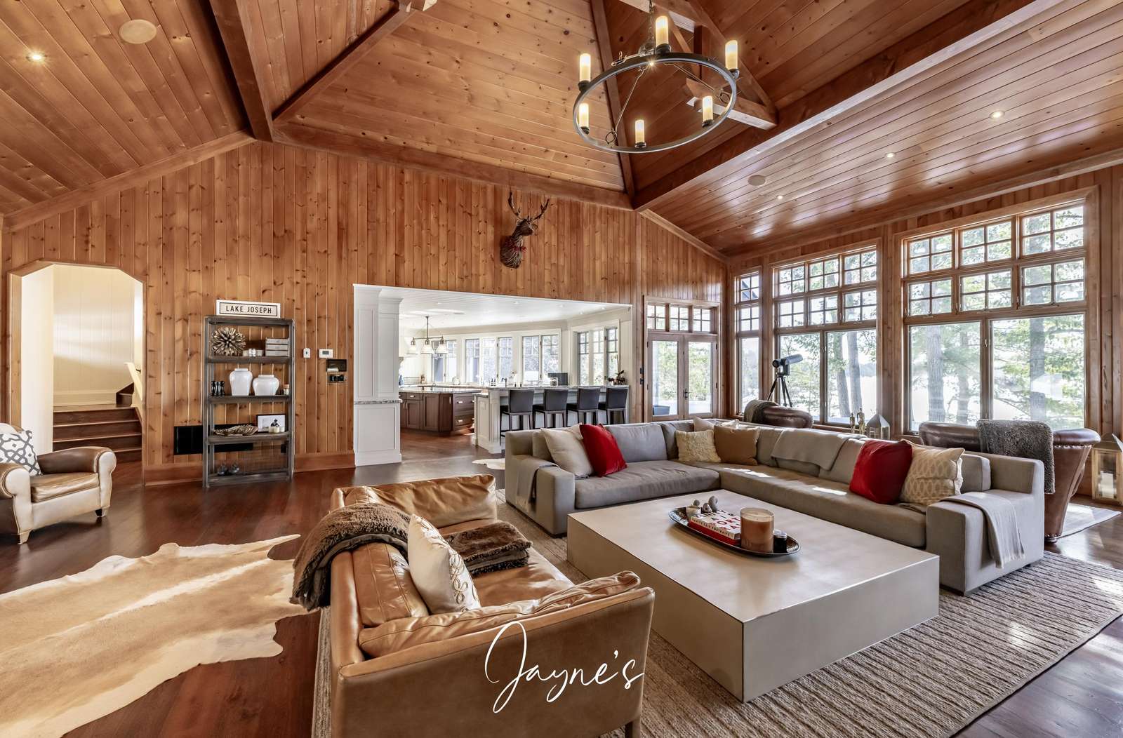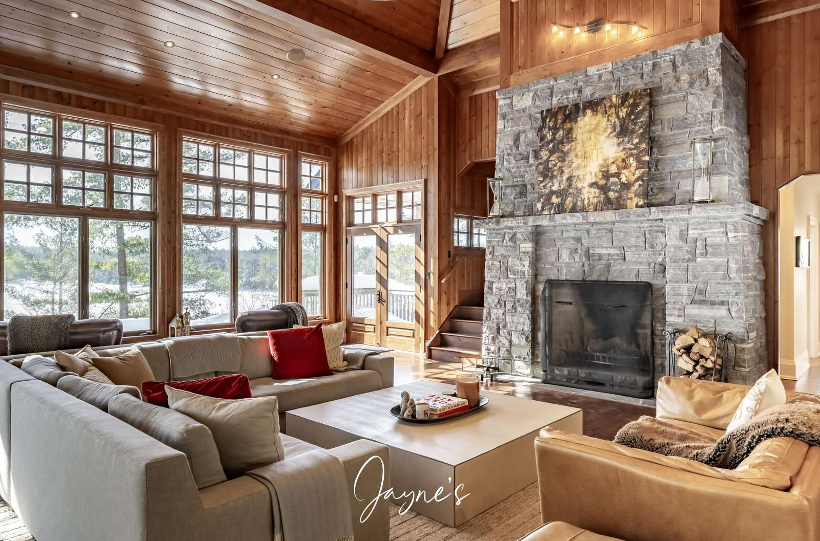 Double vaulted wooden ceiling, framed with floor to ceiling windows and a grand stone wood burning fireplace and lounge seating