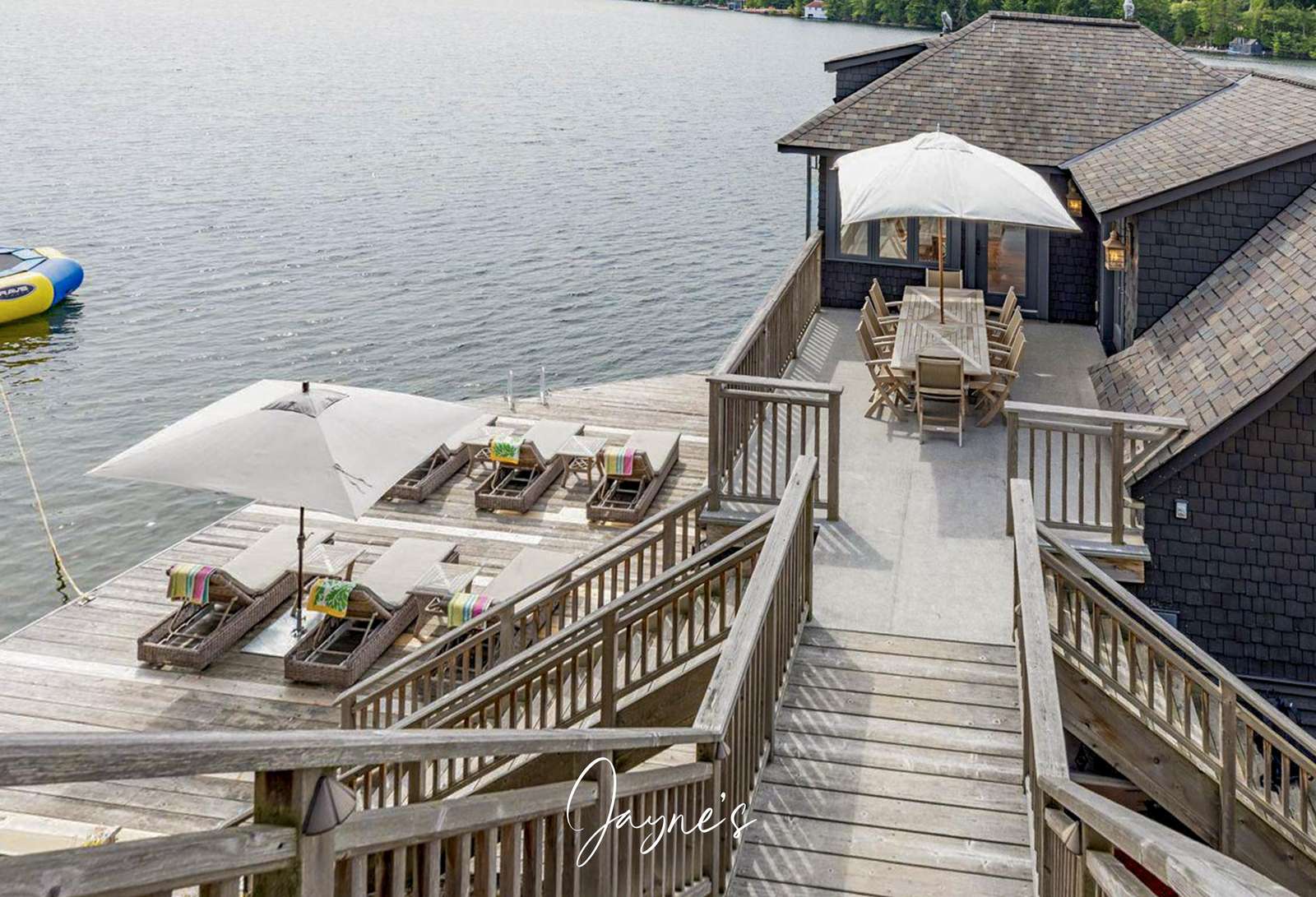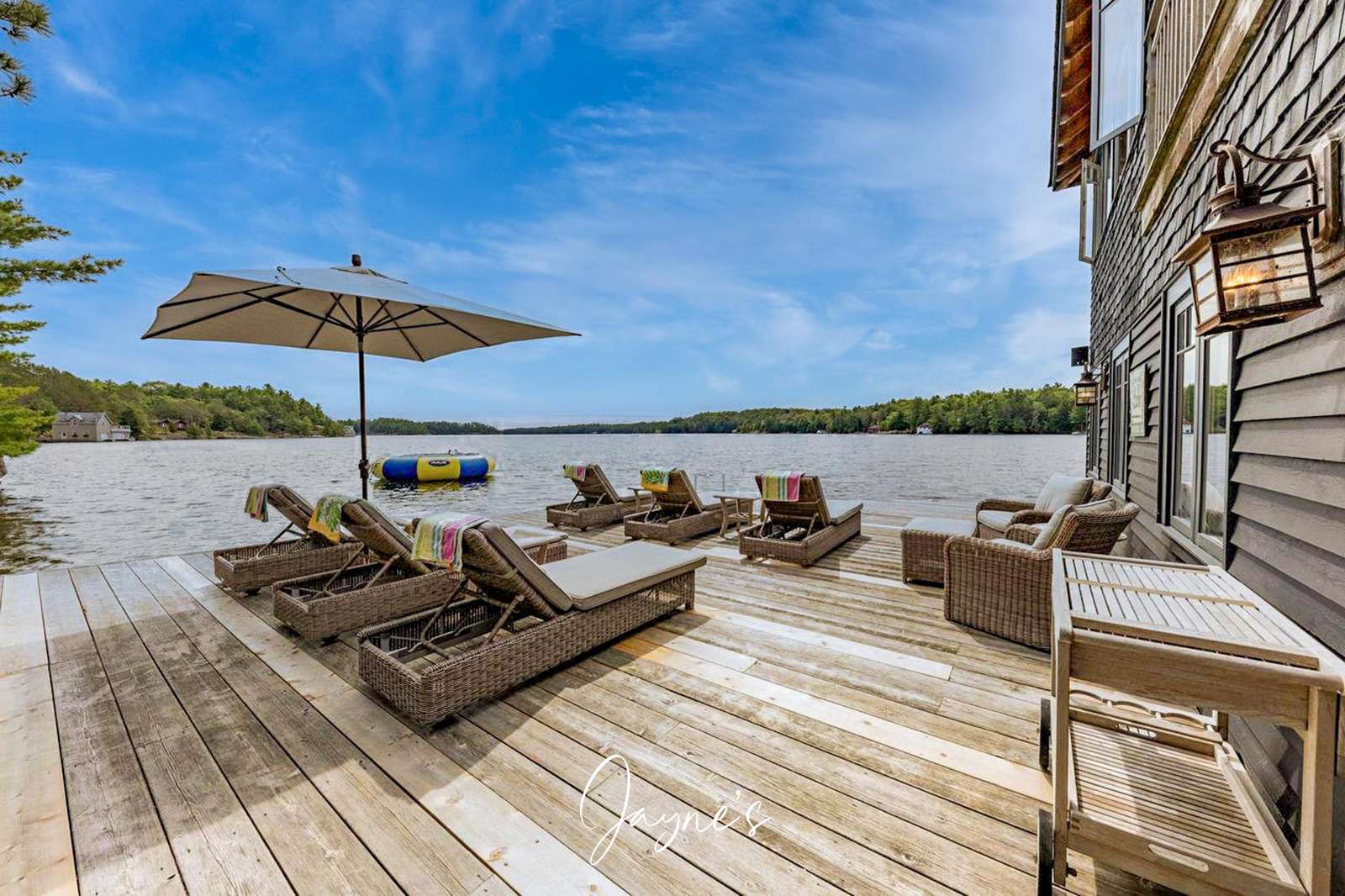 SUN KISSED BAY is a newly-built, traditional-meets-modern cottage on the shores of Lake Joseph, and is designed for all to enjoy as a relaxing retreat. This property features a private one bedroom, two-slip boathouse with multi-level docks, in addition to the five-bedroom main cottage with Southwestern exposure on the dock and veranda resulting in direct sunlight almost the entire day. The Muskoka room off the main cottage is tastefully furnished with outdoor lounge furniture and dining for 6 to enjoy the exquisite sunsets on Lake Joseph. Follow the beautifully landscaped gardens and stone stairway down to the water's edge, where guests will find a spacious 1000 sq. ft swim dock and boathouse. There is a fairly long set of stairs to get to the dock, but since there is a boathouse, you can eat lunch and have all the comforts needed down at the dock for the day!