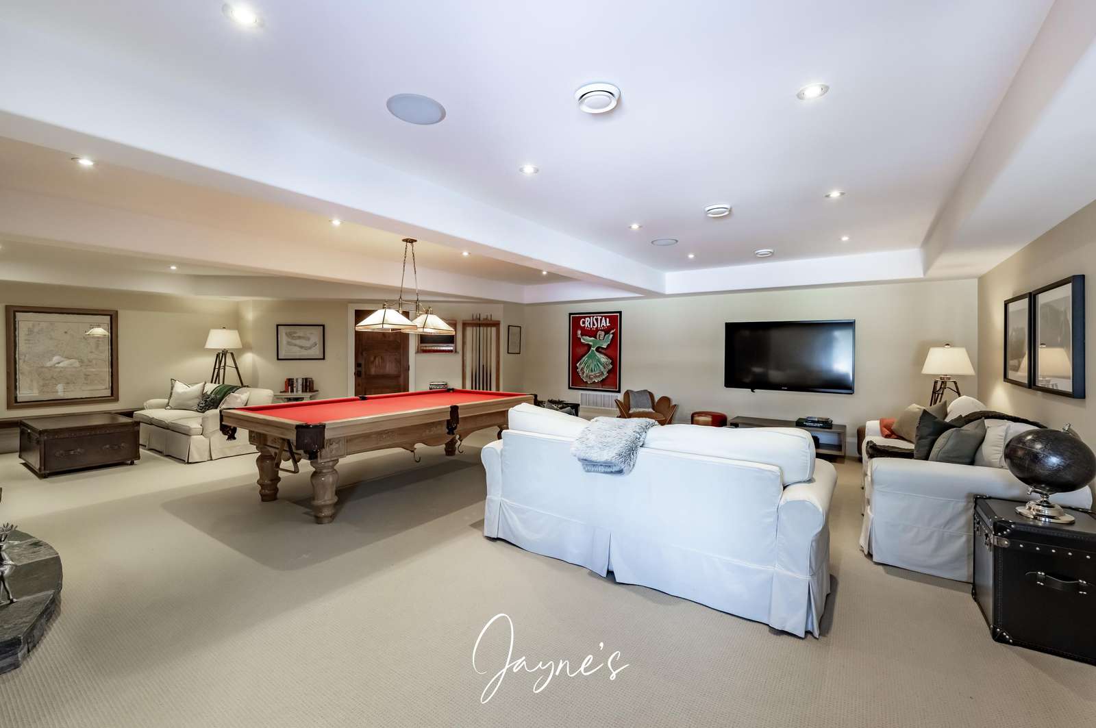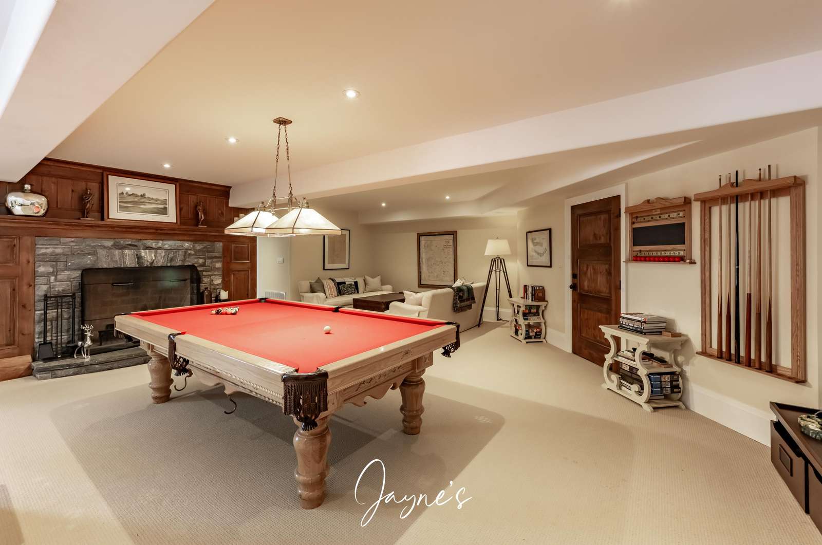 Large games room with pool table and two seating areas with a large TV and wood burning fireplace