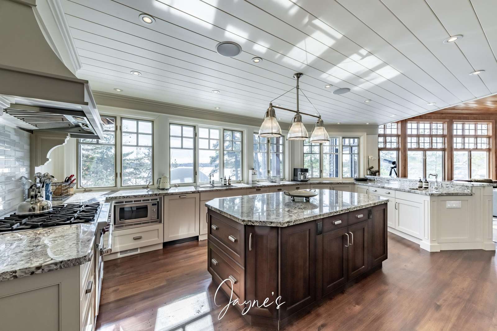 Spacious dining for 12 guests sits just off the kitchen, and walkout to the Muskoka room