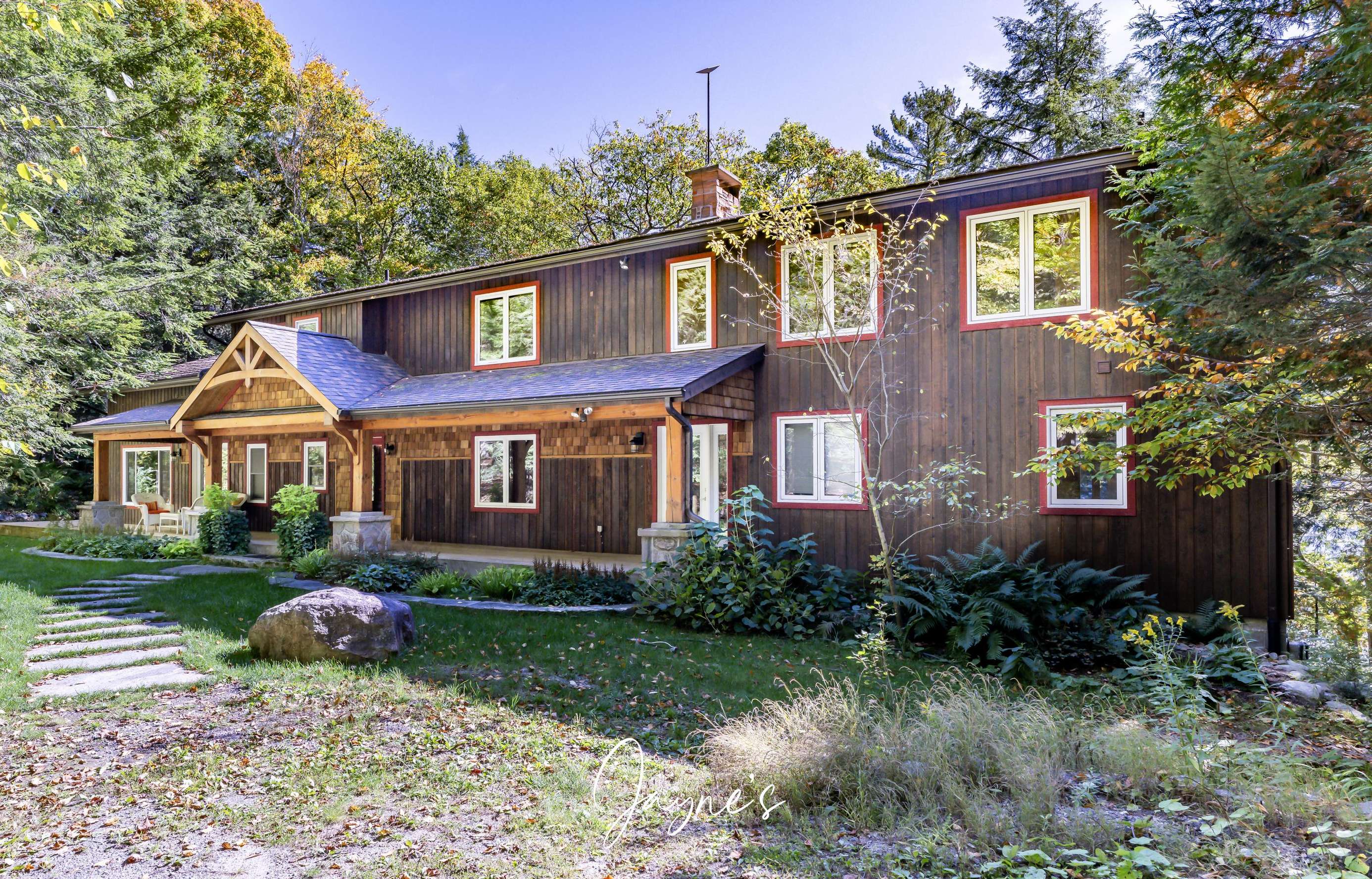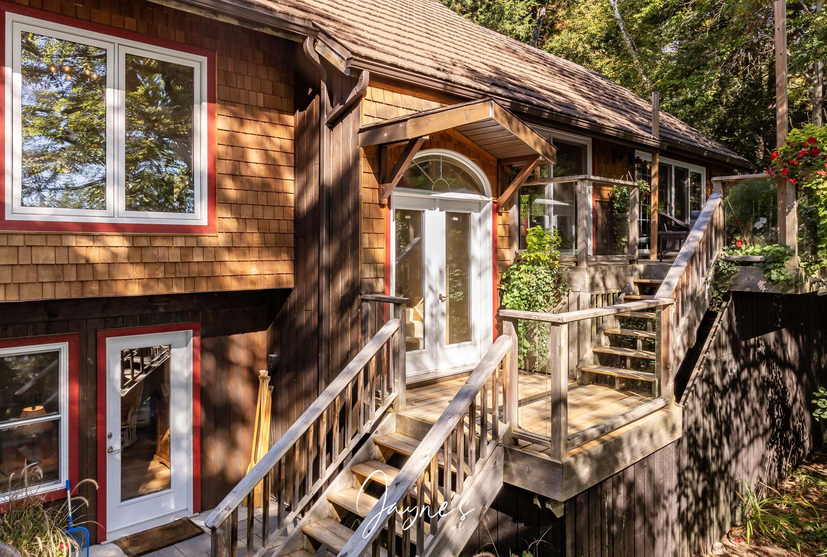 SUNNYVIEW COTTAGE This stunning Lake Rosseau cottage offers five bedrooms and bathrooms, with a thoughtfully designed layout featuring separate upper and lower levels for ample space and privacy. The spacious upper deck provides outdoor seating and dining, perfect for enjoying the scenic views, while the lower patio includes a BBQ and hot tub for ultimate relaxation. Steps guide you to the dock, where water toys, boat docking facilities, and seating areas await, making it an ideal retreat for enjoying sunny days on the water.