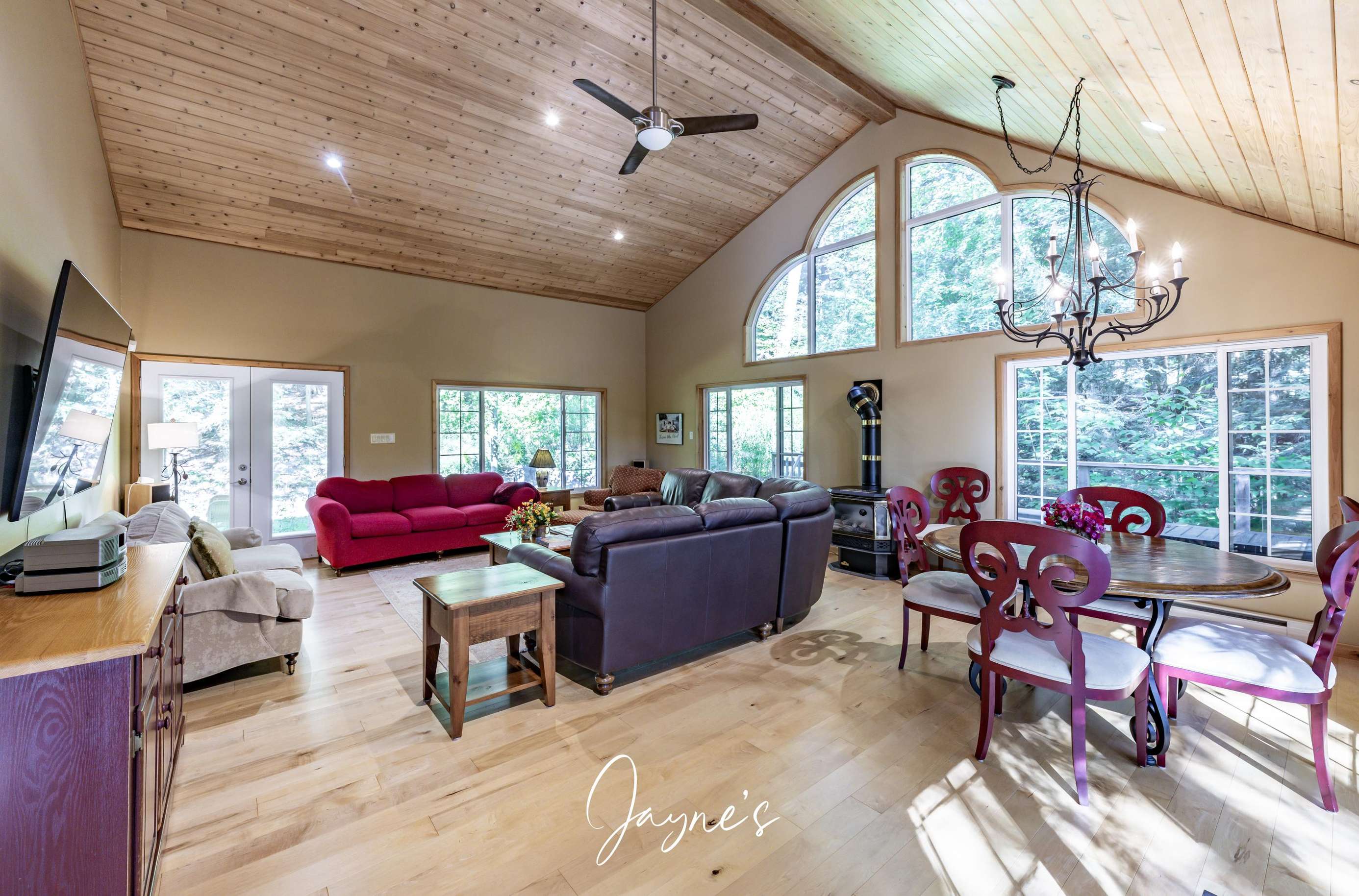 Spacious entertainment area with a curved sectional, 2 3-seater sofas, chair and ottoman, 85" TV, table with 6 chairs and a walkout to the deck