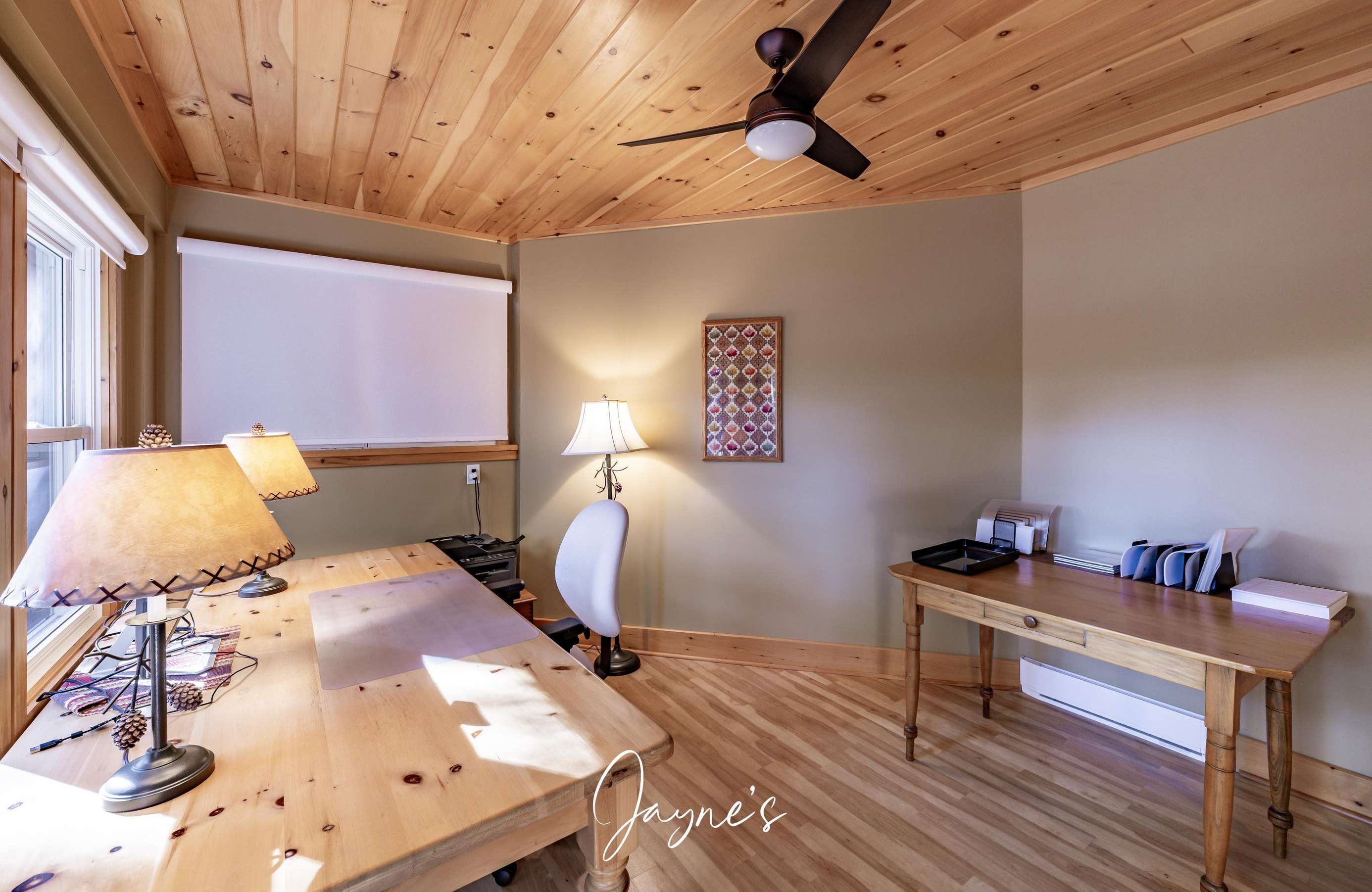 Lake view office with desk and walkout to patio